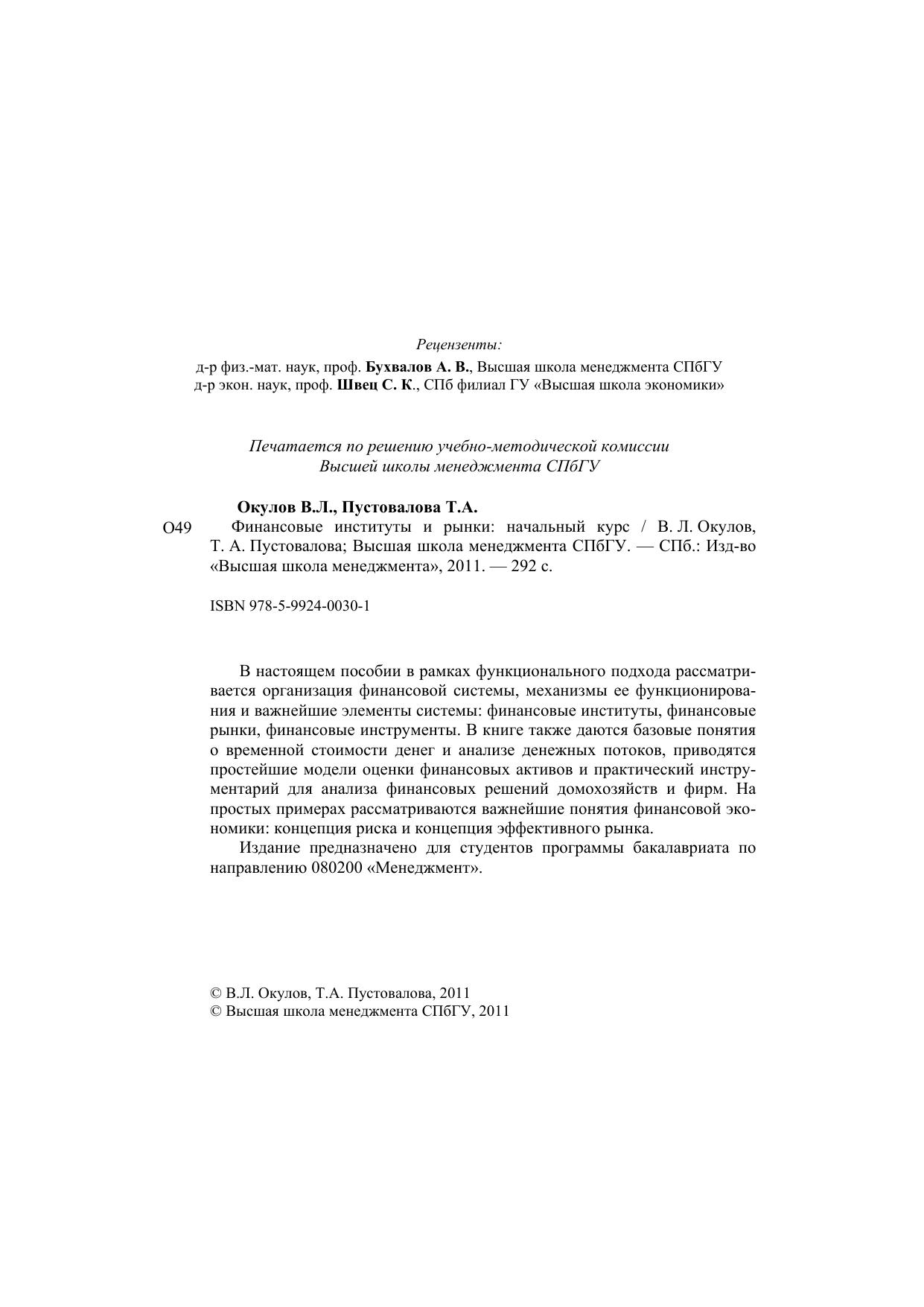 В настоящем пособии в рамках функционального подхода рассматривается организация финансовой системы, механизмы ее функционирования и важнейшие элементы системы: финансовые институты, финансовые рынки, финансовые инструменты. В книге также даются базовые понятия о временной стоимости денег и анализе денежных потоков, приводятся простейшие модели оценки финансовых активов и практический инструментарий для анализа финансовых решений домохозяйств и фирм. На простых примерах рассматриваются важнейшие понятия финансовой экономики: концепция риска и концепция эффективного рынка. Издание предназначено для студентов программы бакалавриата по направлению 080200 «Менеджмент».