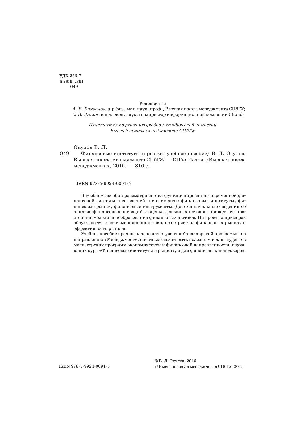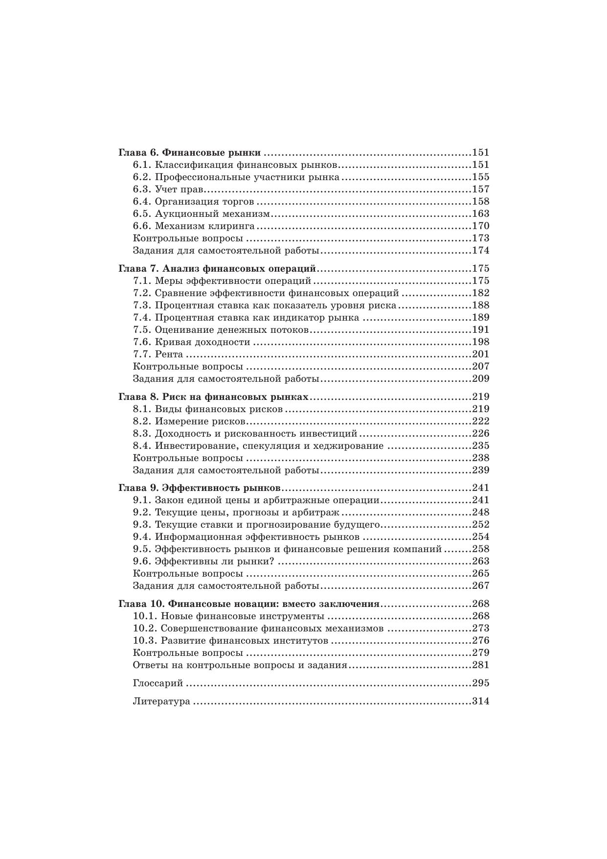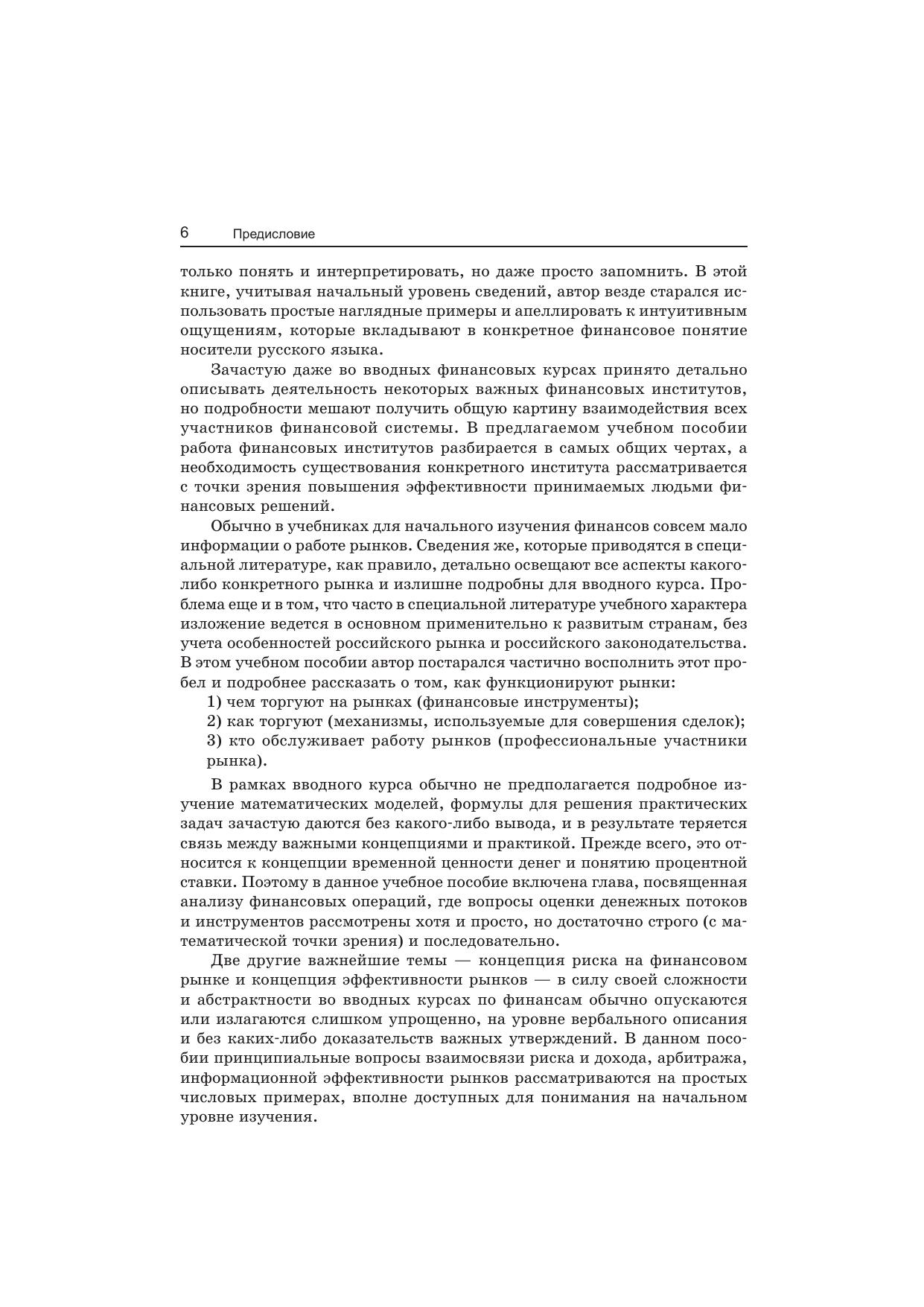 В учебном пособии рассматриваются функционирование современной финансовой системы и ее важнейшие элементы: финансовые институты, финансовые рынки, финансовые инструменты. Даются начальные сведения об анализе финансовых операций и оценке денежных потоков, приводятся простейшие модели ценообразования финансовых активов. На простых примерах обсуждаются ключевые концепции финансов: риск на финансовых рынках и эффективность рынков. Учебное пособие предназначено для студентов бакалаврской программы по направлению «Менеджмент»; оно также может быть полезным и для студентов магистерских программ экономической и финансовой направленности, изучающих курс «Финансовые институты и рынки», и для финансовых менеджеров.