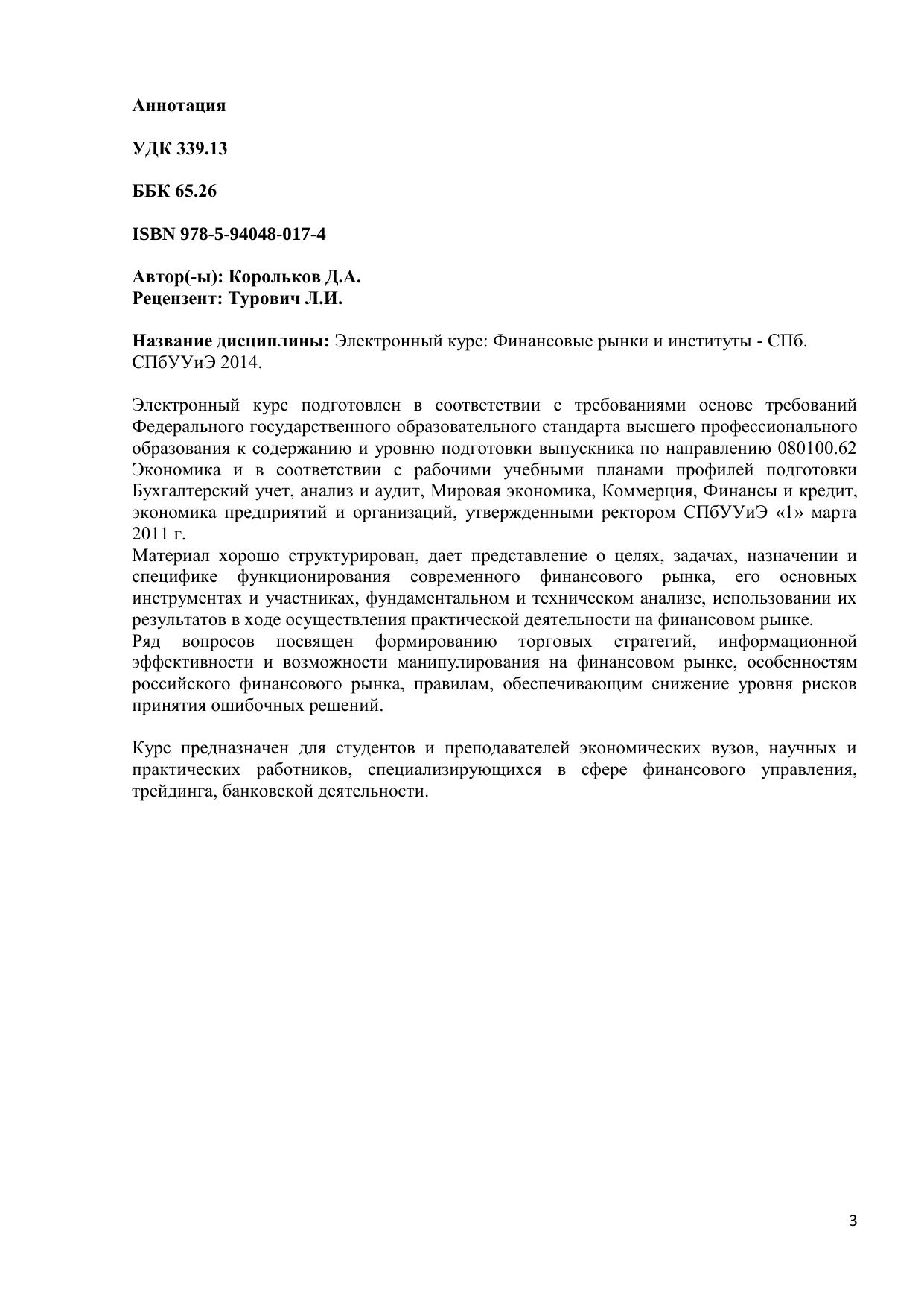 Электронный курс подготовлен в соответствии с требованиями основе требований Федерального государственного образовательного стандарта высшего профессионального образования к содержанию и уровню подготовки выпускника по направлению 080100.62 Экономика и в соответствии с рабочими учебными планами профилей подготовки Бухгалтерский учет, анализ и аудит, Мировая экономика, Коммерция, Финансы и кредит, экономика предприятий и организаций, утвержденными ректором СПбУУиЭ «1» марта 2011 г. Материал хорошо структурирован, дает представление о целях, задачах, назначении и специфике функционирования современного финансового рынка, его основных инструментах и участниках, фундаментальном и техническом анализе, использовании их результатов в ходе осуществления практической деятельности на финансовом рынке. Ряд вопросов посвящен формированию торговых стратегий, информационной эффективности и возможности манипулирования на финансовом рынке, особенностям российского финансового рынка, правилам, обеспечивающим снижение уровня рисков принятия ошибочных решений. Курс предназначен для студентов и преподавателей экономических вузов, научных и практических работников, специализирующихся в сфере финансового управления, трейдинга, банковской деятельности.