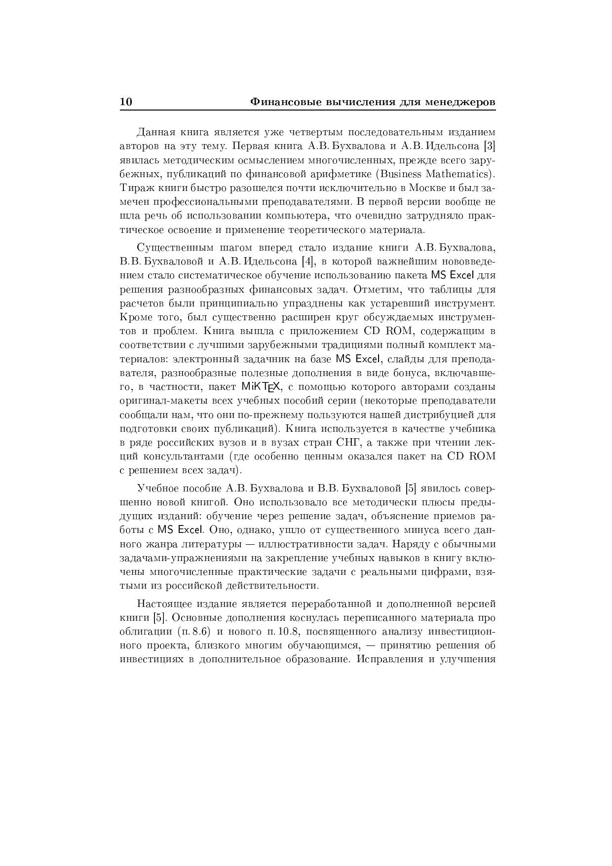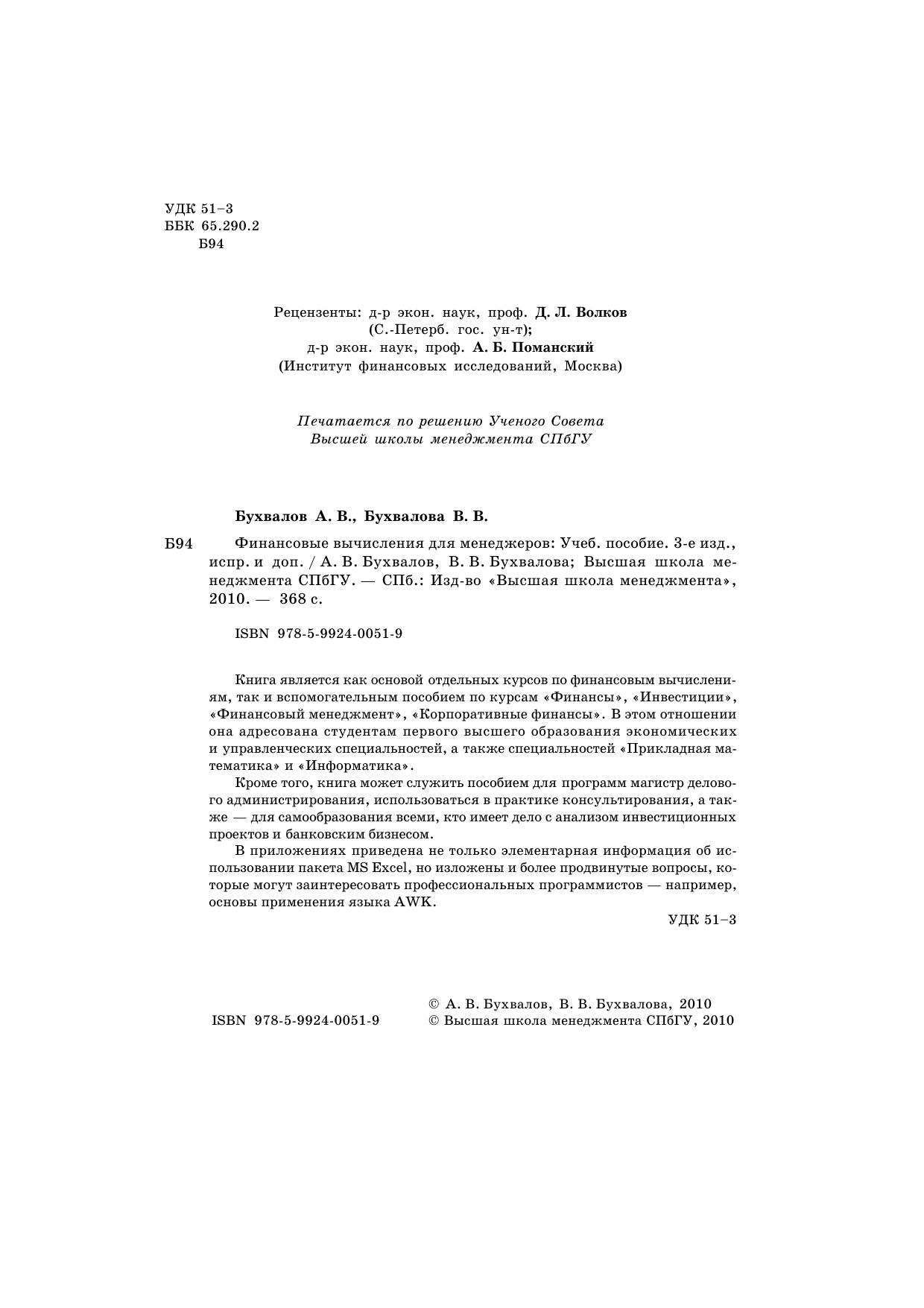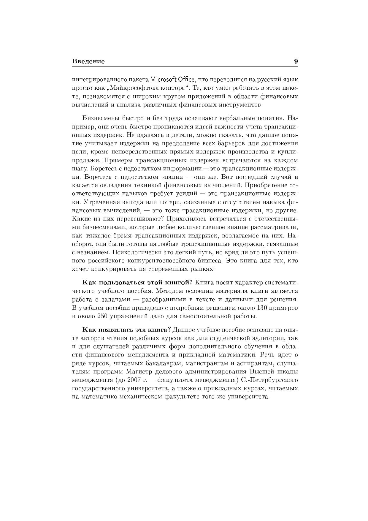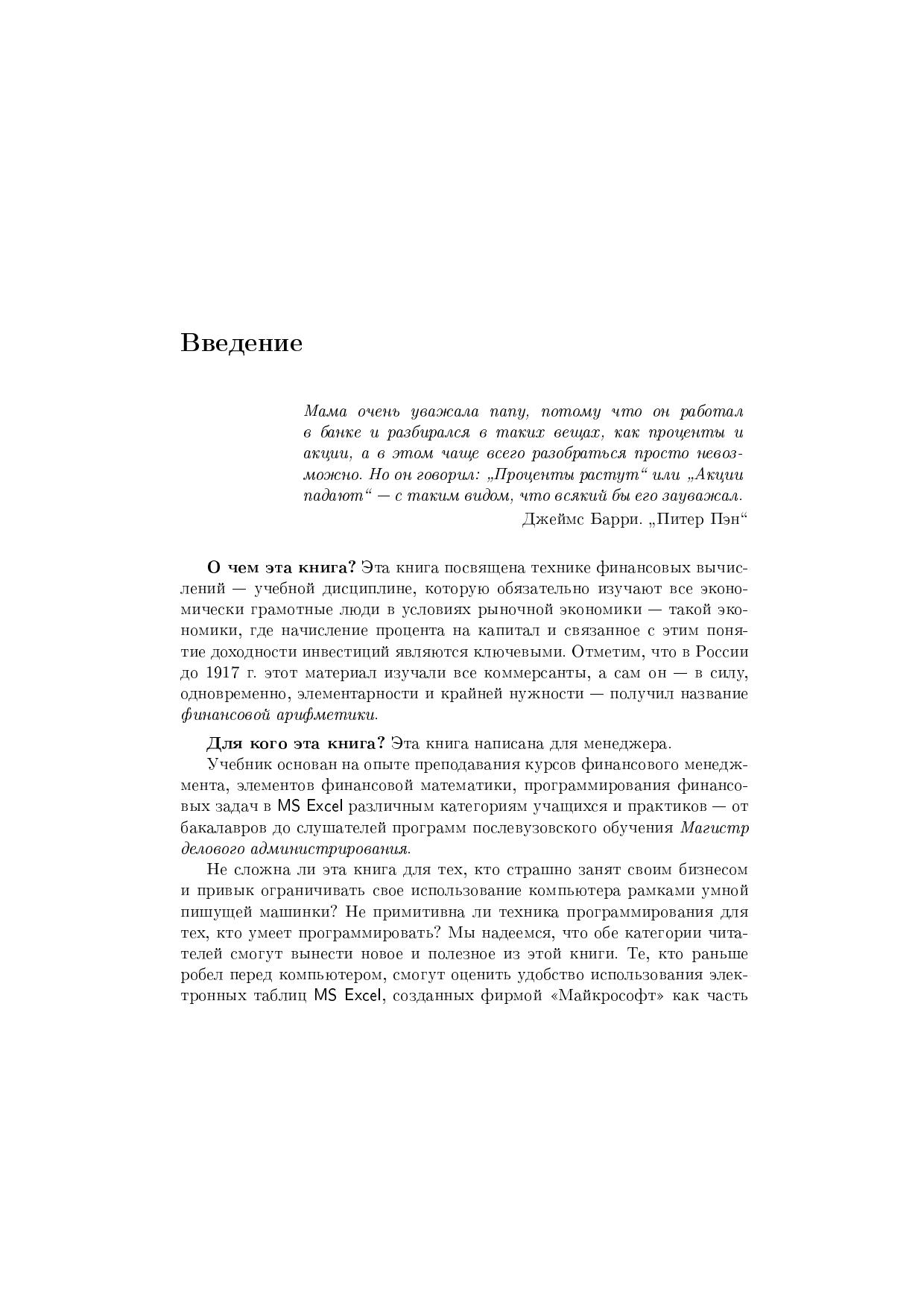 Книга является как основой отдельных курсов по финансовым вычислениям, так и вспомогательным пособием по курсам «Финансы», «Инвестиции», «Финансовый менеджмент», «Корпоративные финансы». В этом отношении она адресована студентам первого высшего образования экономических и управленческих специальностей, а также специальностей «Прикладная математика» и «Информатика». Книга может служить пособием для программ магистратуры, использоваться в практике консультирования, а также – для самообразования всеми, кто имеет дело с анализом инвестиционных проектов и банковским бизнесом. В приложении приведена не только элементарная информация об использовании пакета MS Excel, но изложены и более продвинутые вопросы, которые могут заинтересовать профессиональных программистов – например, основы применения языка AWK.