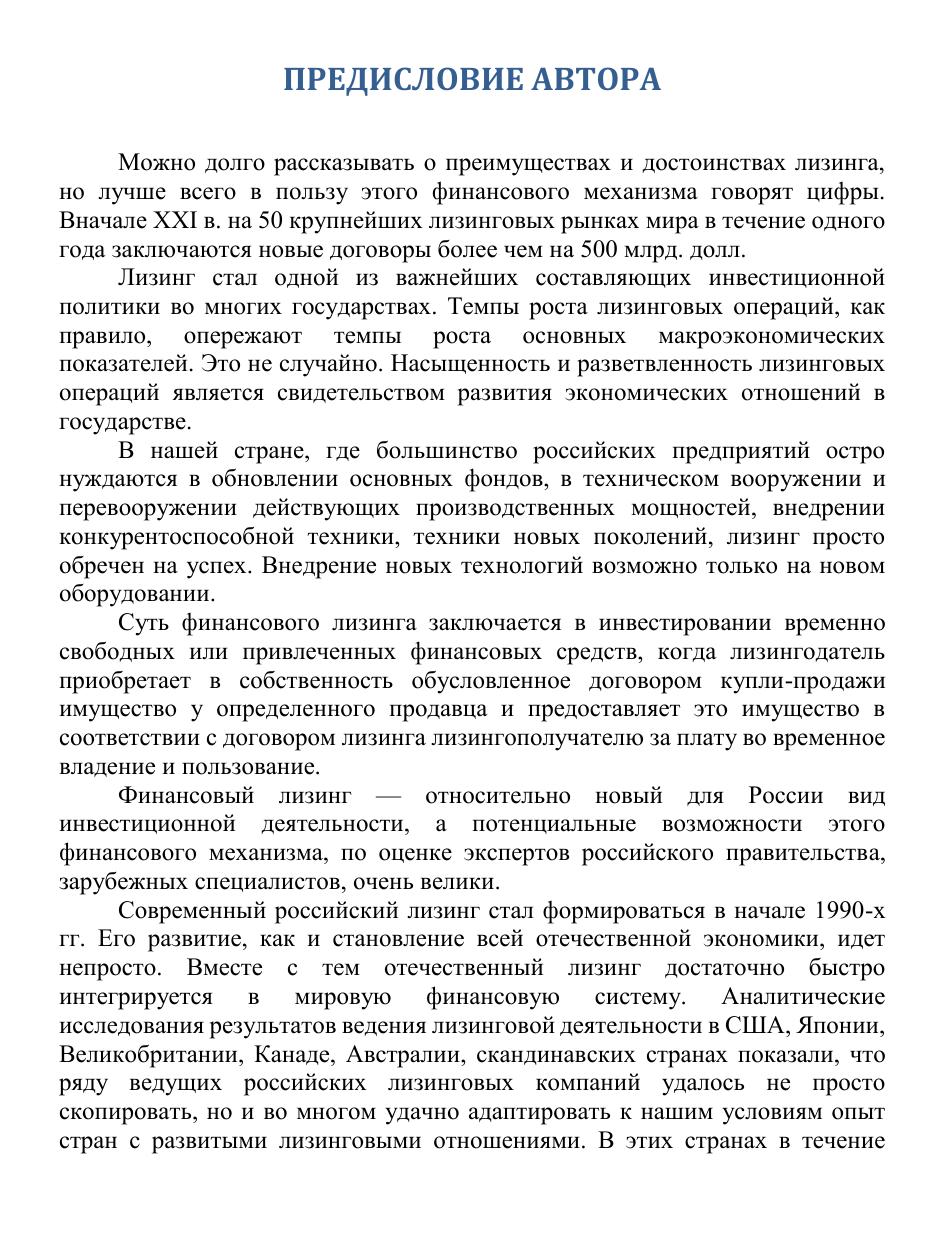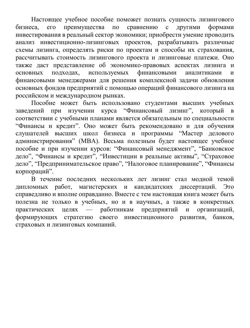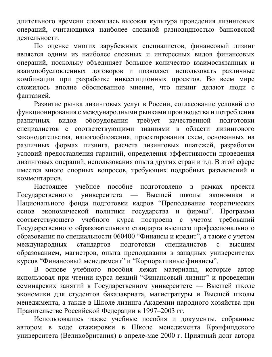 В учебнике раскрываются теоретические аспекты финансового лизинга, его сущность, преимущества по сравнению с традиционной формой финансирования инвестиционных проектов поставки оборудования — кредитом, анализируется структура лизингового бизнеса в России и ряде стран мира. Даются конкретные рекомендации по разработке бизнес-планов лизинговых проектов, подробно рассматривается порядок подготовки и проведения лизинговых операций на основе действующих нормативно-правовых актов. Особое внимание уделено новой системе налогообложения, регулирующей лизинговые операции; приводятся примеры расчета лизинговых платежей. С учетом изменений в лизинговом законодательстве разъясняется мотивация сторон и предоставление гарантий участникам лизинговых сделок. Для студентов экономических вузов и высших школ менеджмента, специалистов-практиков предприятий и организаций, занимающихся экономической, финансовой и правовой деятельностью, работников федеральных и региональных органов государственного управления, специалистов банков, страховых компаний, лизингодателей и лизингополучателей.