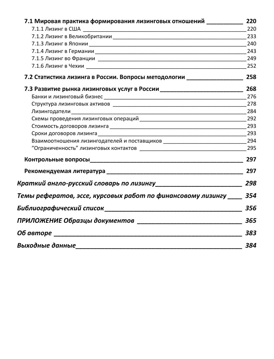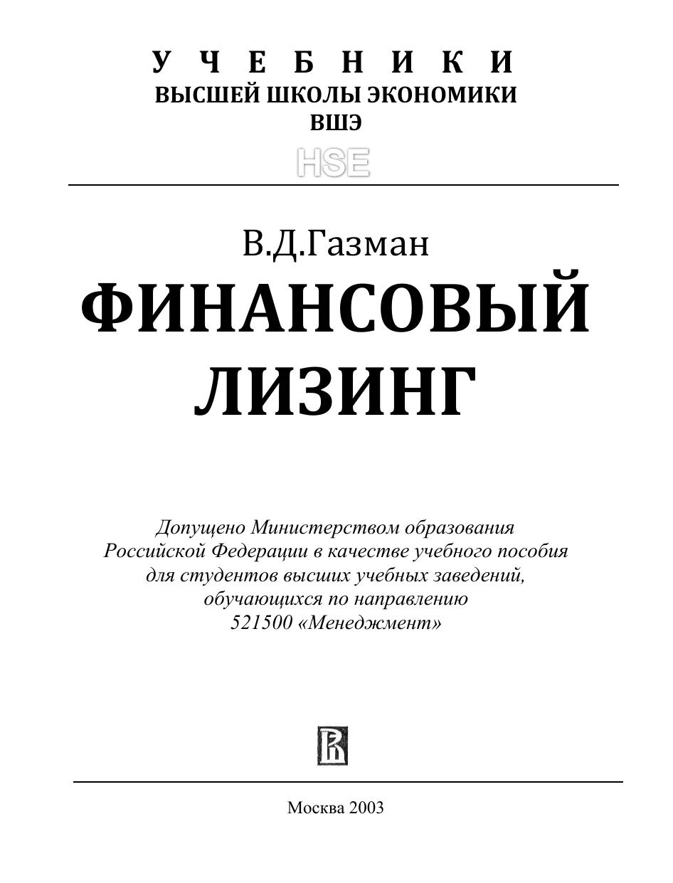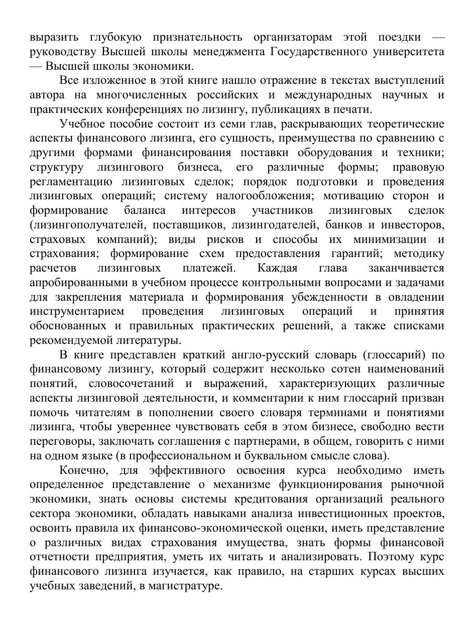 В учебнике раскрываются теоретические аспекты финансового лизинга, его сущность, преимущества по сравнению с традиционной формой финансирования инвестиционных проектов поставки оборудования — кредитом, анализируется структура лизингового бизнеса в России и ряде стран мира. Даются конкретные рекомендации по разработке бизнес-планов лизинговых проектов, подробно рассматривается порядок подготовки и проведения лизинговых операций на основе действующих нормативно-правовых актов. Особое внимание уделено новой системе налогообложения, регулирующей лизинговые операции; приводятся примеры расчета лизинговых платежей. С учетом изменений в лизинговом законодательстве разъясняется мотивация сторон и предоставление гарантий участникам лизинговых сделок. Для студентов экономических вузов и высших школ менеджмента, специалистов-практиков предприятий и организаций, занимающихся экономической, финансовой и правовой деятельностью, работников федеральных и региональных органов государственного управления, специалистов банков, страховых компаний, лизингодателей и лизингополучателей.