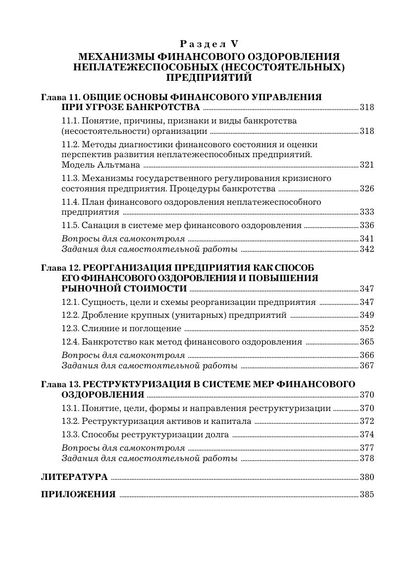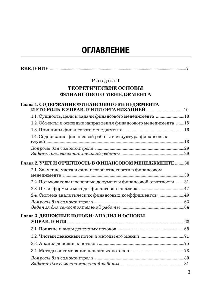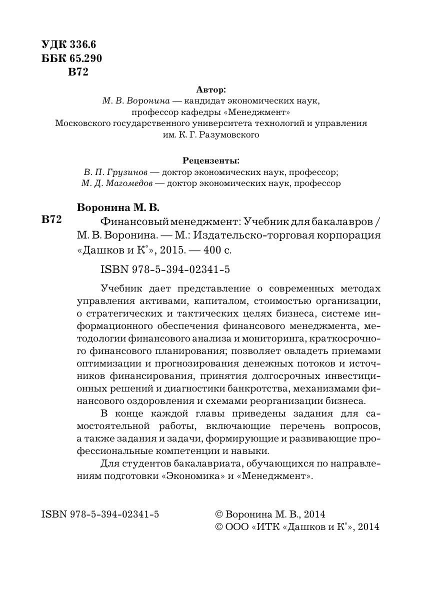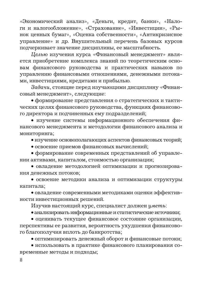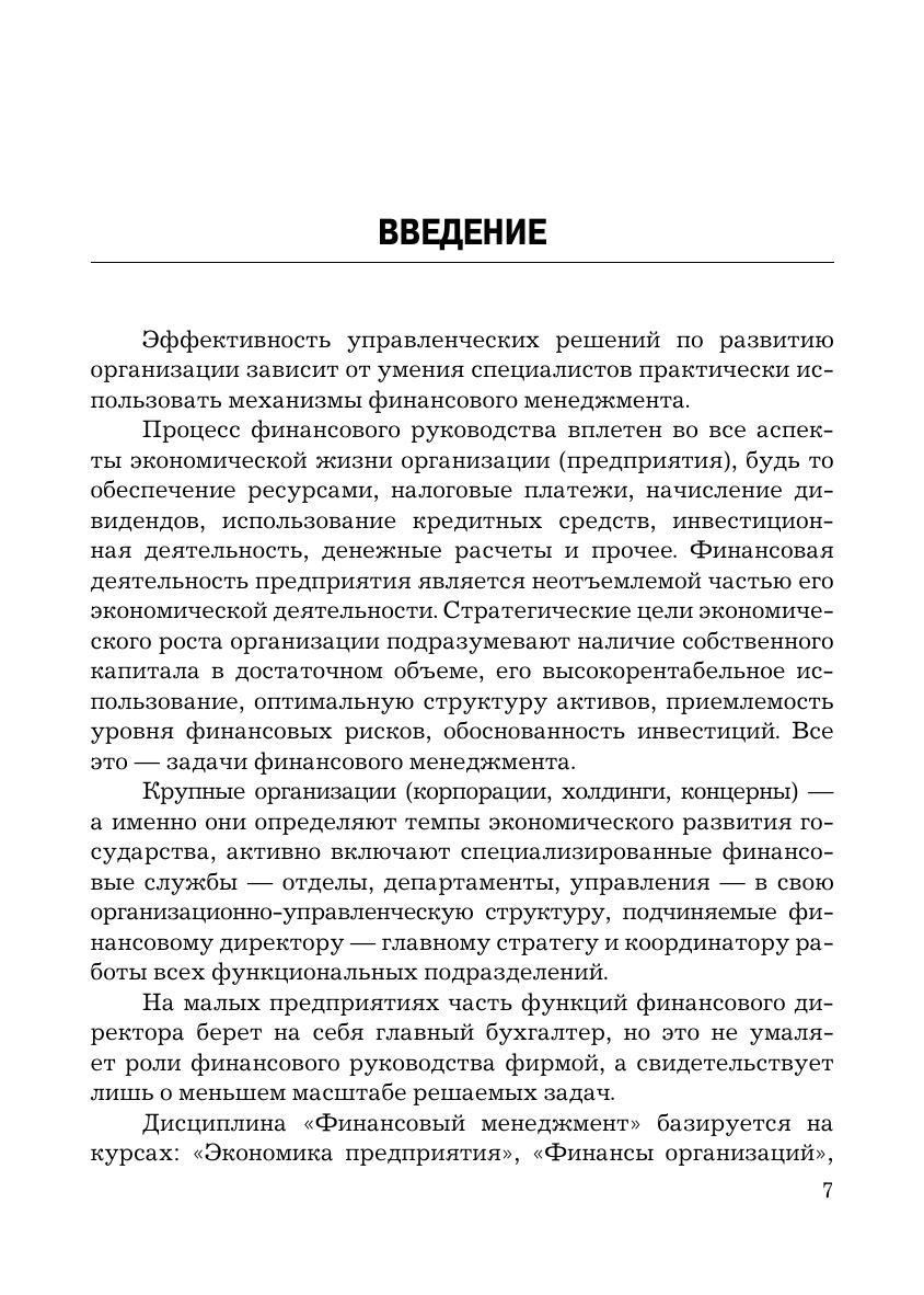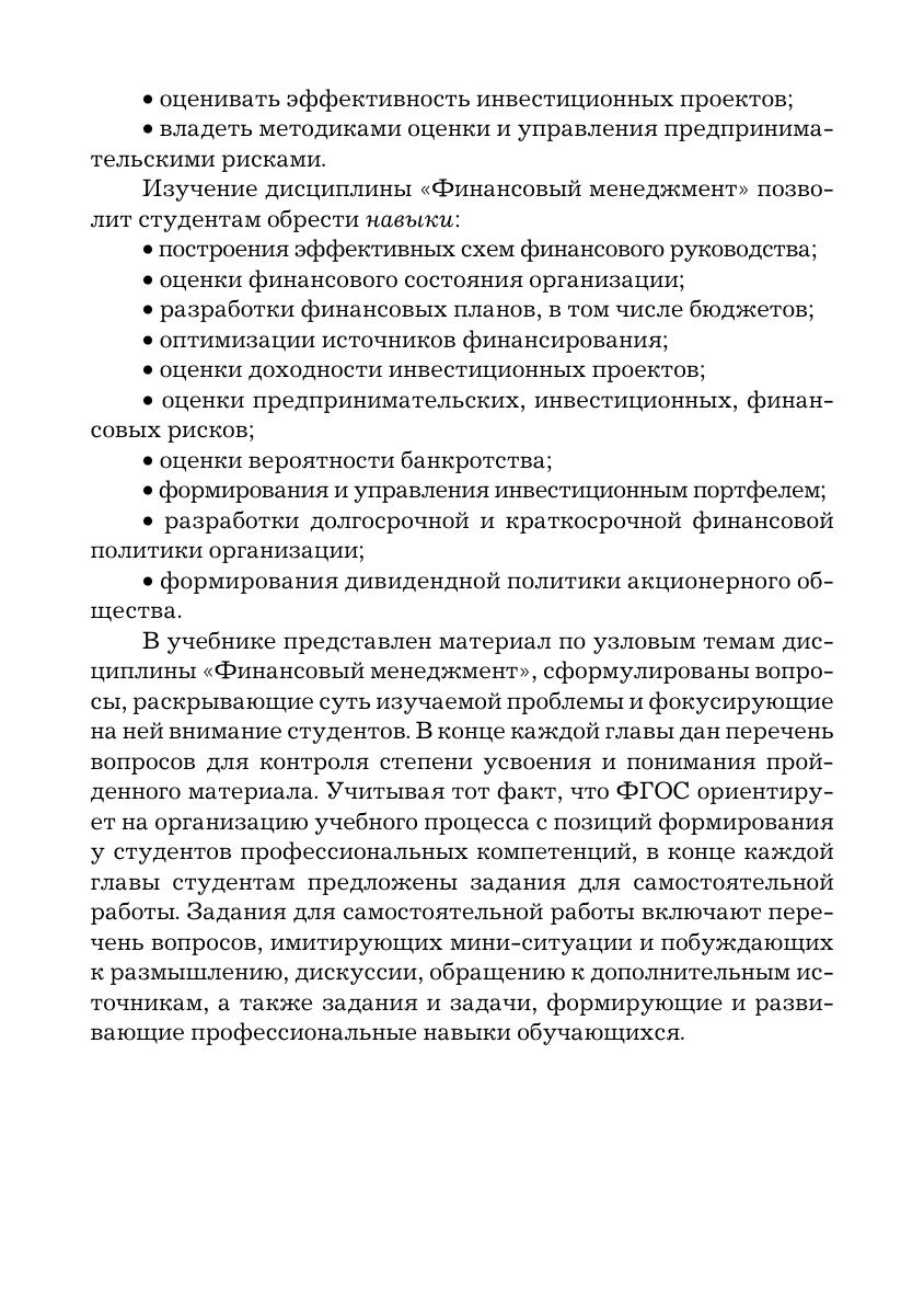 Учебник дает представление о современных методах управления активами, капиталом, стоимостью организации, о стратегических и тактических целях бизнеса, системе информационного обеспечения финансового менеджмента, методологии финансового анализа и мониторинга, краткосрочного финансового планирования; позволяет овладеть приемами оптимизациями и прогнозирования денежных потоков и источников финансирования, принятия долгосрочных инвестиционных решений и диагностики банкротства, механизмами финансового оздоровления и схемами реорганизации бизнеса. В конце каждой главы приведены задания для самостоятельной работы, включающие перечень вопросов, а также задания и задачи, формирующие и развивающие профессиональные компетенции и навыки. Для студентов бакалавриата, обучающихся по направлениям подготовки "Экономика" и "Менеджмент".