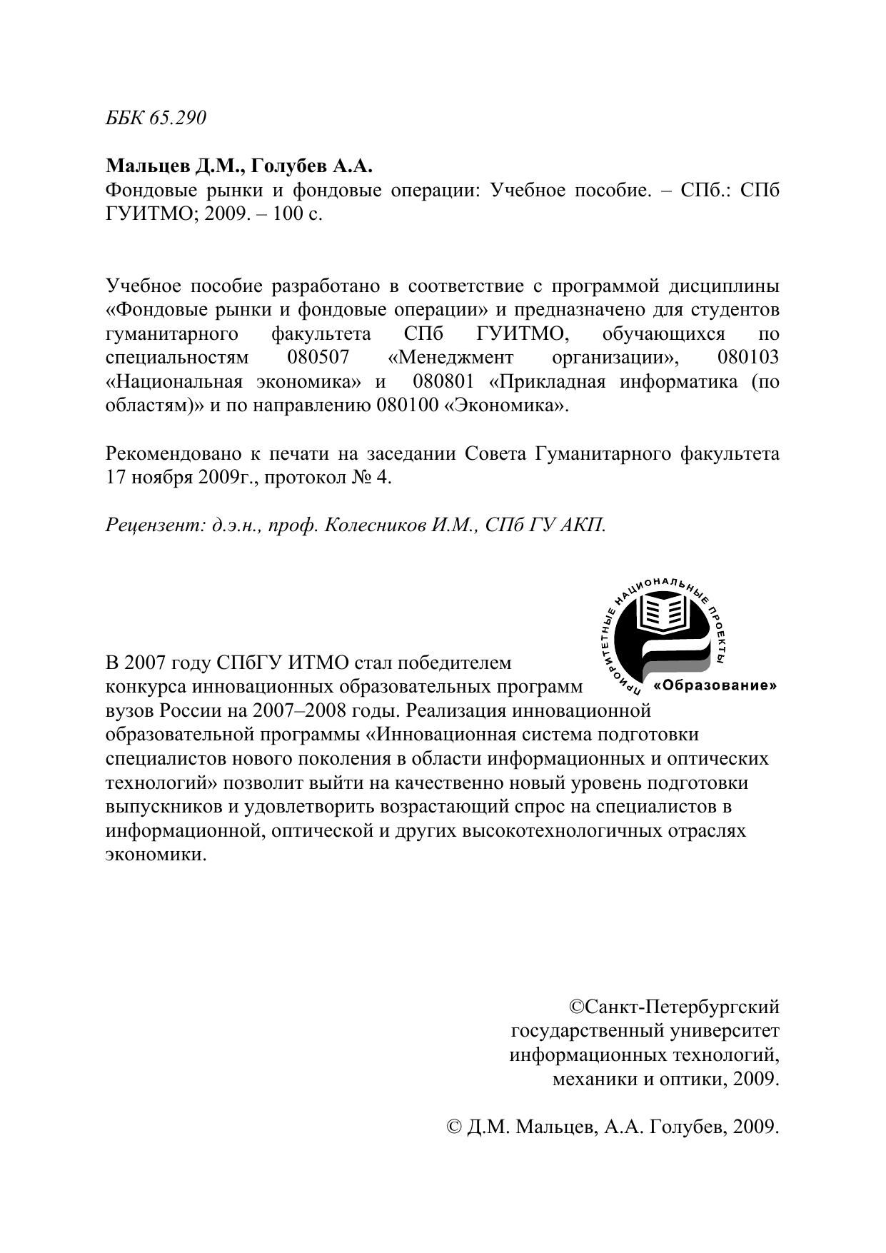 Учебное пособие разработано в соответствие с программой дисциплины «Фондовые рынки и фондовые операции» и предназначено для студентов гуманитарного факультета СПб ГУИТМО, обучающихся по специальностям 080507 «Менеджмент организации», 080103 «Национальная экономика» и 080801 «Прикладная информатика (по областям)» и по направлению 080100 «Экономика».