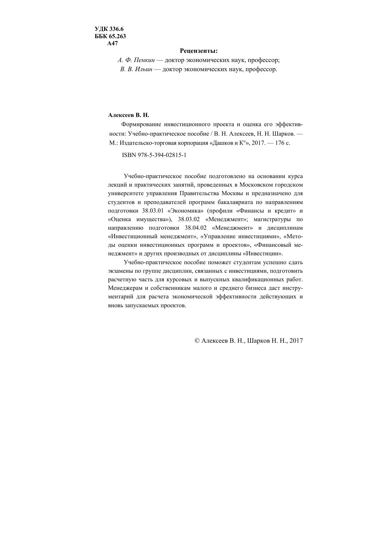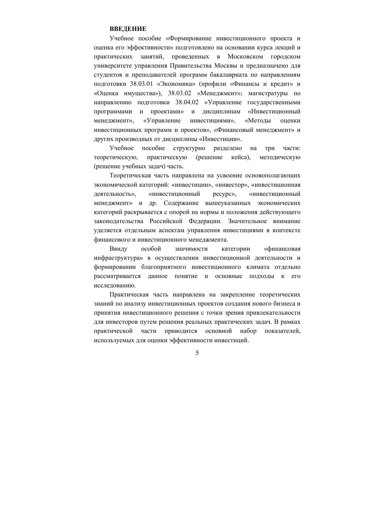 Учебно-практическое пособие подготовлено на основании курса лекций и практических занятий, проведенных в Московском городском университете управления Правительства Москвы и предназначено для студентов и преподавателей программ бакалавриата по направлениям подготовки 38.03.01 "Экономика" (профили "Финансы и кредит" и " Оценка имущества"), 38.03.02 "Менеджмент"; магистратуры по направлению подготовки 38.04.02 "Менеджмент" и дисциплинам "Инвестиционный менеджмент", "Управление инвестициями", "Методы оценки инвестиционных программ и проектов", "Финансовый менеджмент" и других производных от дисциплины "Инвестиции".