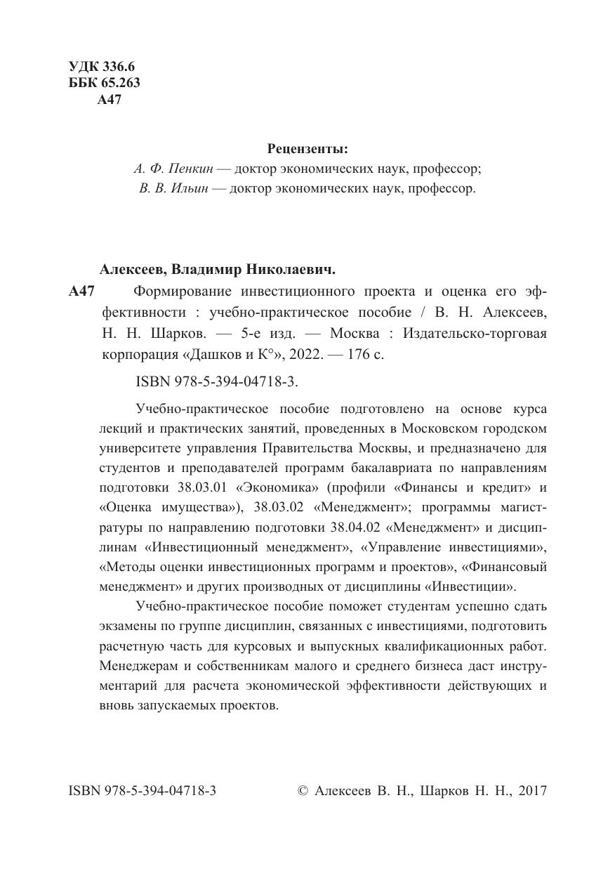 Учебно-практическое пособие подготовлено на основании курса лекций и практических занятий, проведенных в Московском городском университете управления Правительства Москвы и предназначено для студентов и преподавателей программ бакалавриата по направлениям подготовки 38.03.01 "Экономика" (профили "Финансы и кредит" и " Оценка имущества"), 38.03.02 "Менеджмент", магистратуры по направлению подготовки 38.04.02 "Менеджмент" и дисциплинам "Инвестиционный менеджмент", "Управление инвестициями", "Методы оценки инвестиционных программ и проектов", "Финансовый менеджмент" и других производных от дисциплины "Инвестиции". Учебно-практическое пособие поможет студентам успешно сдать экзамены по группе дисциплин, связанных с инвестициями, подготовить расчетную часть курсовых и выпускных квалификационных работ. Менеджерам и собственникам малого и среднего бизнеса даст инструментарий для расчета экономической эффективности действующих и вновь запускаемых проектов.