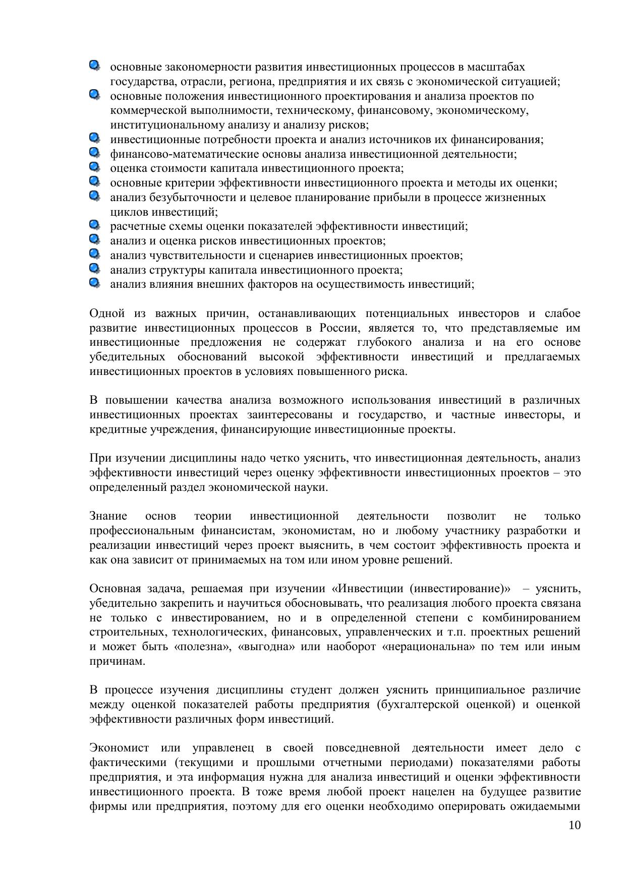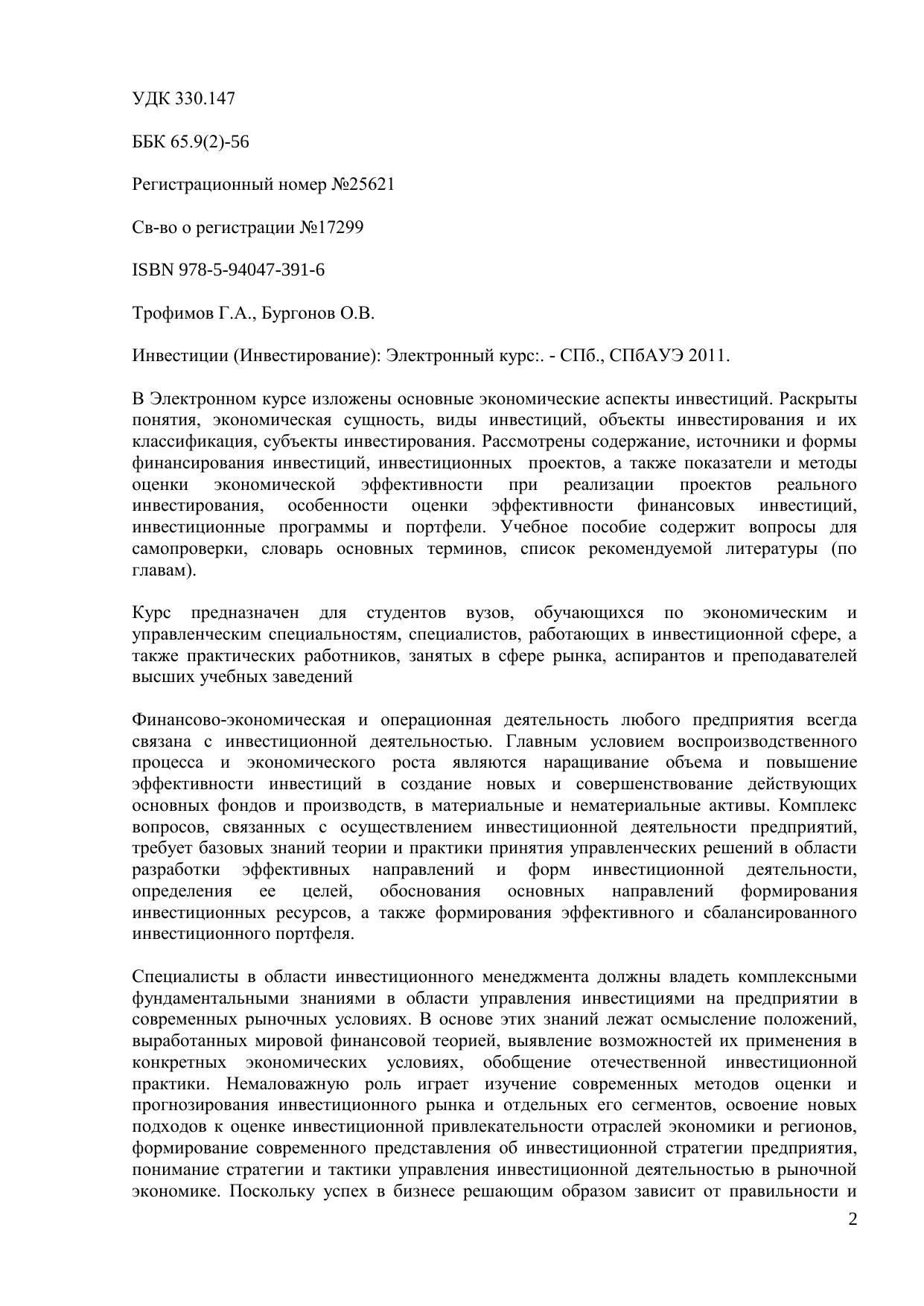 В Электронном курсе изложены основные экономические аспекты инвестиций. Раскрыты понятия, экономическая сущность, виды инвестиций, объекты инвестирования и их классификация, субъекты инвестирования. Рассмотрены содержание, источники и формы финансирования инвестиций, инвестиционных проектов, а также показатели и методы оценки экономической эффективности при реализации проектов реального инвестирования, особенности оценки эффективности финансовых инвестиций, инвестиционные программы и портфели. Учебное пособие содержит вопросы для самопроверки, словарь основных терминов, список рекомендуемой литературы (по главам). Курс предназначен для студентов вузов, обучающихся по экономическим и управленческим специальностям, специалистов, работающих в инвестиционной сфере, а также практических работников, занятых в сфере рынка, аспирантов и преподавателей высших учебных заведений. Финансово-экономическая и операционная деятельность любого предприятия всегда связана с инвестиционной деятельностью. Главным условием воспроизводственного процесса и экономического роста являются наращивание объема и повышение эффективности инвестиций в создание новых и совершенствование действующих основных фондов и производств, в материальные и нематериальные активы. Комплекс вопросов, связанных с осуществлением инвестиционной деятельности предприятий, требует базовых знаний теории и практики принятия управленческих решений в области разработки эффективных направлений и форм инвестиционной деятельности, определения ее целей, обоснования основных направлений формирования инвестиционных ресурсов, а также формирования эффективного и сбалансированного инвестиционного портфеля. Специалисты в области инвестиционного менеджмента должны владеть комплексными фундаментальными знаниями в области управления инвестициями на предприятии в современных рыночных условиях. В основе этих знаний лежат осмысление положений, выработанных мировой финансовой теорией, выявление возможностей их применения в конкретных экономических условиях, обобщение отечественной инвестиционной практики. Немаловажную роль играет изучение современных методов оценки и прогнозирования инвестиционного рынка и отдельных его сегментов, освоение новых подходов к оценке инвестиционной привлекательности отраслей экономики и регионов, формирование современного представления об инвестиционной стратегии предприятия, понимание стратегии и тактики управления инвестиционной деятельностью в рыночной экономике. Поскольку успех в бизнесе решающим образом зависит от правильности и обоснованности выбранной стратегии деятельности любой организации, центральное место в познании механизма принятия управленческих решений в этой области принадлежит изучению современных методов и форм инвестиционной деятельности, комплексного анализа экономической оценки эффективности инвестиций, методологических приемов формирования и управления инвестиционным портфелем организации. Необходимость комплексного подхода к изложению вопросов теории и практики разработки и реализации инвестиционной стратегии предприятия определило структуру учебного пособия. В нем достаточно полно раскрывается содержание узловых проблем формирования и реализации инвестицион