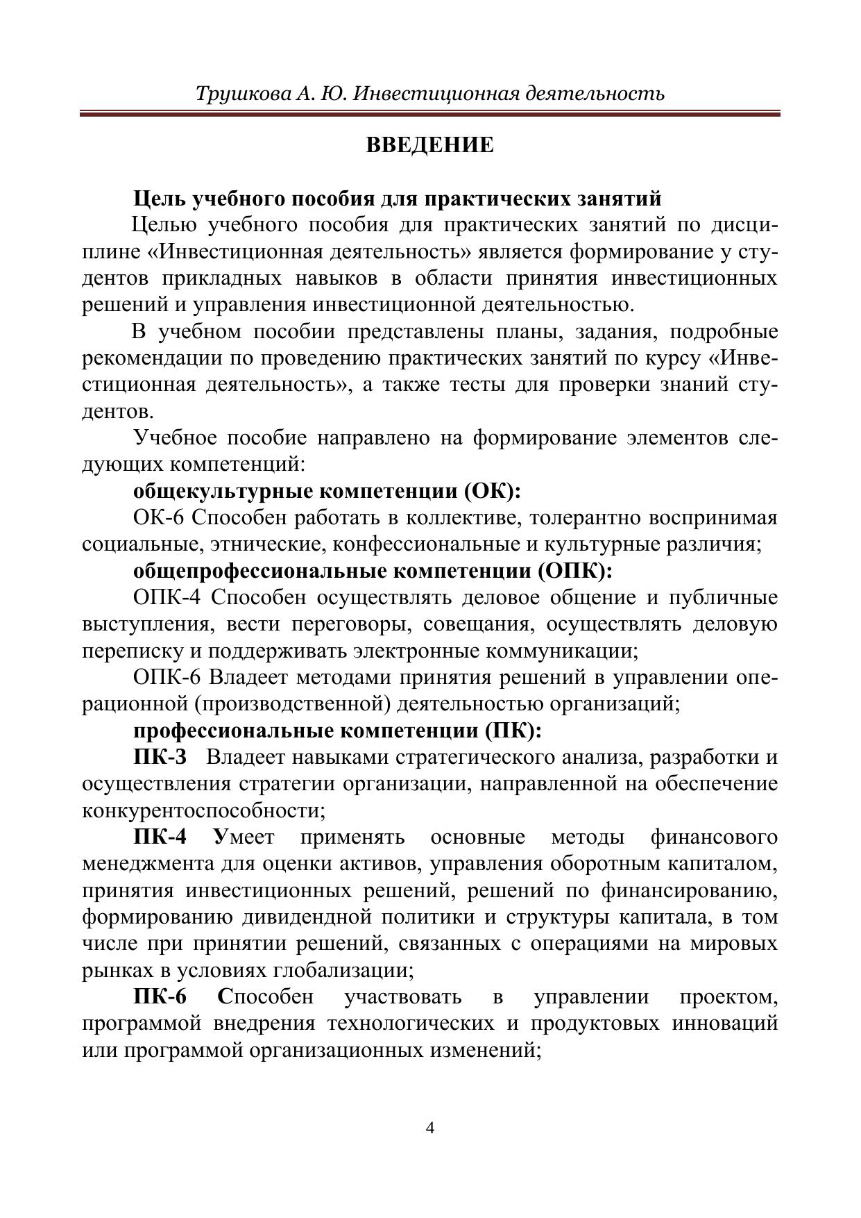 Учебное пособие содержит задания, позволяющие рассмотреть пути и способы применения основных теоретических положений в области инвестиционного менеджмента в практике инвестиционной деятельности организаций. В учебном пособии также представлены планы, подробные рекомендации по проведению практических занятий по курсу «Инвестиционная деятельность», а также тесты для проверки знаний студентов. Учебное пособие подготовлено на кафедре «Менеджмент» и предназначено для студентов-бакалавров по направлению подготовки 38.03.02 – Менеджмент.