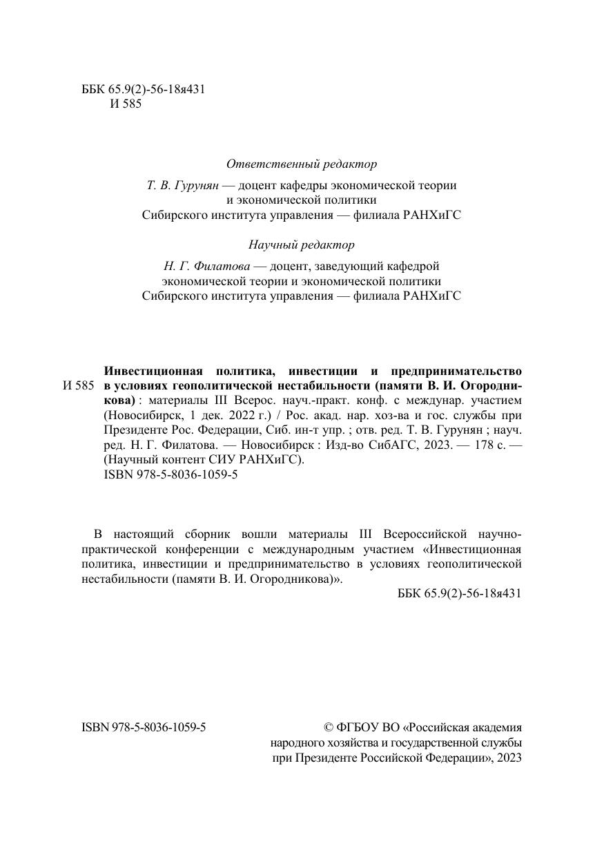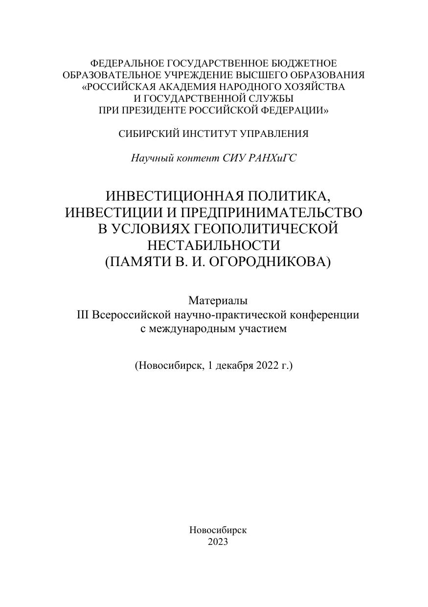 Инвестиционная политика, инвестиции и предпринимательство в условиях геополитической нестабильности (памяти В. И. Огородникова): материалы III Всерос. науч.-практ. конф. с междунар. участием (Новосибирск, 1 дек. 2022 г.)