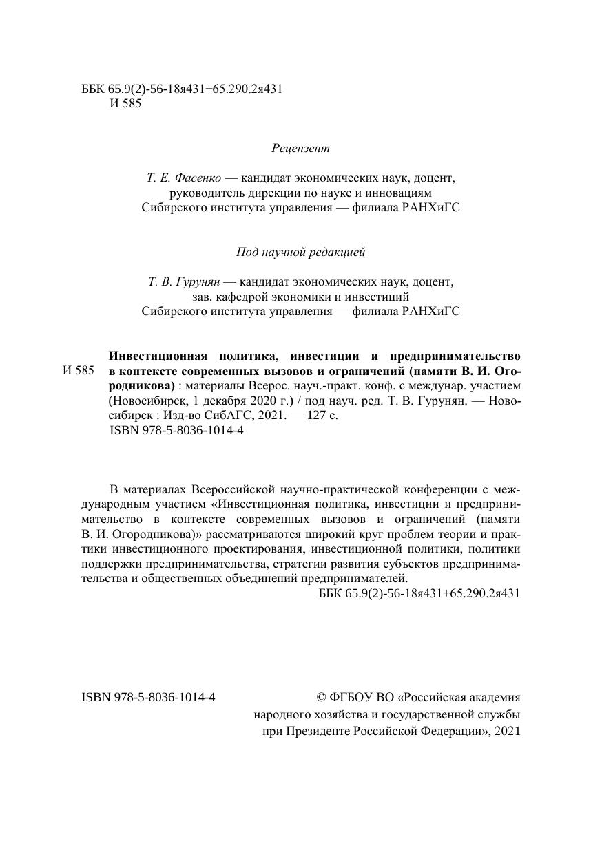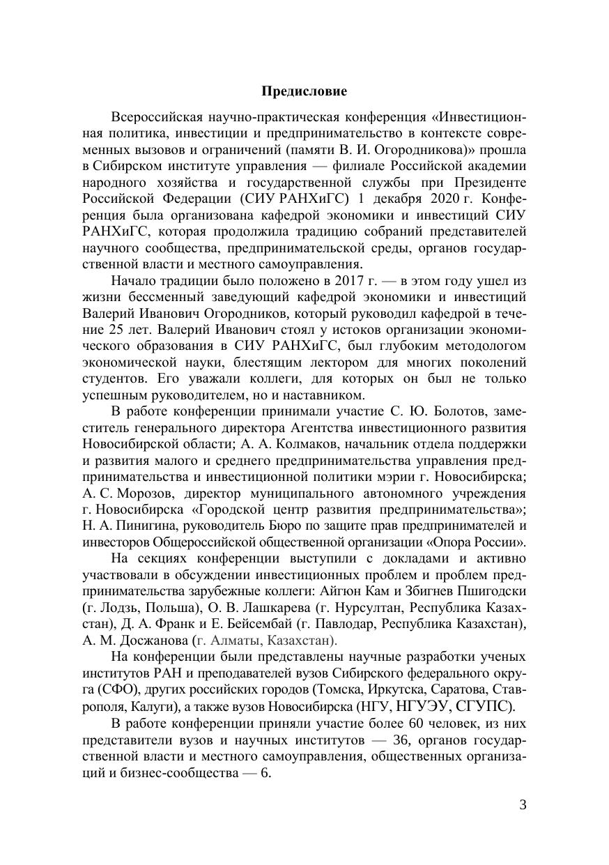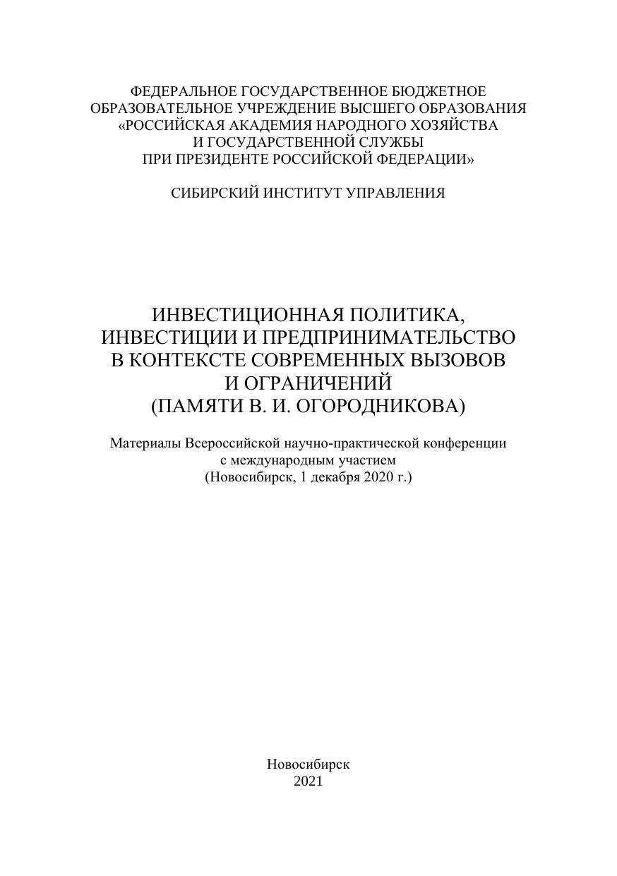 Инвестиционная политика, инвестиции и предпринимательство в контексте современных вызовов и ограничений (памяти В. И. Огородникова): материалы Всерос. науч.-практ. конф. с междунар. участием (Новосибирск, 1 декабря 2020 г.)