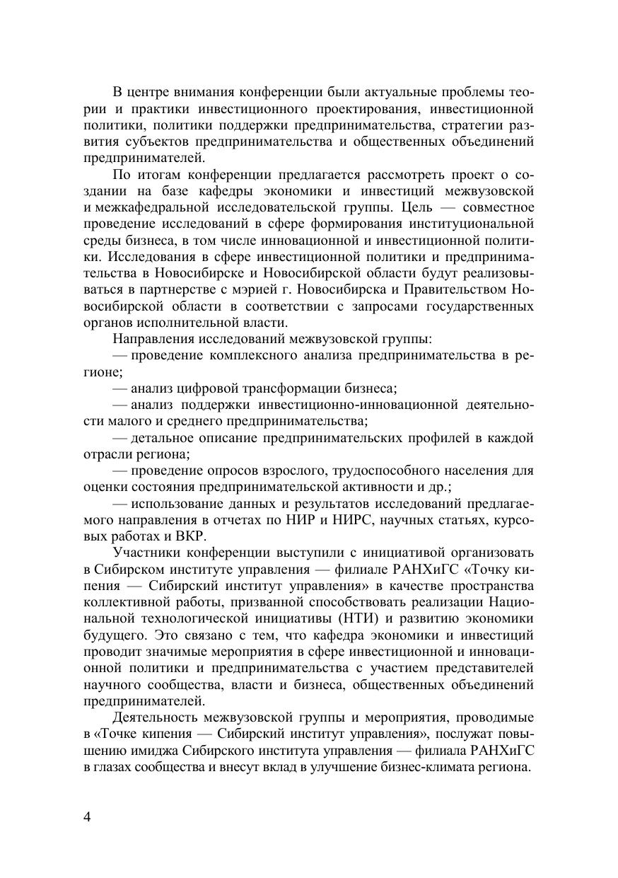 В материалах Всероссийской научно-практической конференции с меж-дународным участием «Инвестиционная политика, инвестиции и предприни-мательство в контексте современных вызовов и ограничений (памяти В. И. Огородникова)» рассматриваются широкий круг проблем теории и прак-тики инвестиционного проектирования, инвестиционной политики, политики поддержки предпринимательства, стратегии развития субъектов предпринима-тельства и общественных объединений предпринимателей.