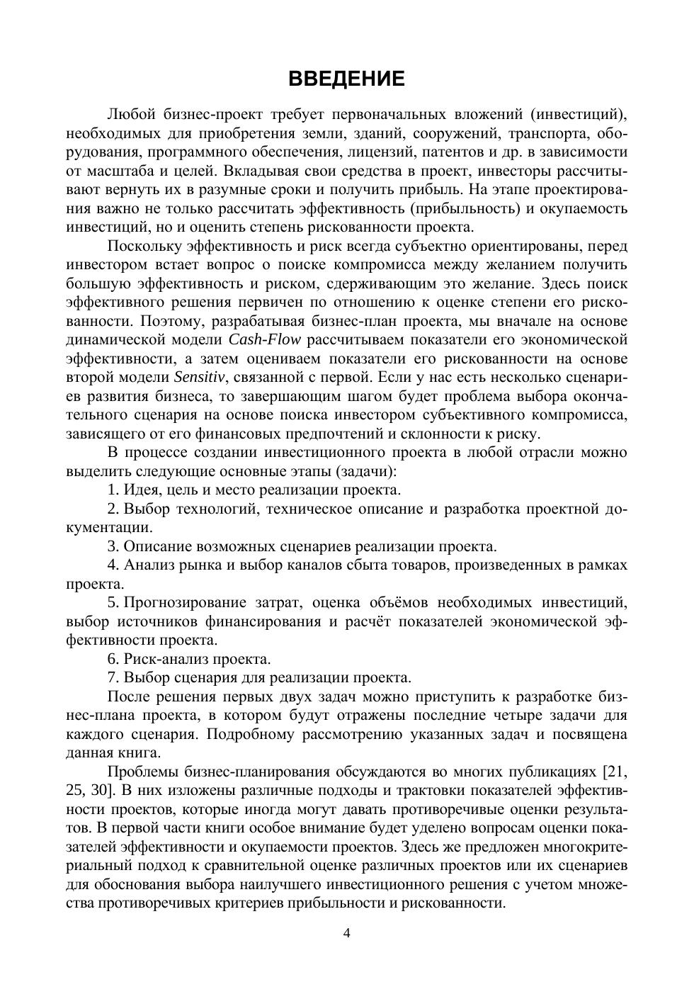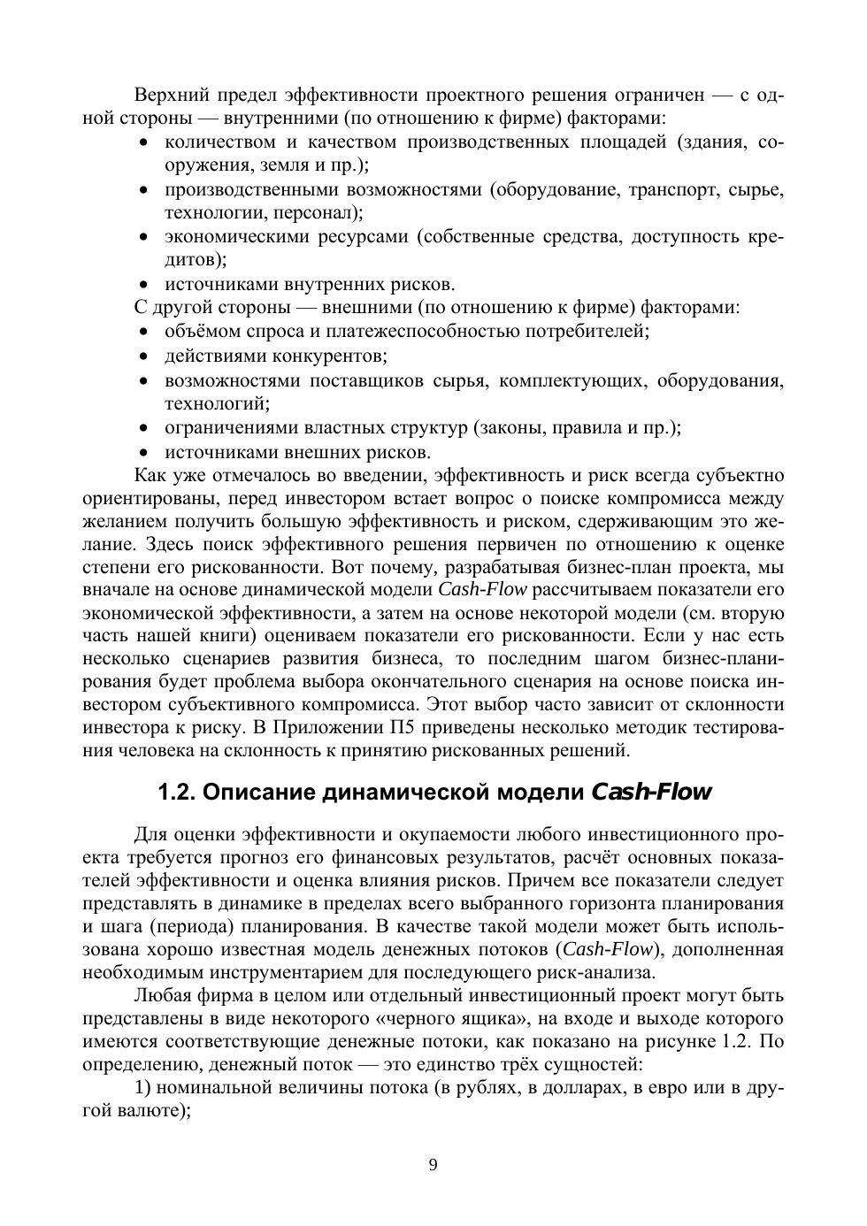 В первой части учебного пособия рассмотрены основные задачи управления проектами и бизнесом в условиях неопределенности и риска. Динамическая модель Cash-Flow выступает как один из важных инструментов управления ходом реализации проекта. Вторая часть пособия посвящена вопросам риск-анализа проектов. В качестве основного инструмента при оценке эффективности и риска инвестиционных проектов используется динамическая модель денежных потоков, дополненная моделью расчета функций чувствительности. Обе модели реализованы в среде EXCEL и позволяют прогнозировать динамику показателей проекта в пределах всего выбранного горизонта планирования. Данная методика ориентирована на практическое использование при прогнозировании финансовых показателей инвестиционных проектов, а также качественную и количественную оценку влияния различных совокупностей рисков. В конце первой и второй части представлены перечни вопросов, ответы на которые позволят студентам глубже понять содержание обсуждаемых проблем. Пособие предназначено для преподавателей и студентов вузов экономического направления подготовки, а также для специалистов в сфере бизнес-планирования, анализа рисков и управления проектами в условиях неопределенности.