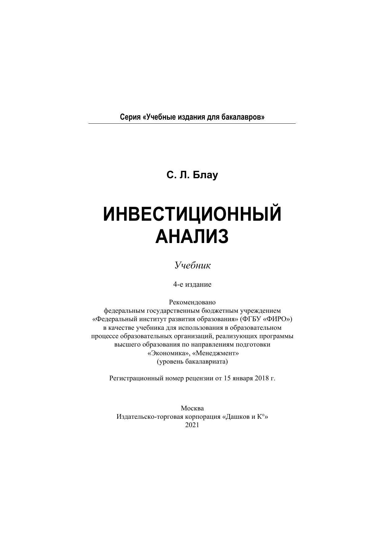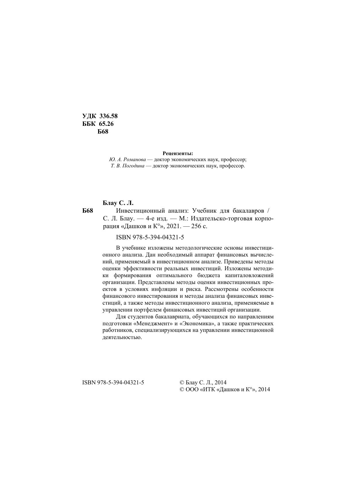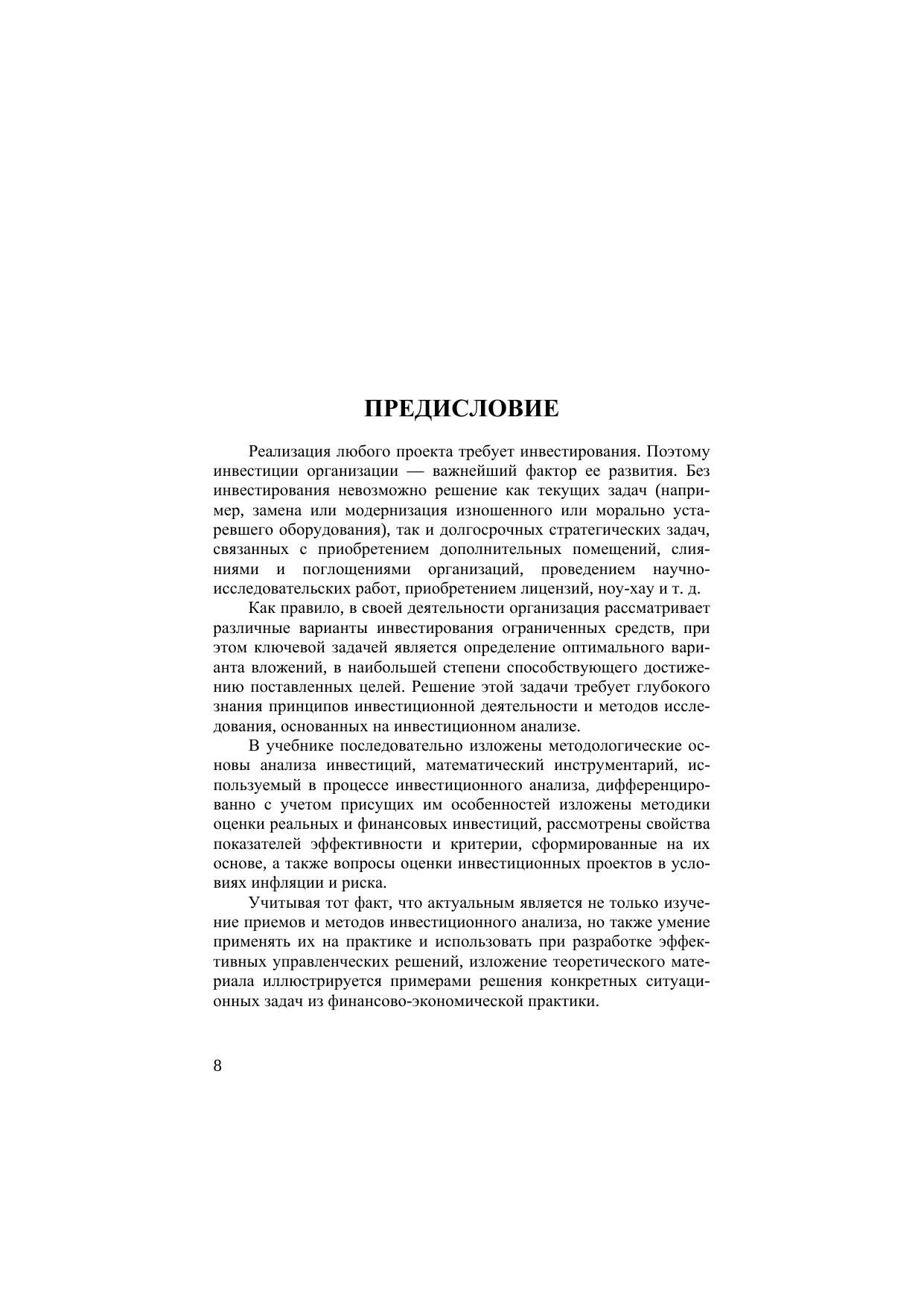 В учебнике изложены методологические основы инвестиционного анализа. Дан необходимый аппарат финансовых вычислений, применяемый в инвестиционном анализе. Приведены методы оценки эффективности реальных инвестиций. Изложены методики формирования оптимального бюджета капиталовложений организации. Представлены методы оценки инвестиционных проектов в условиях инфляции и риска. Рассмотрены особенности финансового инвестирования и методы анализа финансовых инвестиций, а также методы инвестиционного анализа, применяемые в управлении портфелем финансовых инвестиций организации. Для студентов бакалавриата, обучающихся по направлениям подготовки "Менеджмент" и "Экономика", а также практических работников, специализирующихся на управлении инвестиционной деятельности