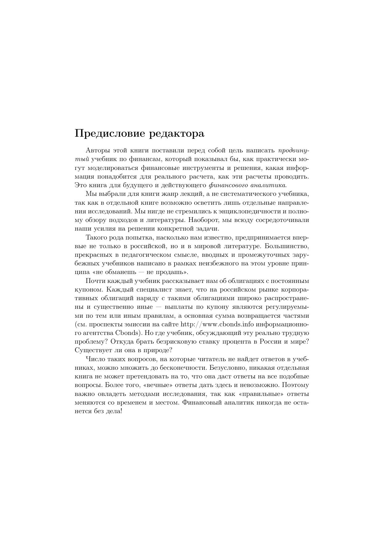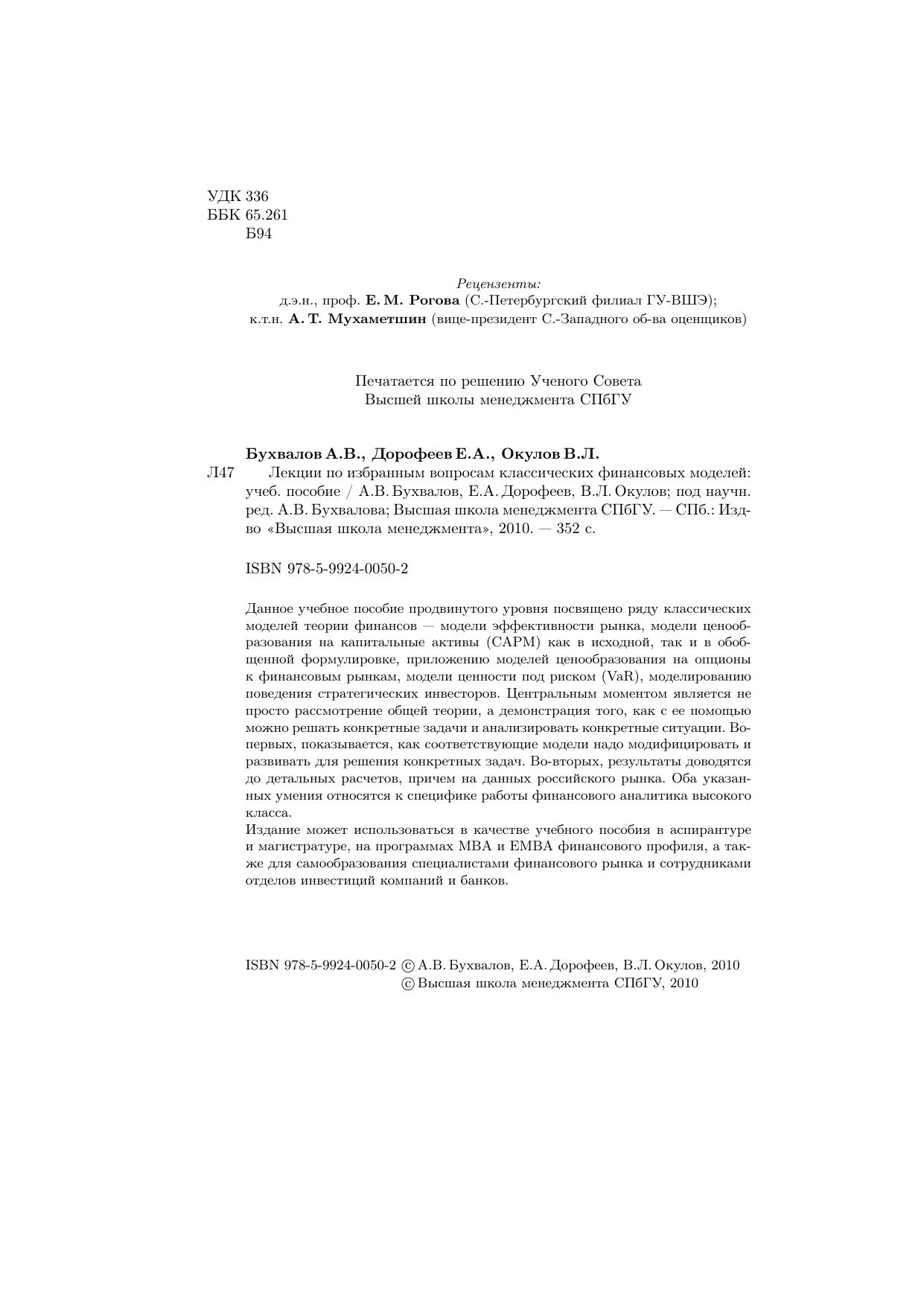 Данное учебное пособие продвинутого уровня посвящено ряду классических моделей теории финансов: модели эффективности рынка, модели ценообразования на капитальные активы (CAPM) как в исходной, так и в обобщенной формулировке, приложению моделей ценообразования на опционы к финансовым рынкам, модели ценности под риском (VaR), моделированию поведения стратегических инвесторов.В книге рассматривается не только общая теория, но и демонстрируется возможность решения конктретных задач и анализа конкретных ситуаций, в том числе детальные расчеты, основанные на примерах российского рынка.Издание может использоваться в качестве учебного пособия в аспирантуре и магистратуре, на программах MBA и EMBA финансового профиля, а также для самообразования специалистами финансового рынка и сотрудниками отделов инвестиций компаний и банков.
