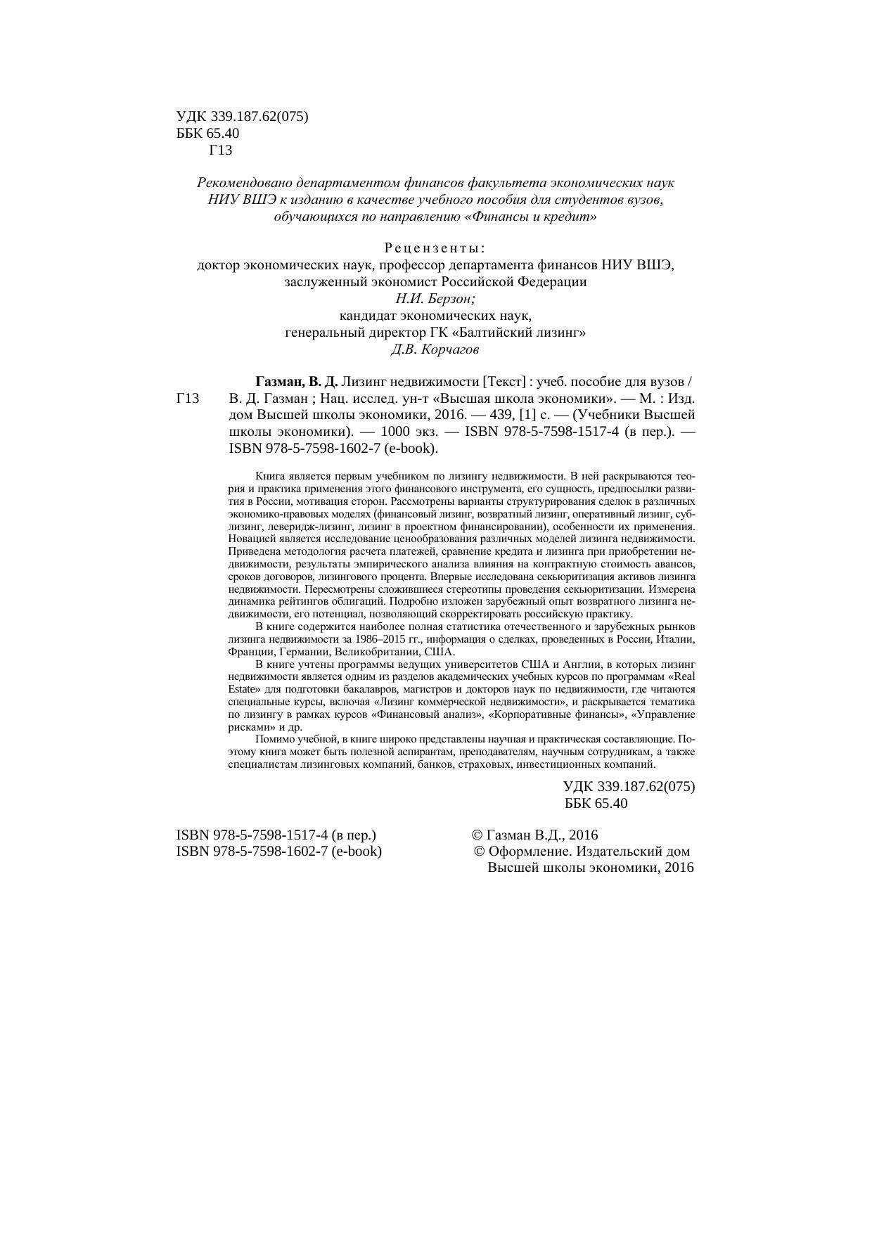 Книга является первым учебником по лизингу недвижимости. В ней раскрываются теория и практика применения этого финансового инструмента, его сущность, предпосылки развития в России, мотивация сторон. Рассмотрены варианты структурирования сделок в различных экономико-правовых моделях (финансовый лизинг, возвратный лизинг, оперативный лизинг, сублизинг, леверидж-лизинг, лизинг в проектном финансировании), особенности их применения. Новацией является исследование ценообразования различных моделей лизинга недвижимости. Приведена методология расчета платежей, сравнение кредита и лизинга при приобретении недвижимости, результаты эмпирического анализа влияния на контрактную стоимость авансов, сроков договоров, лизингового процента. Впервые исследована секьюритизация активов лизинга недвижимости. Пересмотрены сложившиеся стереотипы проведения секьюритизации. Измерена динамика рейтингов облигаций. Подробно изложен зарубежный опыт возвратного лизинга недвижимости, его потенциал, позволяющий скорректировать российскую практику. В книге содержится наиболее полная статистика отечественного и зарубежных рынков лизинга недвижимости за 1986–2015 гг., информация о сделках, проведенных в России, Италии, Франции, Германии, Великобритании, США. В книге учтены программы ведущих университетов США и Англии, в которых лизинг недвижимости является одним из разделов академических учебных курсов по программам «Real Estate» для подготовки бакалавров, магистров и докторов наук по недвижимости, где читаются специальные курсы, включая «Лизинг коммерческой недвижимости», и раскрывается тематика по лизингу в рамках курсов «Финансовый анализ», «Корпоративные финансы», «Управление рисками» и др. Помимо учебной, в книге широко представлены научная и практическая составляющие. Поэтому книга может быть полезной аспирантам, преподавателям, научным сотрудникам, а также специалистам лизинговых компаний, банков, страховых, инвестиционных компаний