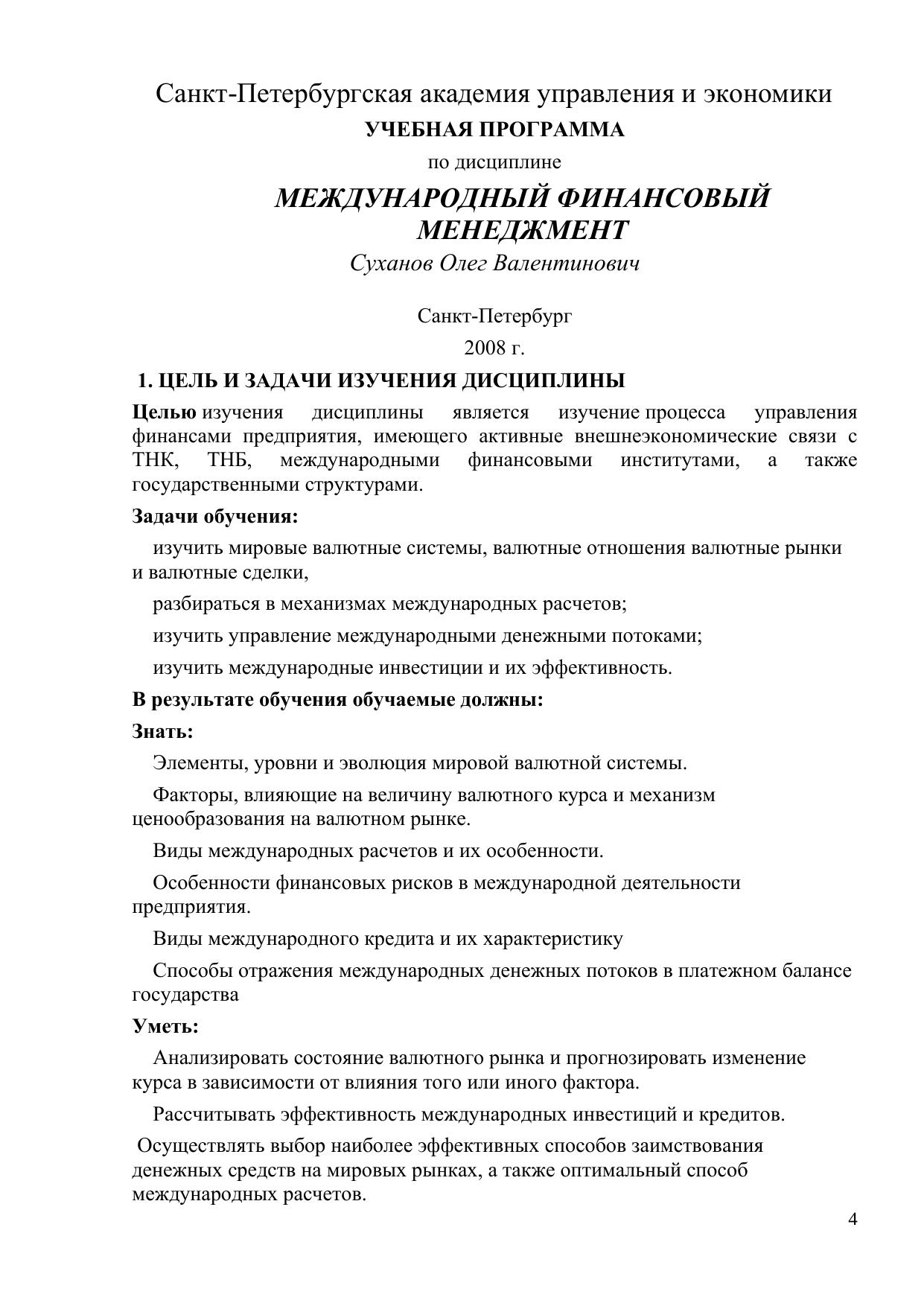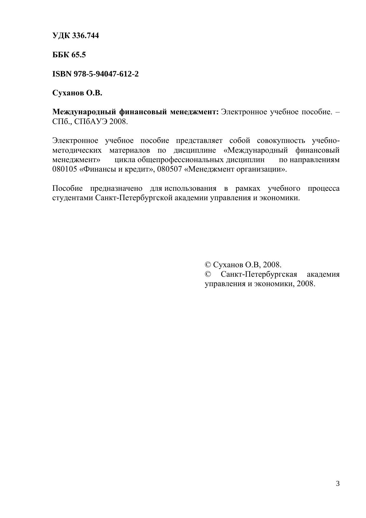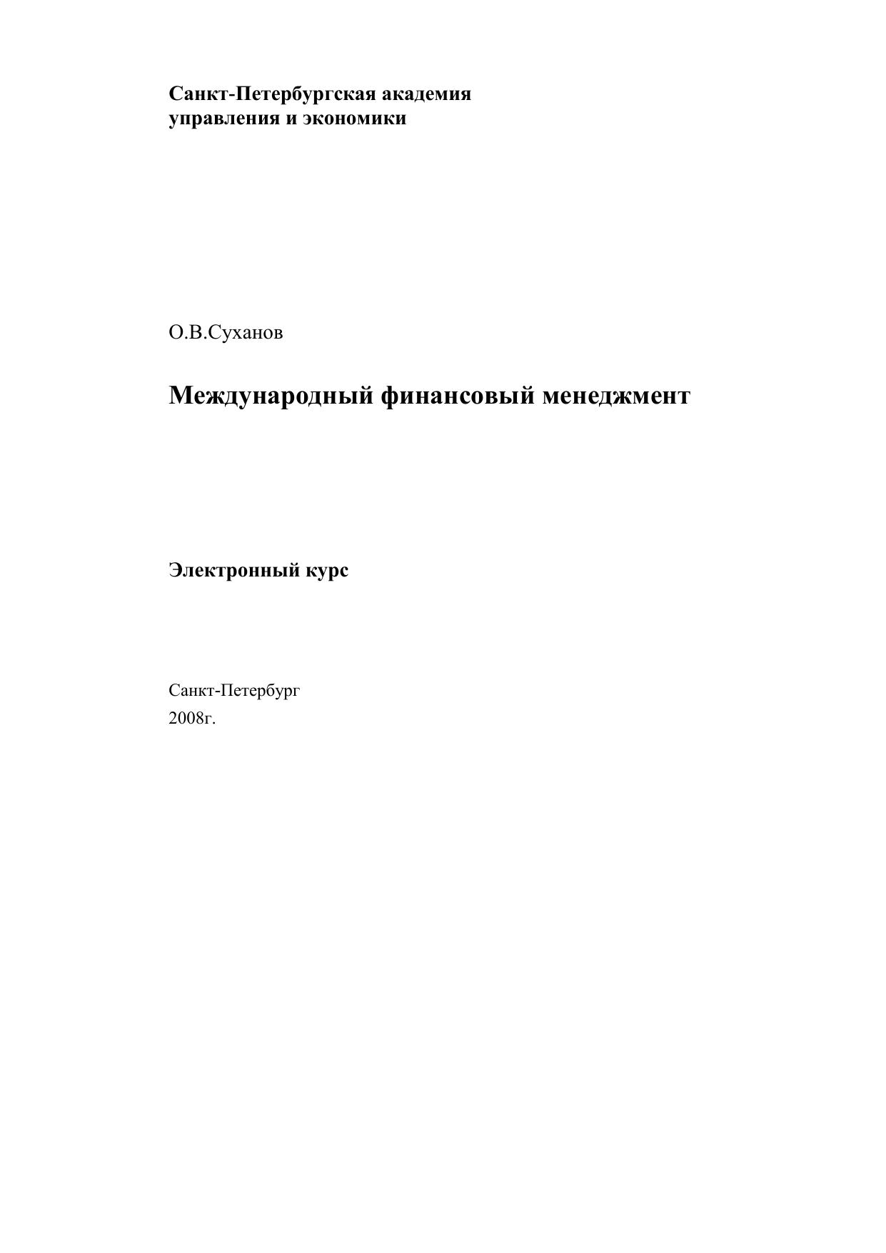 Электронное учебное пособие представляет собой совокупность учебно-методических материалов по дисциплине «Международный финансовый менеджмент» цикла общепрофессиональных дисциплин по направлениям 080105 «Финансы и кредит», 080507 «Менеджмент организации». Пособие предназначено для использования в рамках учебного процесса студентами Санкт-Петербургской академии управления и экономики. Электронное учебное пособие для дистанционного обучения