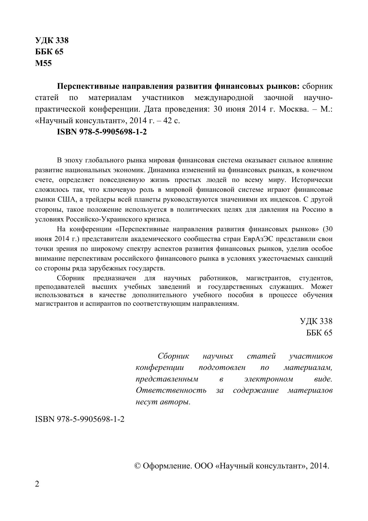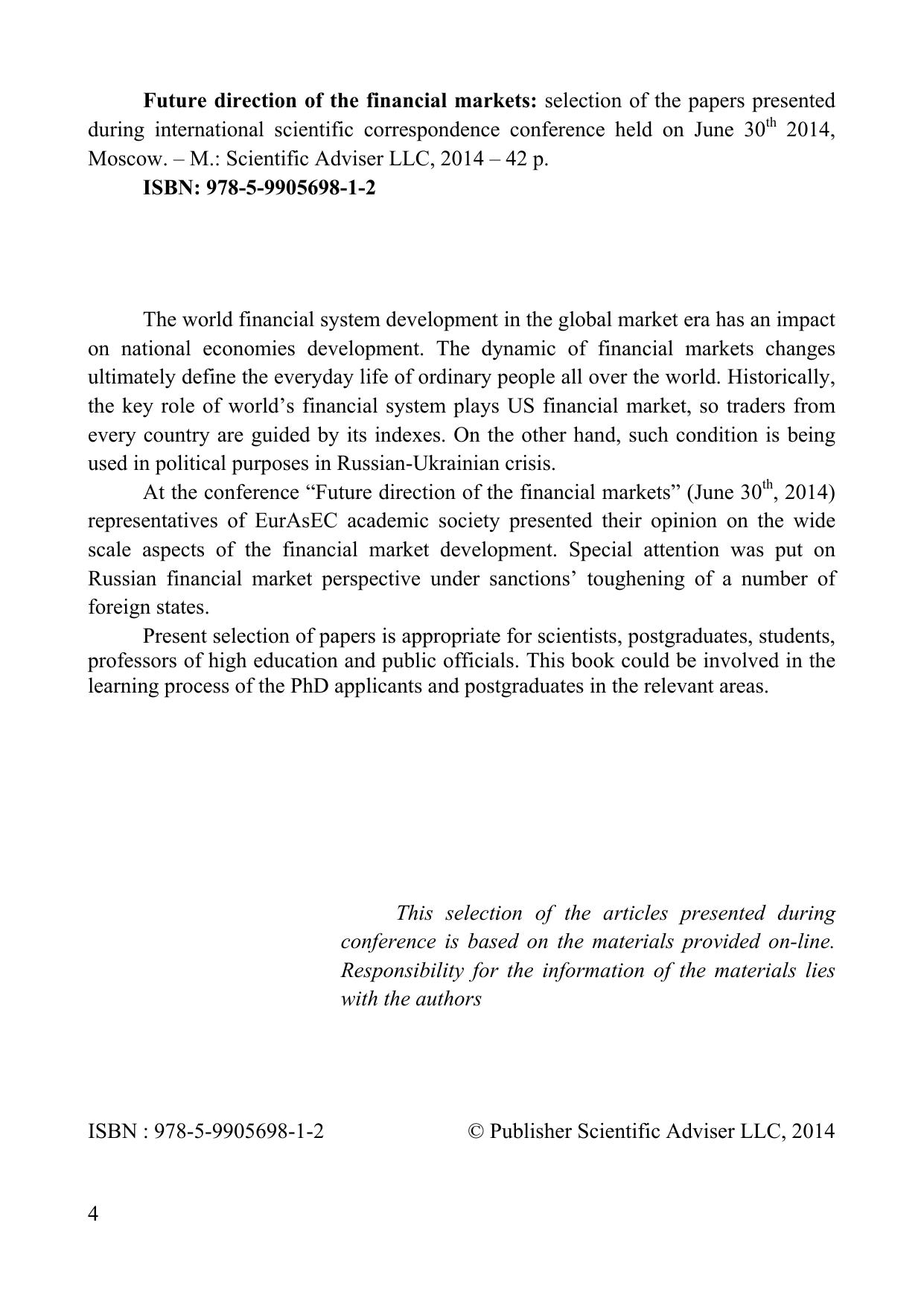 В эпоху глобального рынка мировая финансовая система оказывает сильное влияние развитие национальных экономик. Динамика изменений на финансовых рынках, в конечном счете, определяет повседневную жизнь простых людей по всему миру. Исторически сложилось так, что ключевую роль в мировой финансовой системе играют финансовые рынки США, а трейдеры всей планеты руководствуются значениями их индексов. С другой стороны, такое положение используется в политических целях для давления на Россию в условиях Российско-Украинского кризиса. На конференции «Перспективные направления развития финансовых рынков» (30 июня 2014 г.) представители академического сообщества стран ЕврАзЭС представили свои точки зрения по широкому спектру аспектов развития финансовых рынков, уделив особое внимание перспективам российского финансового рынка в условиях ужесточаемых санкций со стороны ряда зарубежных государств. Сборник предназначен для научных работников, магистрантов, студентов, преподавателей высших учебных заведений и государственных служащих. Может использоваться в качестве дополнительного учебного пособия в процессе обучения магистрантов и аспирантов по соответствующим направлениям.