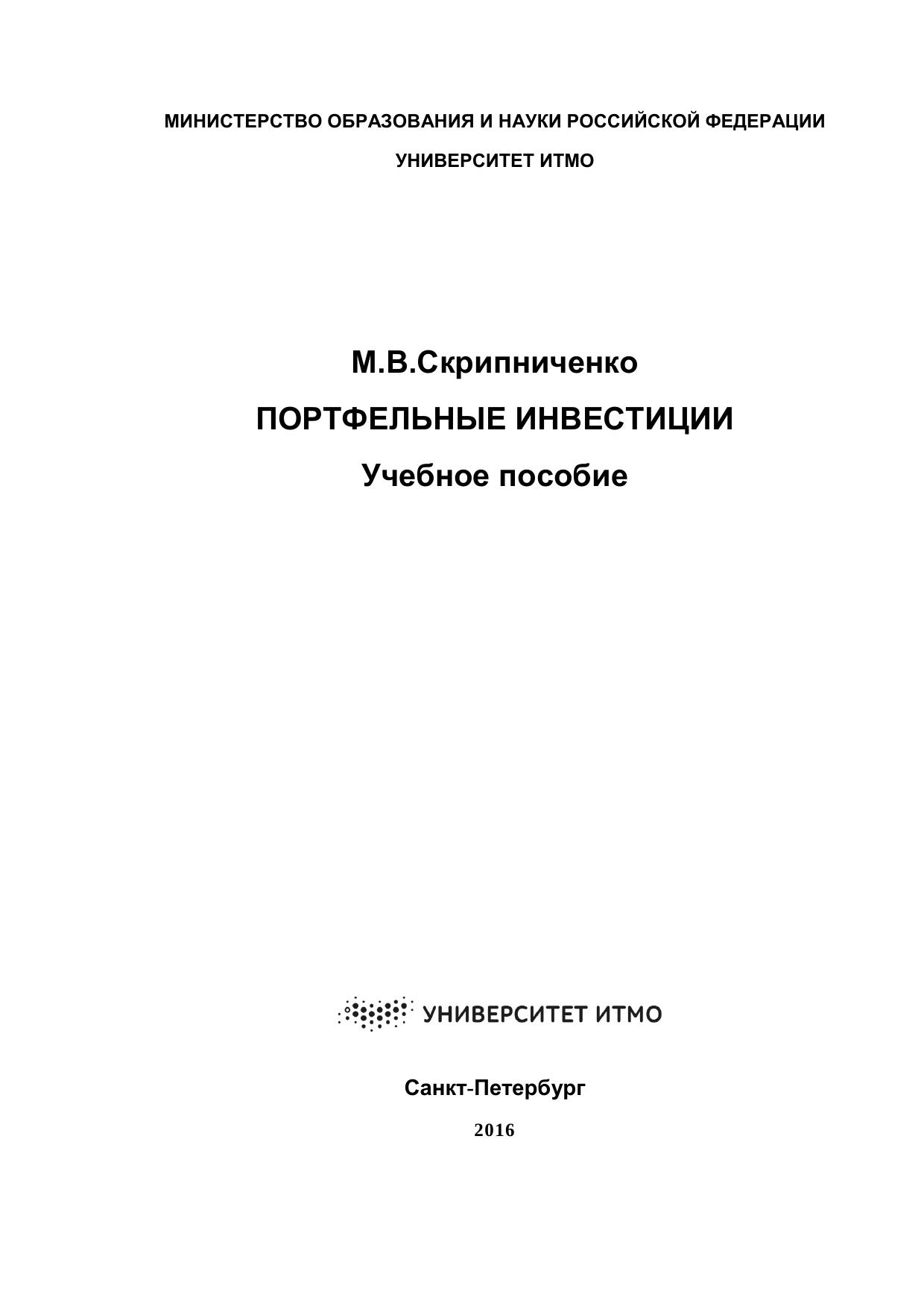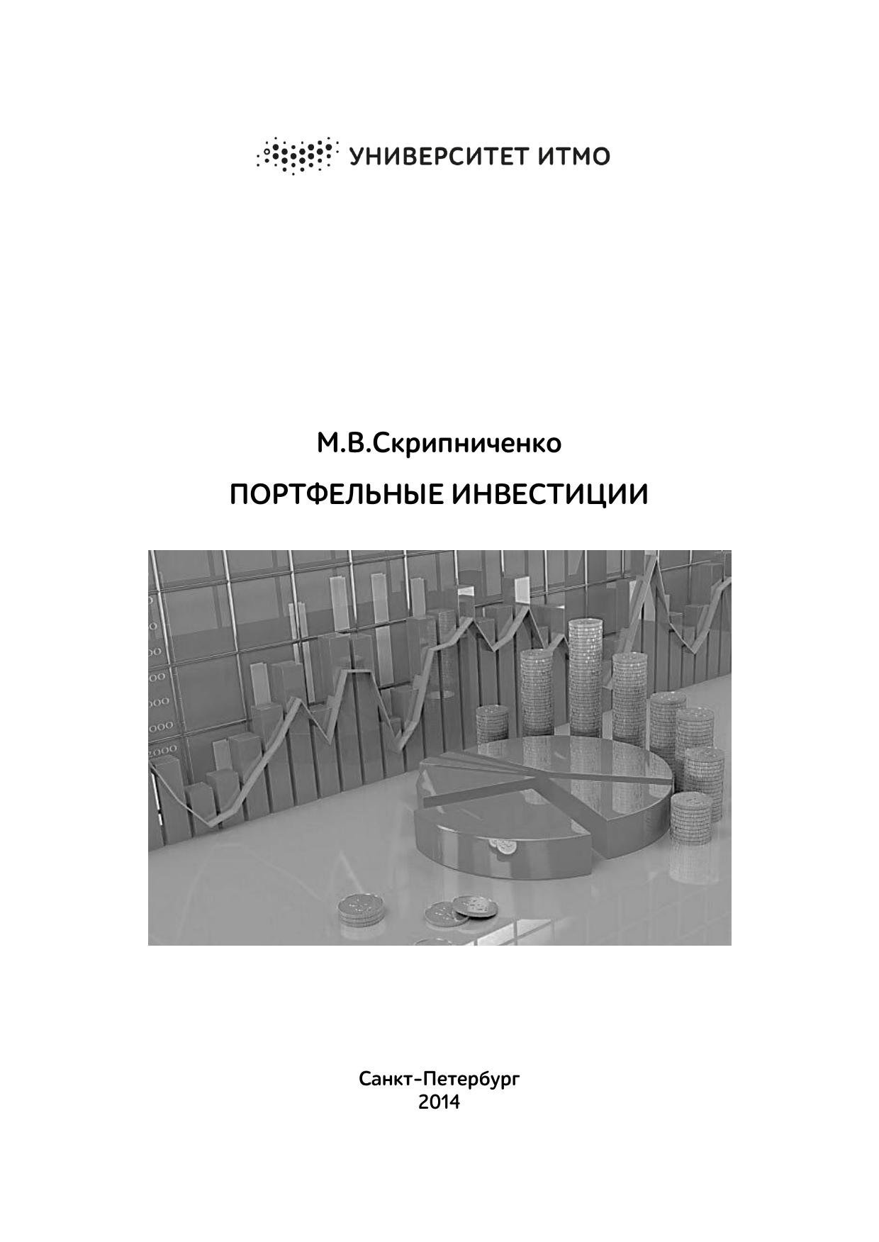 Учебное пособие предназначено для использования в учебном процессе студентами факультета технологического менеджмента и инноваций Университета ИТМО, обучающихся по направлениям 38.03.01 «Экономика» и 38.03.02 «Менеджмент» и изучающих дисциплину «Портфельные инвестиции». Пособие содержит краткий обзор основных понятий теории инвестирования, способов формирования и управления портфелем ценных бумаг, методов расчета доходности и рисков портфеля.