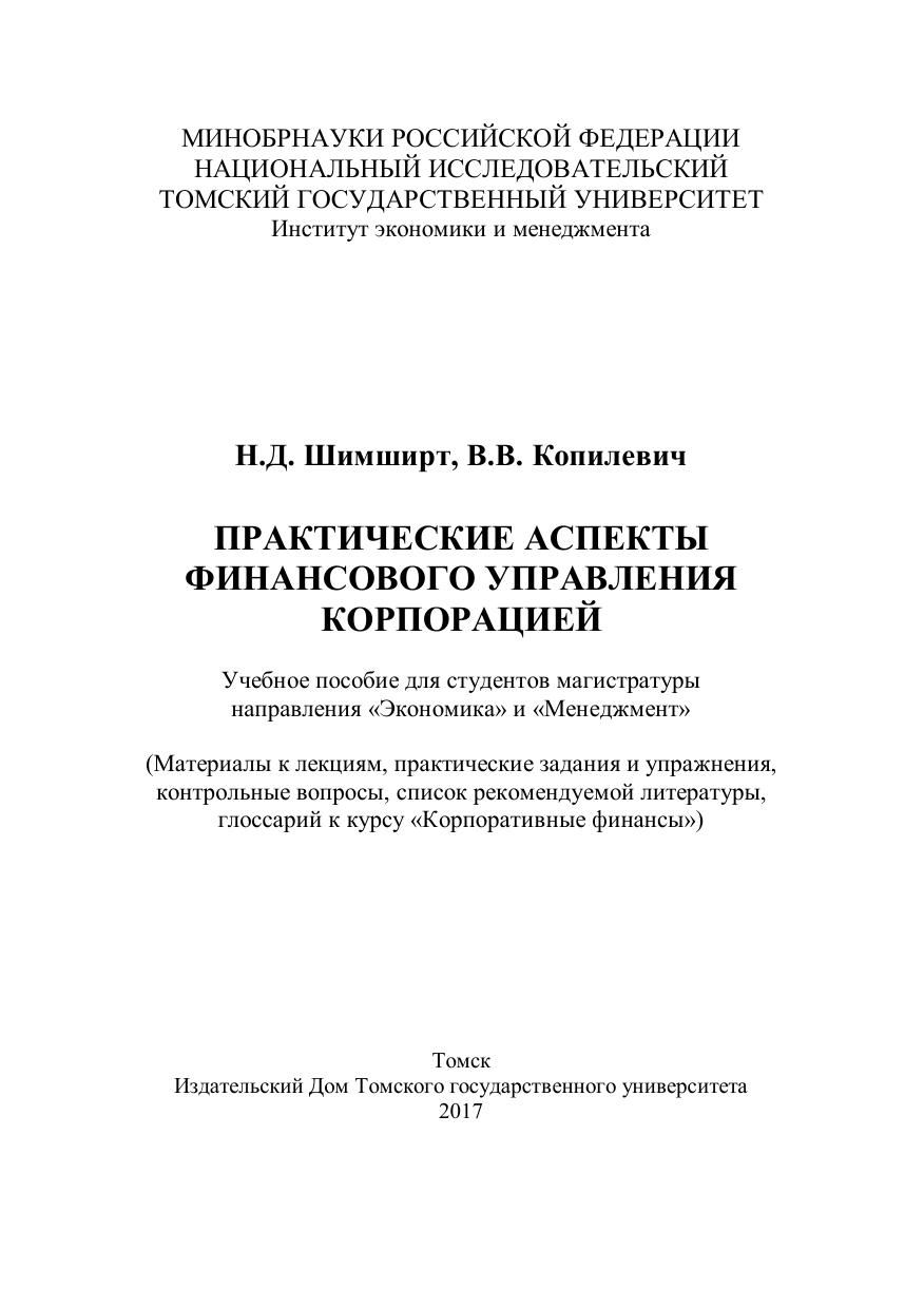 Пособие предназначено для помощи в изучении курса «Корпоративные финансы», в подготовке к практическим занятиям и выполнению индивидуальных проектов. Включает программу курса, краткие материалы к лекции контрольные вопросы, задачи, практические упражнения, список литературы. Для студентов магистратуры Института экономики и менеджмента.