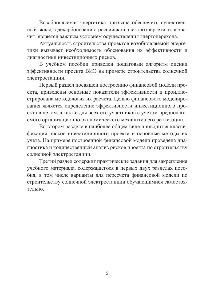 В учебном пособии на практическом примере инвестиционного проекта по строительству солнечной электростанции приводится методика моделирования денежных потоков проекта, анализа его эффектив-ности с позиции всех участников и основные подходы к количественному учету инвестиционных рисков.