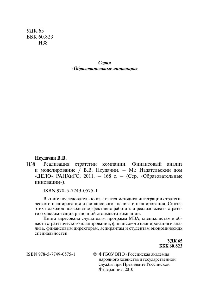 Серия Образовательные инновации. В книге последовательно излагается методика интеграции стратегического планирования и финансового анализа и планирования. Синтез этих подходов позволяет эффективно работать и реализовывать стратегию максимизации рыночной стоимости компании. Книга адресована слушателям программ МВА, специалистам в области стратегического планирования, финансового планирования и анализа, финансовым директорам, аспирантам и студентам экономических специальностей.