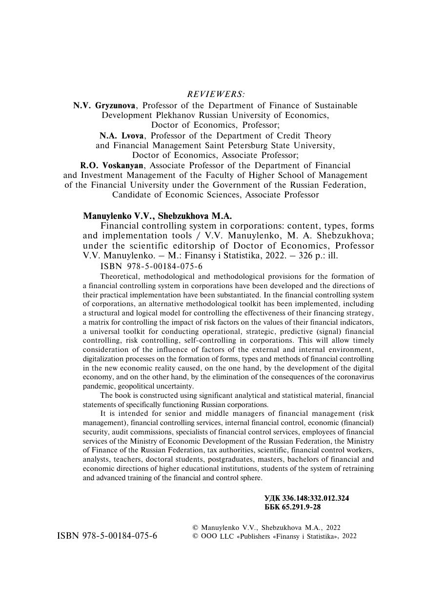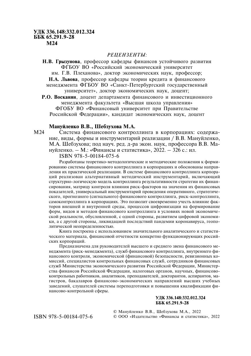 Разработаны теоретико-методологические и методические положения к формированию системы финансового контроллинга в корпорациях и обоснованы направления их практической реализации. В системе финансового контроллинга корпораций реализован альтернативный методический инструментарий, включающий структурно-логическую модель контроллинга результативности стратегии их финансирования, матрицу контроля влияния риск-факторов на значения их финансовых показателей, универсальный инструментарий проведения оперативного, стратегического, прогнозного (сигнального) финансового контроллинга, риск-контроллинга, самоконтроллинга в корпорациях. Это позволит своевременно учесть влияние факторов внешней и внутренней среды, процессов цифровизации на формирование форм, видов и методов финансового контроллинга в условиях новой экономической реальности, обусловленной, с одной стороны, развитием цифровой экономики, а с другой стороны, ликвидацией последствий пандемии коронавируса, геополитической неопределенностью. Книга построена с использованием значительного аналитического и статистического материала, финансовой отчетности конкретно функционирующих российских корпораций. Предназначена для руководителей высшего и среднего звена финансового менеджмента (риск-менеджмента), служб финансового контроллинга, внутреннего финансового контроля, экономической (финансовой) безопасности, ревизионных комиссий, специалистов контрольных финансовых служб, сотрудников финансовых служб Министерства экономического развития Российской Федерации, Министерства финансов Российской Федерации, налоговых органов, научных, финансово-контрольных работников, аналитиков, преподавателей, докторантов, аспирантов, магистров, бакалавров финансово-экономических направлений высших учебных заведений, слушателей системы переподготовки и повышения квалификации финансово-контрольной сферы.