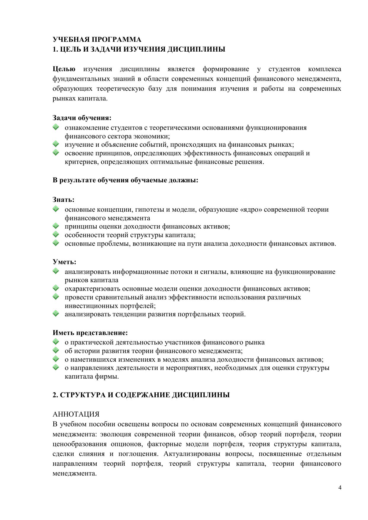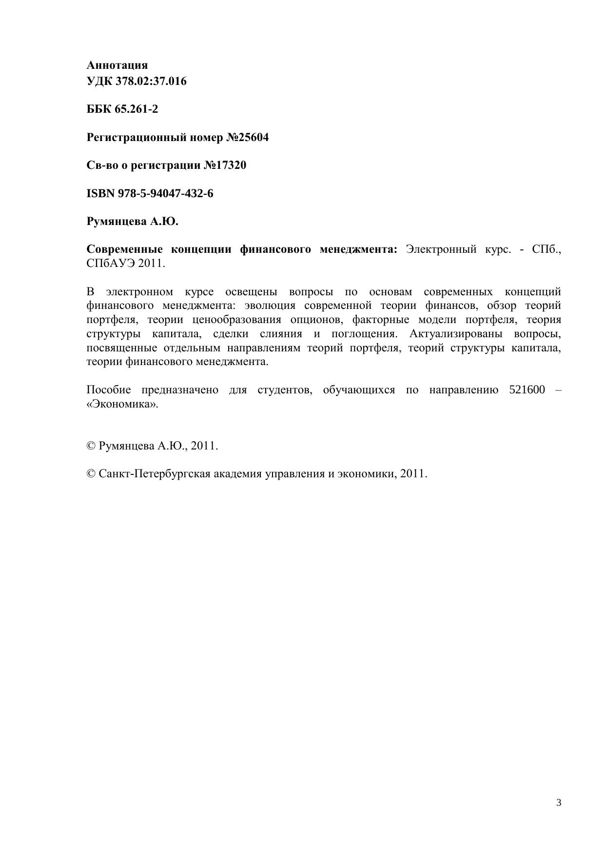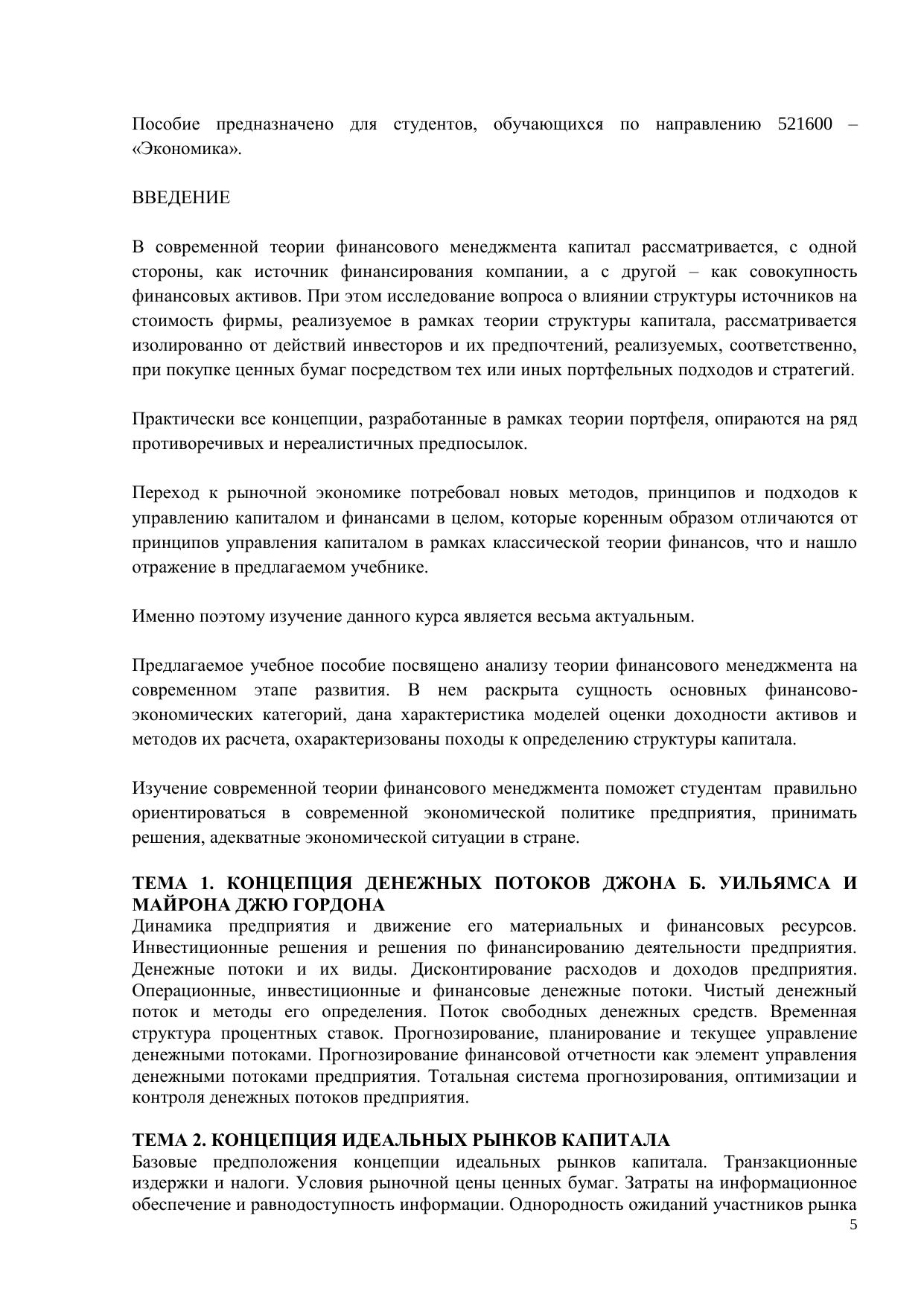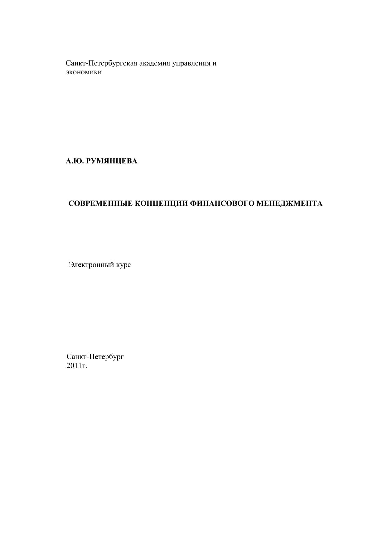 В электронном курсе освещены вопросы по основам современных концепций финансового менеджмента: эволюция современной теории финансов, обзор теорий портфеля, теории ценообразования опционов, факторные модели портфеля, теория структуры капитала, сделки слияния и поглощения. Актуализированы вопросы, посвященные отдельным направлениям теорий портфеля, теорий структуры капитала, теории финансового менеджмента. Пособие предназначено для студентов, обучающихся по направлению 521600 – «Экономика».