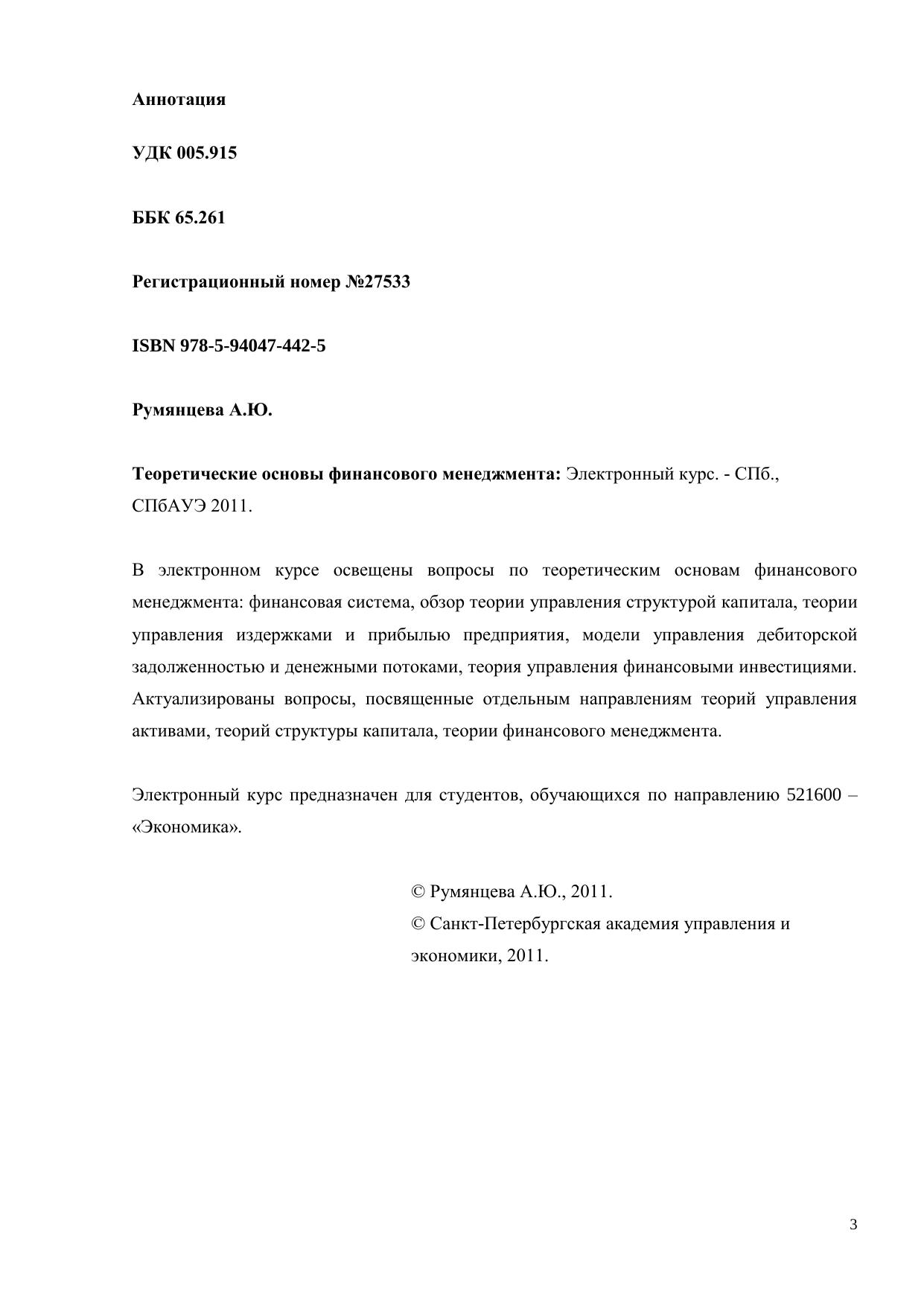 В электронном курсе освещены вопросы по теоретическим основам финансового менеджмента: финансовая система, обзор теории управления структурой капитала, теории управления издержками и прибылью предприятия, модели управления дебиторской задолженностью и денежными потоками, теория управления финансовыми инвестициями. Актуализированы вопросы, посвященные отдельным направлениям теорий управления активами, теорий структуры капитала, теории финансового менеджмента. Электронный курс предназначен для студентов, обучающихся по направлению 521600 – «Экономика».