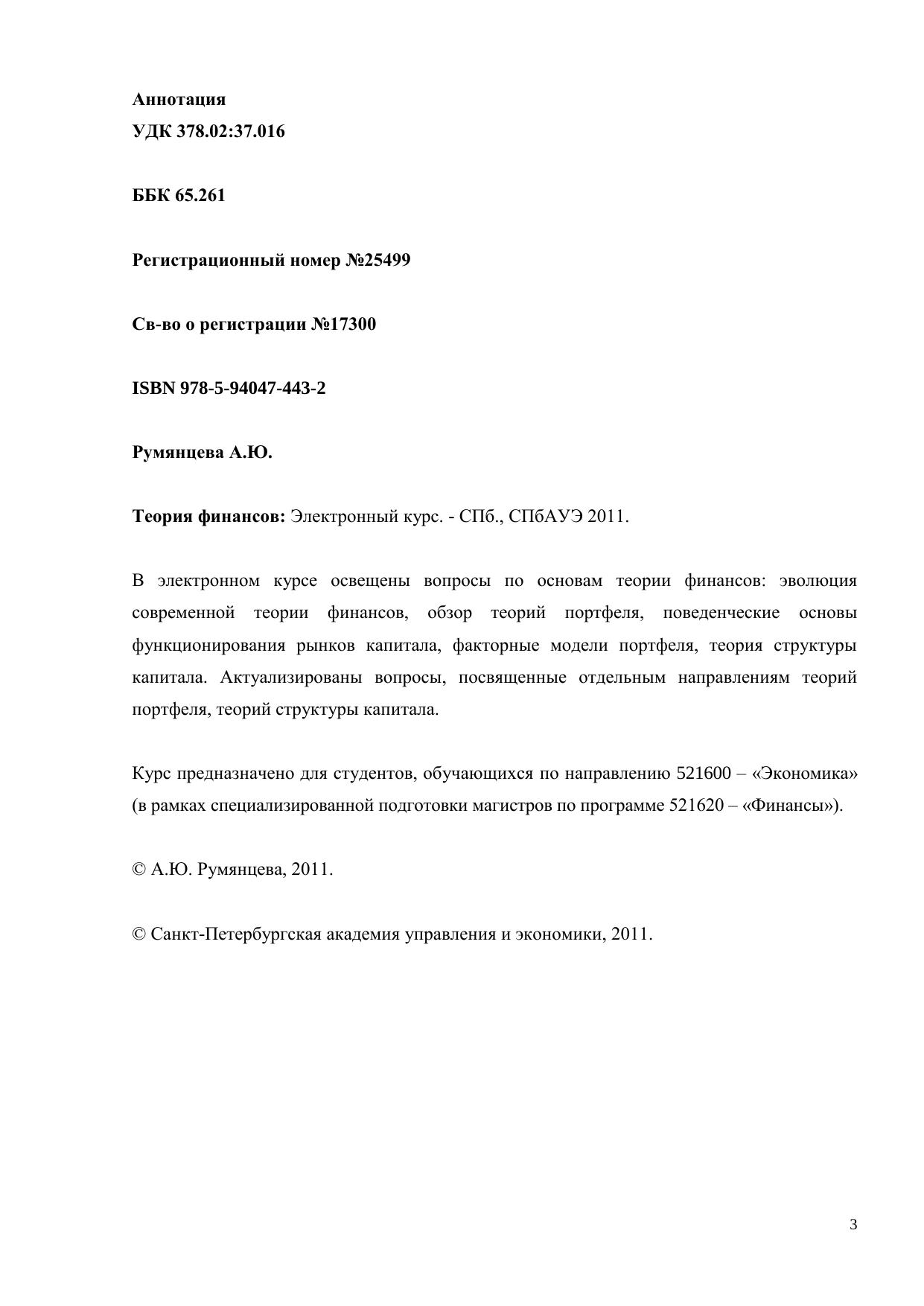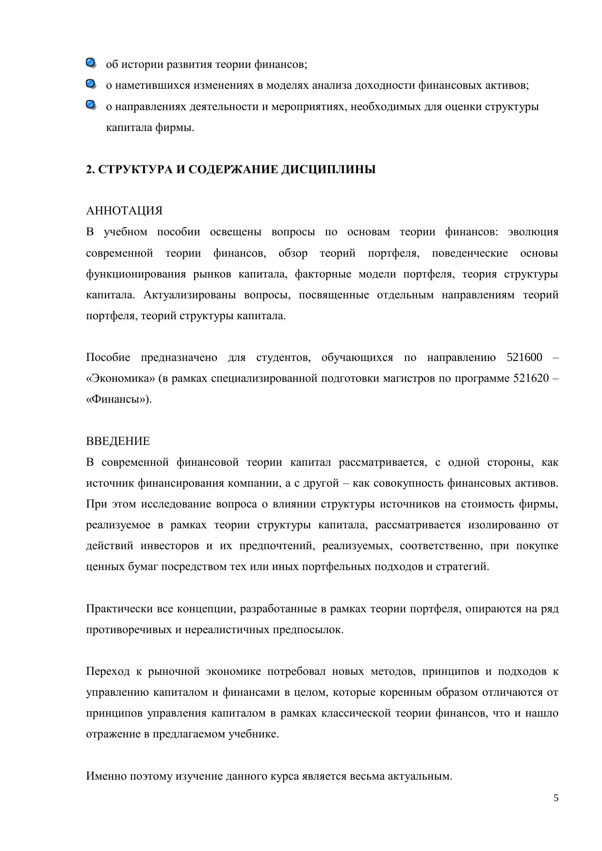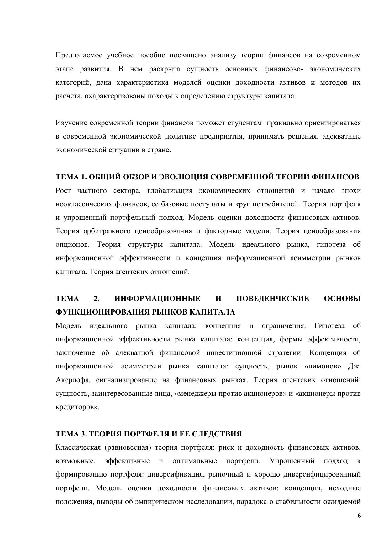 В электронном курсе освещены вопросы по основам теории финансов: эволюция современной теории финансов, обзор теорий портфеля, поведенческие основы функционирования рынков капитала, факторные модели портфеля, теория структуры капитала. Актуализированы вопросы, посвященные отдельным направлениям теорий портфеля, теорий структуры капитала. Курс предназначено для студентов, обучающихся по направлению 521600 – «Экономика» (в рамках специализированной подготовки магистров по программе 521620 – «Финансы»).