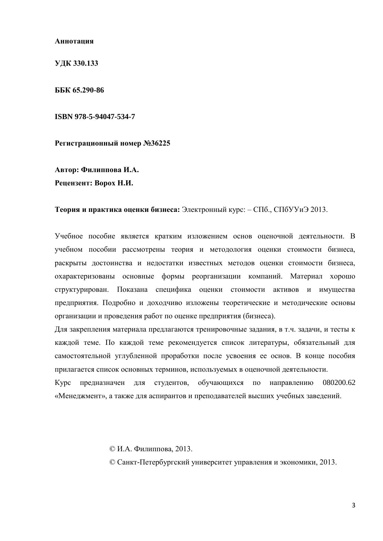 Учебное пособие является кратким изложением основ оценочной деятельности. В учебном пособии рассмотрены теория и методология оценки стоимости бизнеса, раскрыты достоинства и недостатки известных методов оценки стоимости бизнеса, охарактеризованы основные формы реорганизации компаний. Материал хорошо структурирован. Показана специфика оценки стоимости активов и имущества предприятия. Подробно и доходчиво изложены теоретические и методические основы организации и проведения работ по оценке предприятия (бизнеса). Для закрепления материала предлагаются тренировочные задания, в т.ч. задачи, и тесты к каждой теме. По каждой теме рекомендуется список литературы, обязательный для самостоятельной углубленной проработки после усвоения ее основ. В конце пособия прилагается список основных терминов, используемых в оценочной деятельности. Курс предназначен для студентов, обучающихся по направлению 080200.62 «Менеджмент», а также для аспирантов и преподавателей высших учебных заведений.