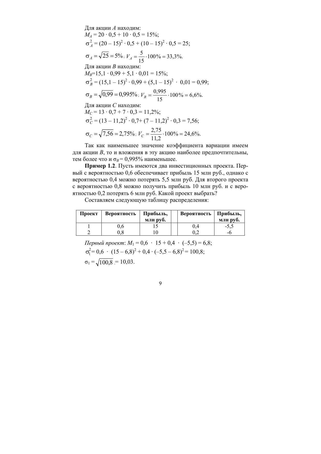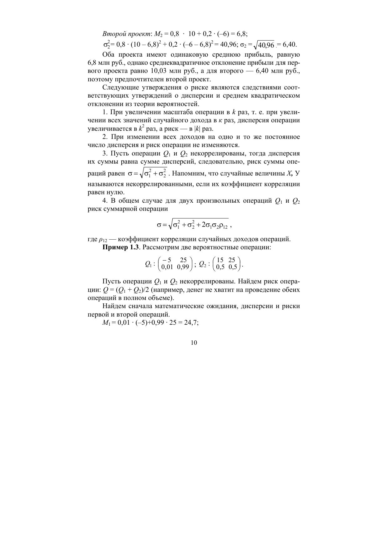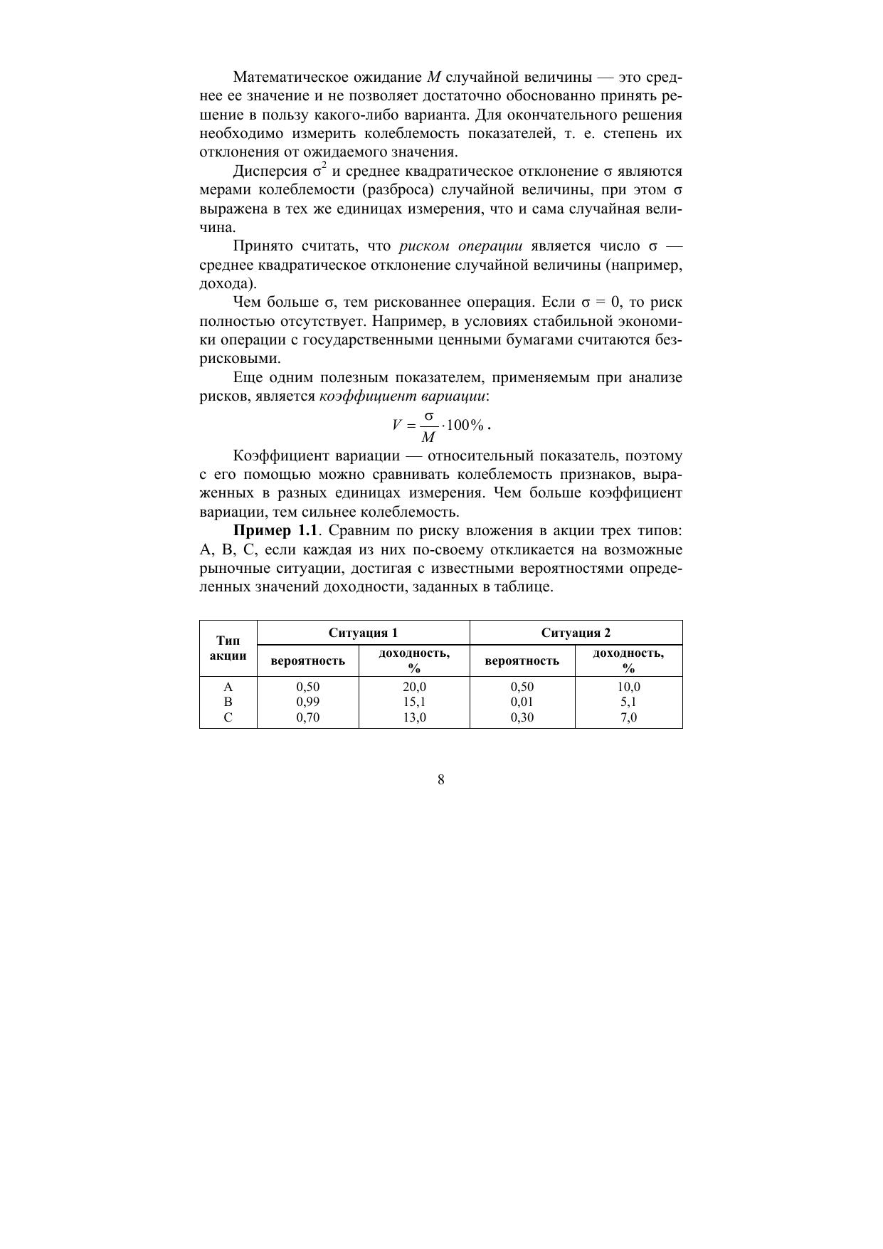 В учебном пособии рассматриваются основы теории принятия рисковых решений, финансовая математика, методы оценки и анализа рисков инвестиционных проектов. Отдельные темы посвящены определению риска финансовых активов, портфельному анализу и ценообразованию на финансовых рынках, методам снижения риска, в том числе хеджированию с помощью опционов, а также анализу финансовой устойчивости и риска фирмы на основе эффекта рычага. По всем темам приведены примеры с подробным решением. Для студентов бакалавриата и специалитета, обучающихся по направлению подготовки ""Экономика"", а также преподавателей экономических вузов.