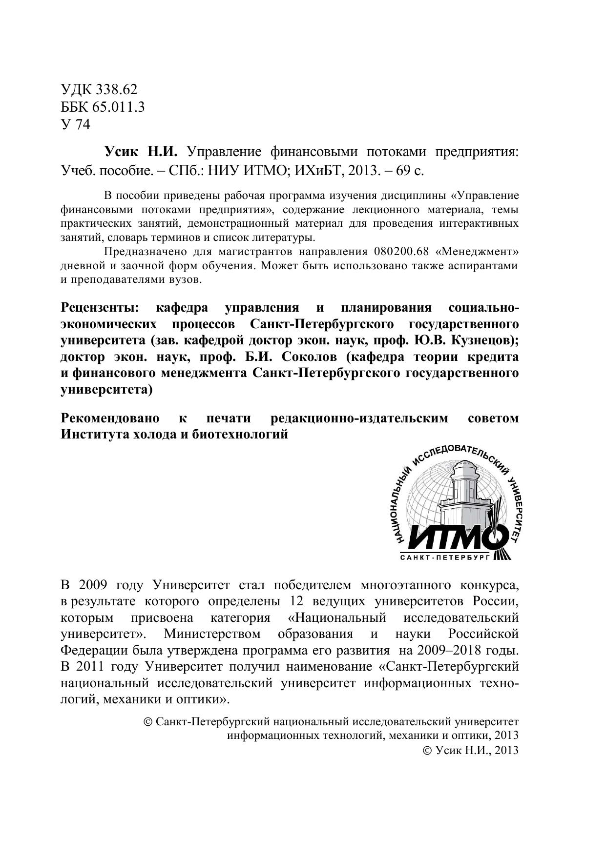 В пособии приведены рабочая программа изучения дисциплины «Управление финансовыми потоками предприятия», содержание лекционного материала, темы практических занятий, демонстрационный материал для проведения интерактивныхзанятий, словарь терминов и список литературы. Предназначено для магистрантов направления 080200.68 «Менеджмент» дневной и заочной форм обучения. Может быть использовано также аспирантами и преподавателями вузов.
