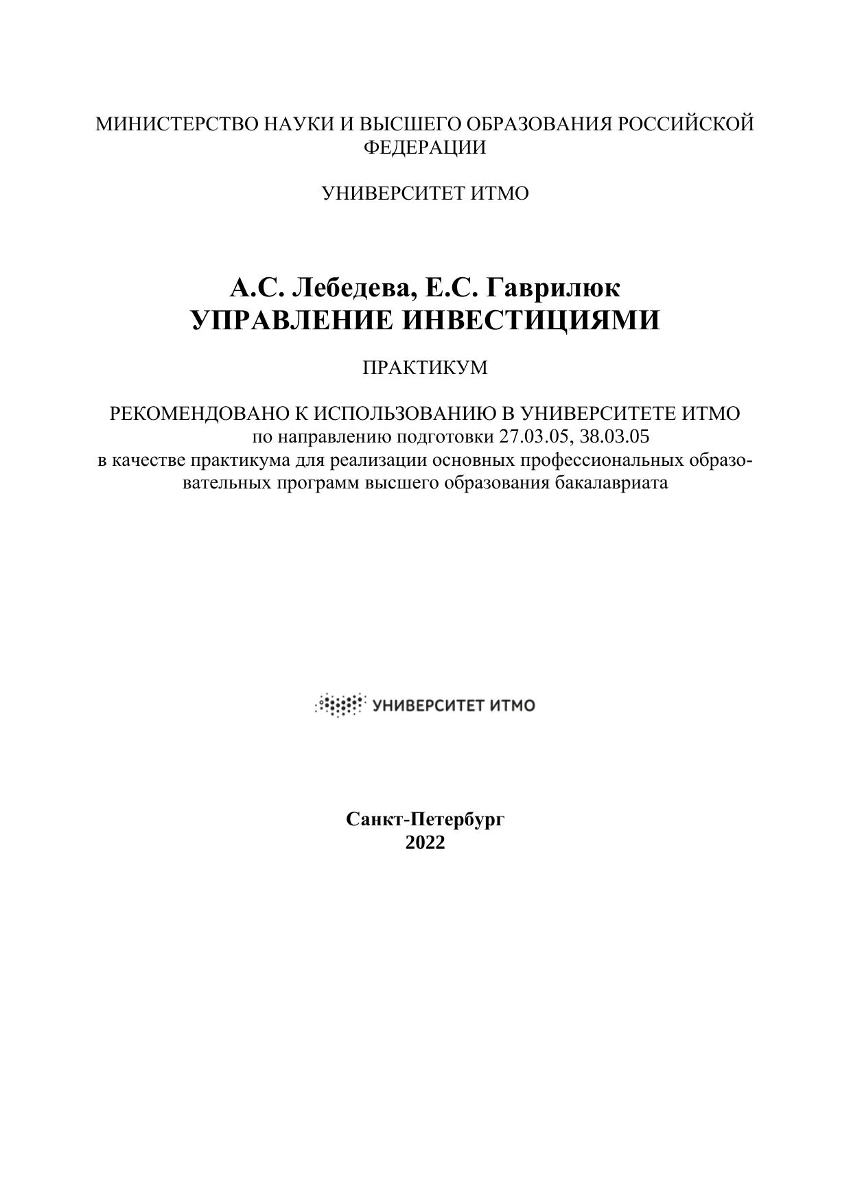 В практикуме представлены краткие теоретические положения и практические задания для обучения студентов бакалавриата по направлению подготовки 27.03.05 Инноватика, 38.03.05 Бизнес-информатика в рамках дисциплины «Управление инвестициями», а также отдельных разделов других дисциплин, связанных с оценкой целесообразности реализации и экономической эффективности инновационных проектов. Представленные материалы могут быть использованы как для проведения практических занятий с целью систематизации и закрепления теоретических знаний, организации самостоятельной работы студентов, так и для осуществления промежуточного контроля уровня освоения компетенций дисциплины. Разнообразные формы заданий обеспечивают возможность реализации персонифицированного подхода в обучении студентов с учетом индивидуальных предпочтений в отношении форм закрепления теоретического материала.