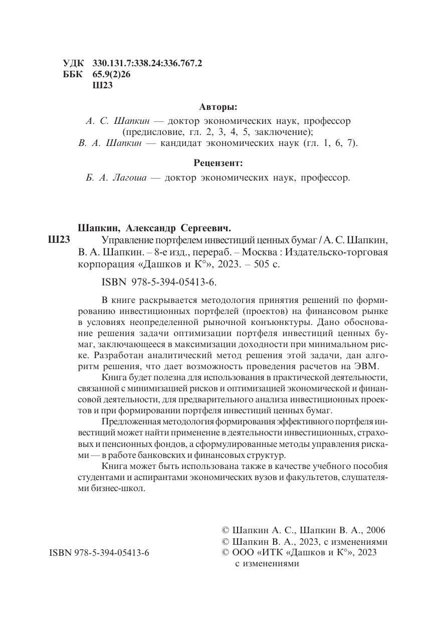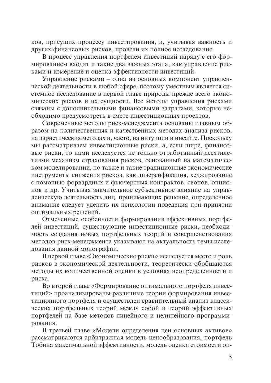 В книге раскрывается методология принятия решений по формированию инвестиционных портфелей (проектов) на финансовом рынке в условиях неопределенной рыночной конъюнктуры. Дано обоснование решения задачи оптимизации портфеля инвестиций ценных бумаг, заключающееся в максимализации доходности при минимальном риске. Разработан аналитический метод решения этой задачи, дан алгоритм решения, что дает возможность проведения расчетов на ЭВМ.