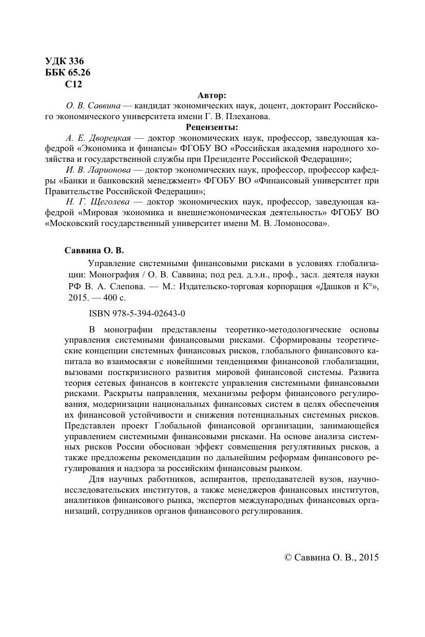 В монографии представлены теоретико-методологические основы управления системными финансовыми рисками. Сформированы теоретические концепции системных финансовых рисков, глобального финансового капитала во взаимосвязи с новейшими тенденциями финансовой глобализации, вызовами посткризисного развития мировой финансовой системы. Развита теория сетевых финансов в контексте управления системными финансовыми рисками. Раскрыты направления, механизмы реформ регулирования, модернизация национальных финансовых систем в целях обеспечения их финансовой устойчивости и снижения потенциальных системных рисков. Представлен проект Глобальной финансовой организации, занимающейся управлением системными рисками. На основе анализа системных рисков России обоснован эффект совмещения регулятивных рисков, а также предложены рекомендации по дальнейшим реформам финансового регулирования надзора за российским финансовым рынком. Для научных работников, аспирантов, преподавателей вузов, научно-исследовательских институтов, аналитиков финансового рынка, экспертов международных финансовых организаций, сотрудников органов финансового регулирования.