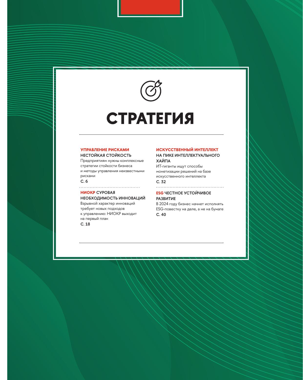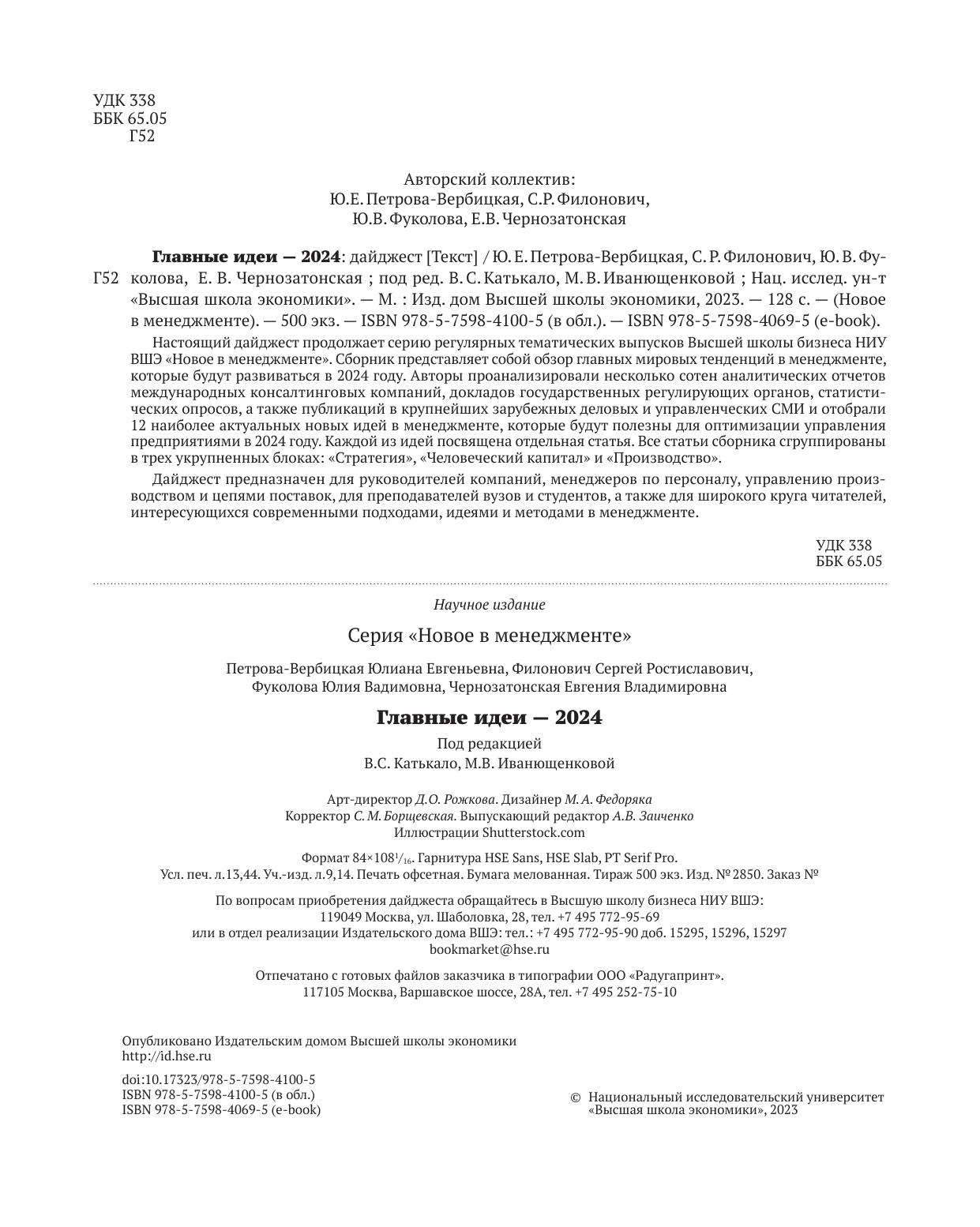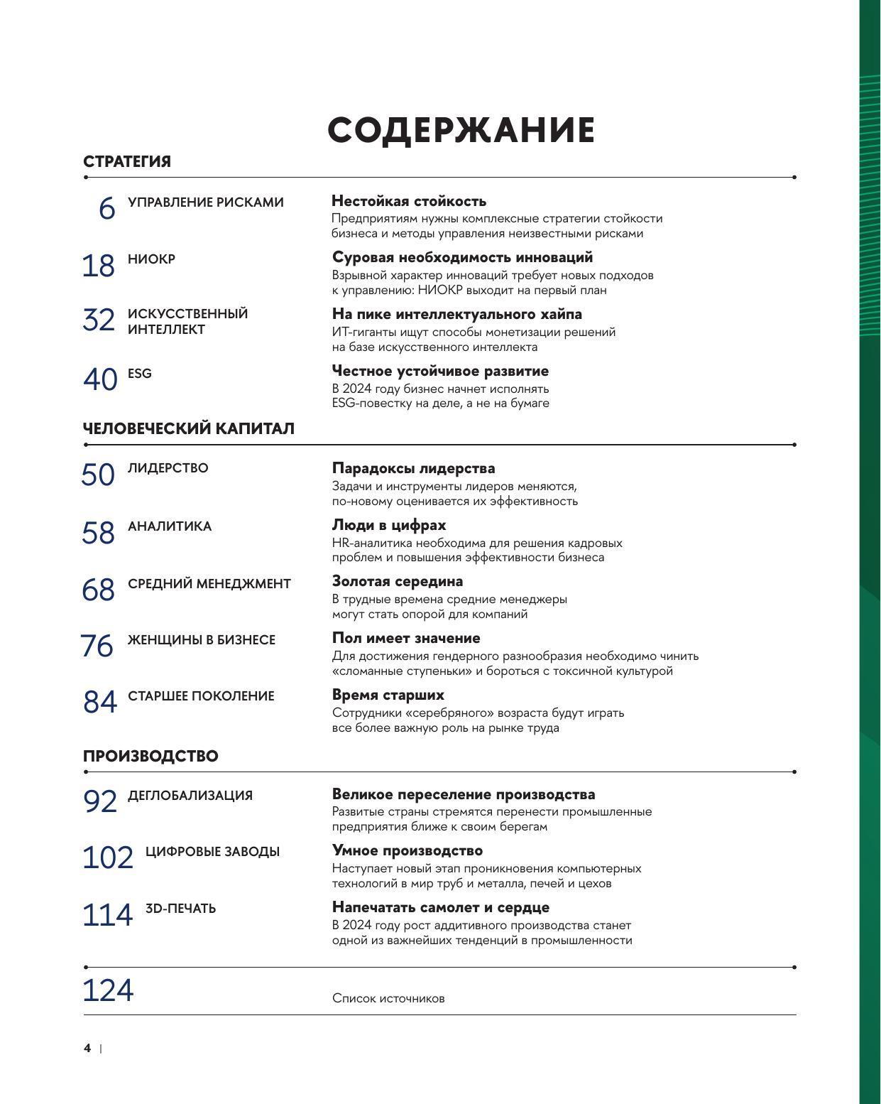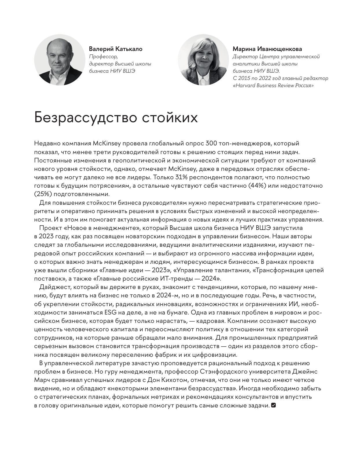 Настоящий дайджест продолжает серию регулярных тематических выпусков Высшей школы бизнеса НИУ ВШЭ "Новое в менеджменте". Сборник представляет собой обзор главных мировых тенденций в менеджменте, которые будут развиваться в 2024 году. Авторы проанализировали несколько сотен аналитических отчетов международных консалтинговых компаний, докладов государственных регулирующих органов, статистических опросов, а также публикаций в крупнейших зарубежных деловых и управленческих СМИ и отобрали 12 наиболее актуальных новых идей в менеджменте, которые будут полезны для оптимизации управления предприятиями в 2024 году. Каждой из идей посвящена отдельная статья. Все статьи сборника сгруппированы в трех укрупненных блоках: "Стратегия", "Человеческий капитал" и "Производство".