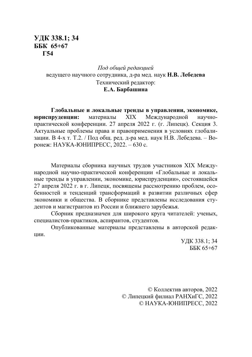 Глобальные и локальные тренды в управлении, экономике, юриспруденции: материалы ХIX Международной научно-практической конференции. 27 апреля 2022 г. (г. Липецк). Секция 3. Актуальные проблемы права и правоприменения в условиях глобализации. В 4-х т. Т. 2