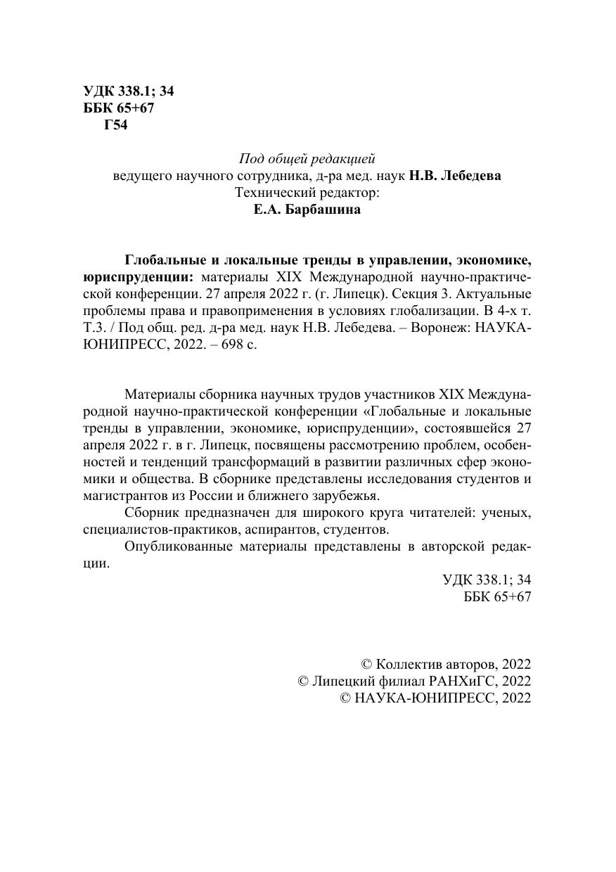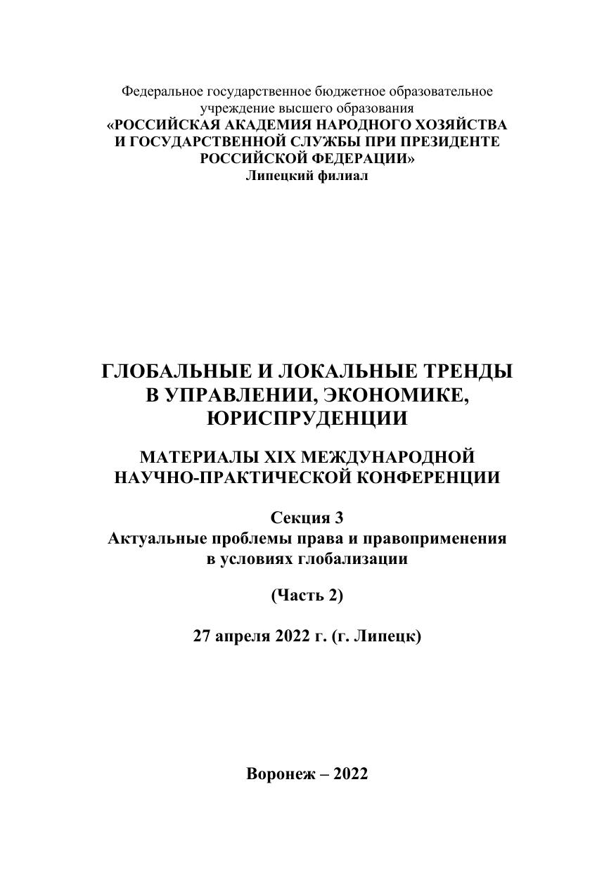 Глобальные и локальные тренды в управлении, экономике, юриспруденции: материалы ХIX Международной научно-практической конференции. 27 апреля 2022 г. (г. Липецк). Секция 3. Актуальные проблемы права и правоприменения в условиях глобализации. В 4-х т. Т. 3