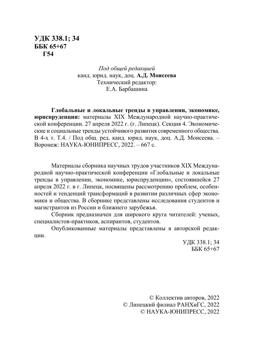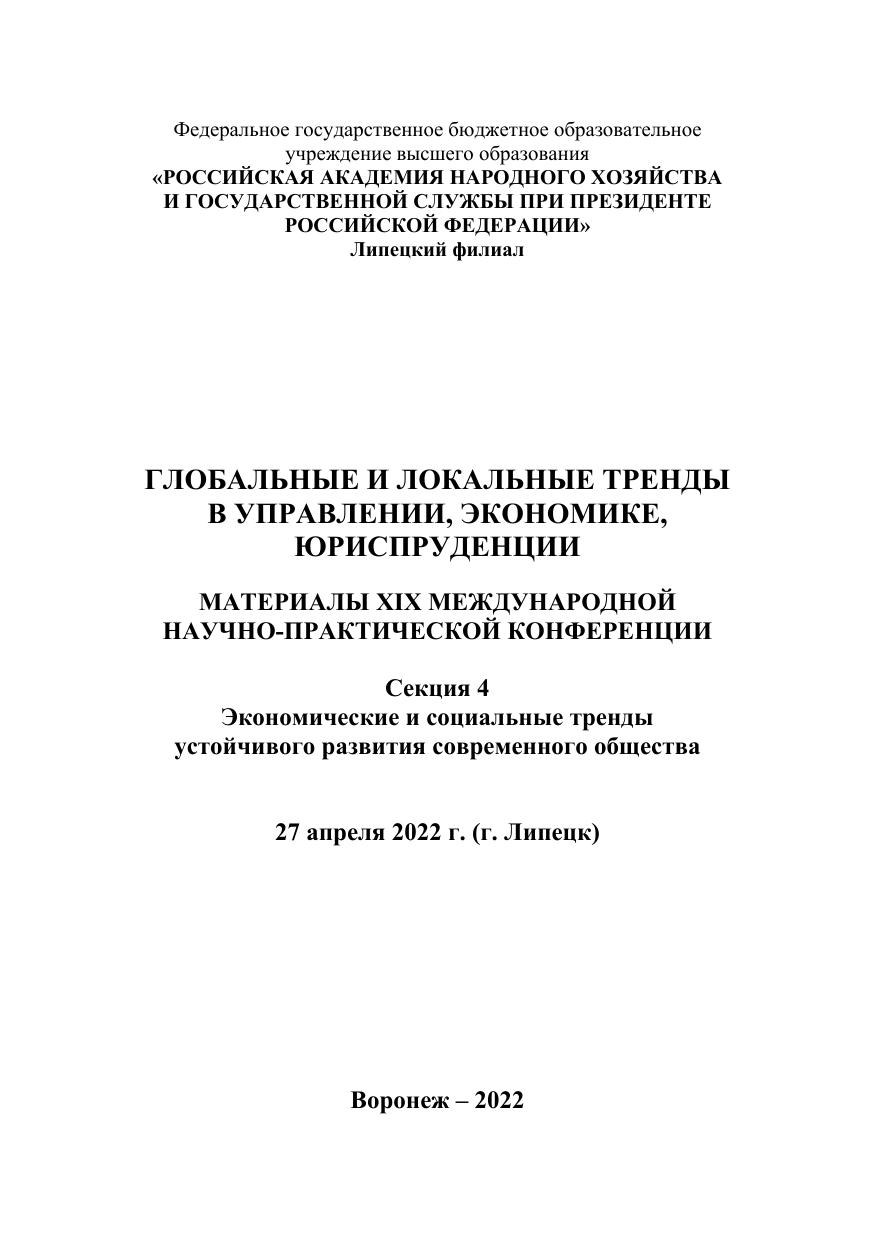 Глобальные и локальные тренды в управлении, экономике, юриспруденции: материалы ХIX Международной научно-практической конференции. 27 апреля 2022 г. (г. Липецк). Секция 4. Экономические и социальные тренды устойчивого развития современного общества. В 4-х т. Т. 4