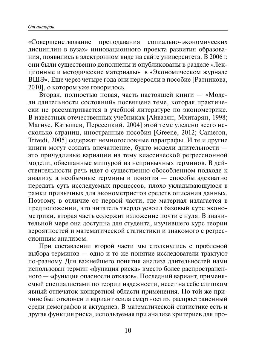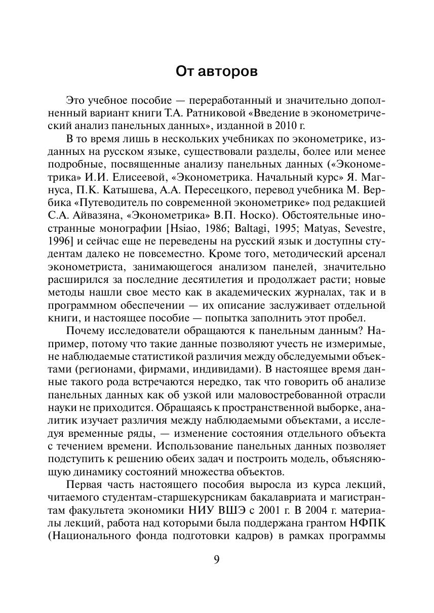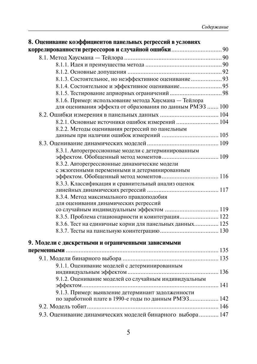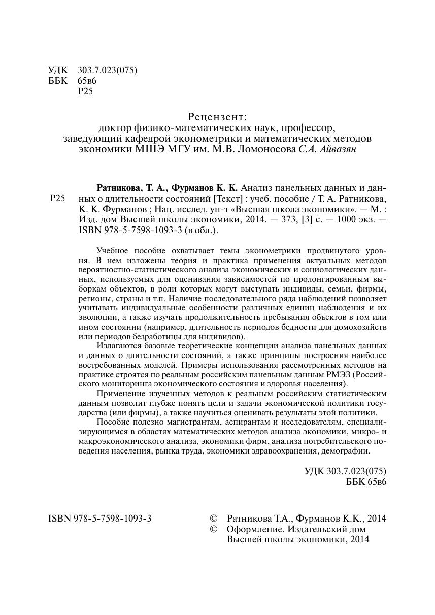 Учебное пособие охватывает темы эконометрики продвинутого уровня. В нем изложены теория и практика применения актуальных методов вероятностно-статистического анализа экономических и социологических данных, используемых для оценивания зависимостей по пролонгированным выборкам объектов, в роли которых могут выступать индивиды, семьи, фирмы, регионы, страны и т.п. Наличие последовательного ряда наблюдений позволяет учитывать индивидуальные особенности различных единиц наблюдения и их эволюции, а также изучать продолжительность пребывания объектов в том или ином состоянии (например, длительность периодов бедности для домохозяйств или периодов безработицы для индивидов). Излагаются базовые теоретические концепции анализа панельных данных и данных о длительности состояний, а также принципы построения наиболее востребованных моделей. Примеры использования рассмотренных методов на практике строятся по реальным российским панельным данным РМЭЗ (Российского мониторинга экономического состояния и здоровья населения). Применение изученных методов к реальным российским статистическим данным позволит глубже понять цели и задачи экономической политики государства (или фирмы), а также научиться оценивать результаты этой политики. Пособие полезно магистрантам, аспирантам и исследователям, специализирующимся в областях математических методов анализа экономики, микро- и макроэкономического анализа, экономики фирм, анализа потребительского поведения населения, рынка труда, экономики здравоохранения, демографии.