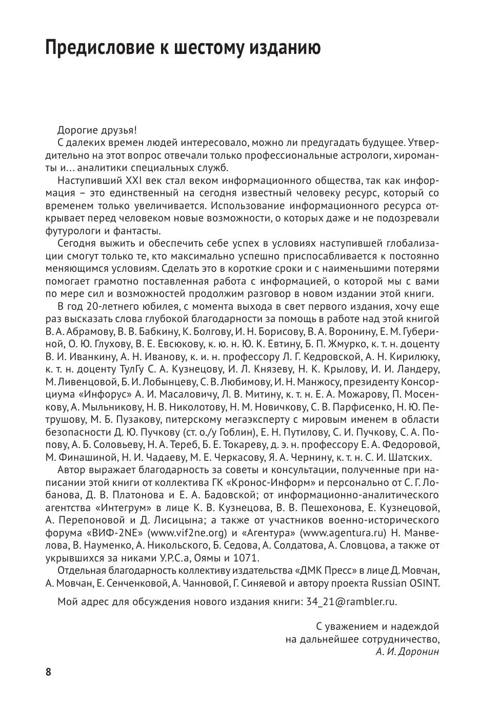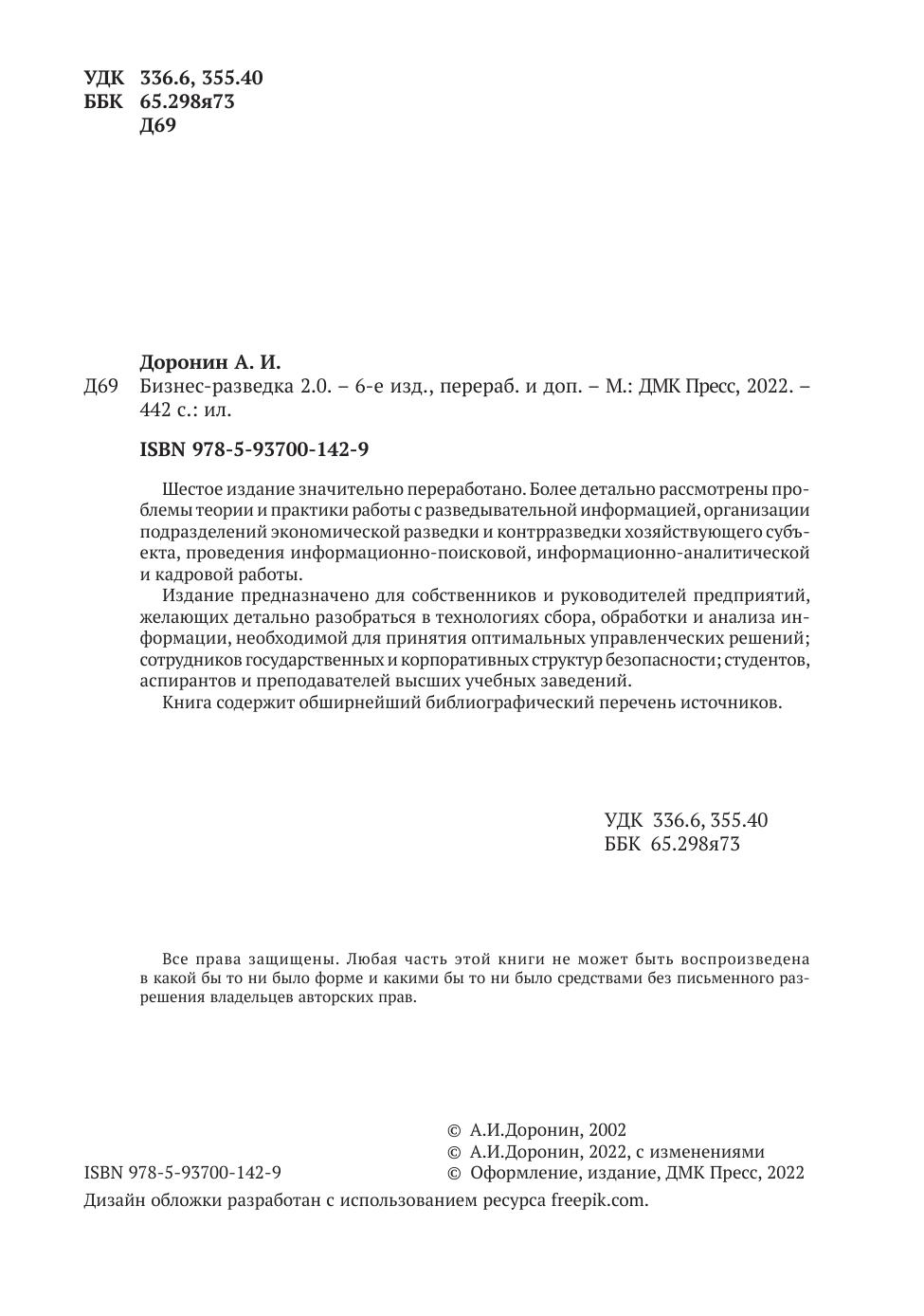 Издание является по-своему уникальным: предлагая четкие технические и организационные решения сложнейших вопросов, книга читается так же легко, как беллетристика. Она рекомендуется не только специалистам соответствующих структур, но и всем читателям, учитывающим значение разведки для эффективности бизнеса.