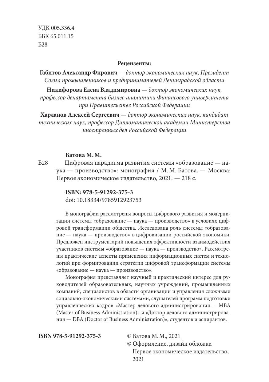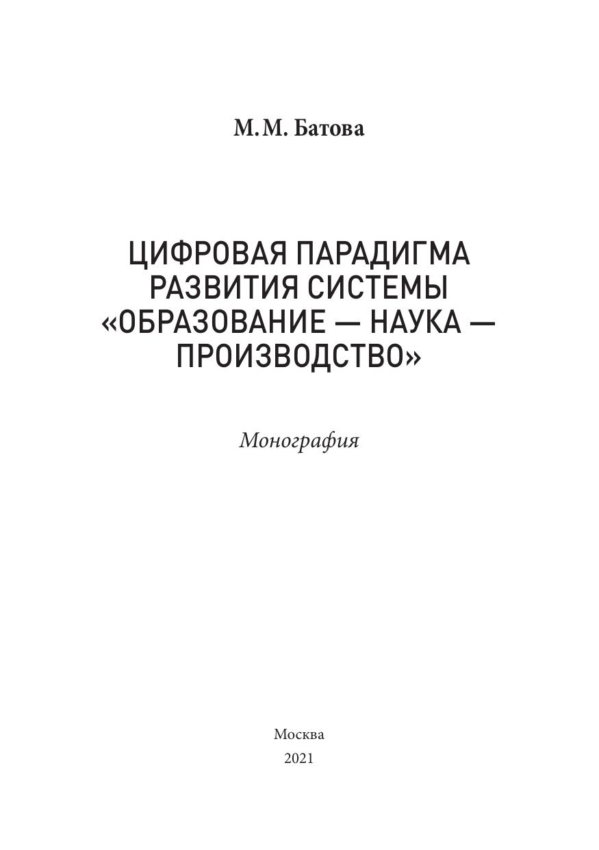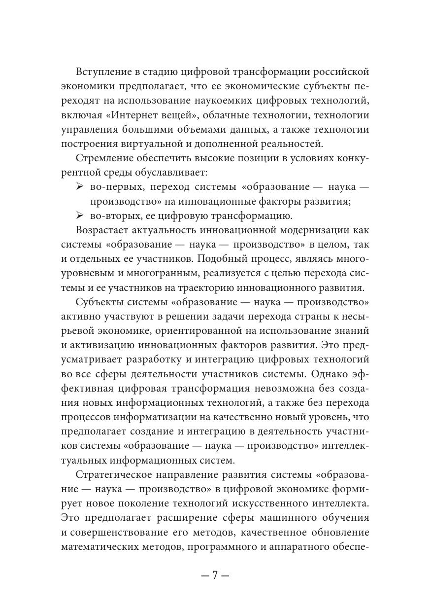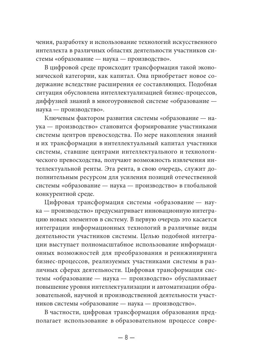 В монографии рассмотрены вопросы цифрового развития и модернизации системы «образование – наука – производство» в условиях цифровой трансформации общества. Исследована роль системы «образование – наука – производство» в цифровизации российской экономики. Предложен инструментарий повышения эффективности взаимодействия участников системы «образование – наука – производство». Рассмотрены практические аспекты применения информационных систем и технологий при формировании стратегии цифровой трансформации системы «образование – наука – производство».