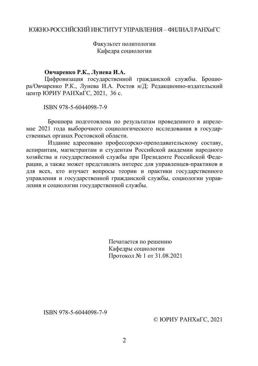 Брошюра подготовлена по результатам проведенного в апрелемае 2021 года выборочного социологического исследования в государственных органах Ростовской области. Издание адресовано профессорско-преподавательскому составу, аспирантам, магистрантам и студентам Российской академии народного хозяйства и государственной службы при Президенте Российской Федерации, а также может представлять интерес для управленцев-практиков и для всех, кто изучает вопросы теории и практики государственного управления и государственной гражданской службы, социологии управления и социологии государственной службы.