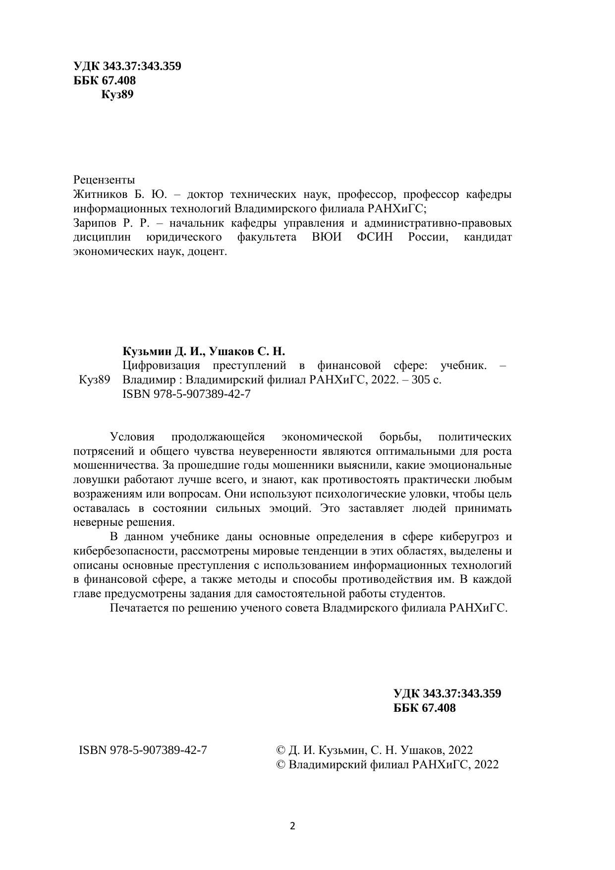 Условия продолжающейся экономической борьбы, политических потрясений и общего чувства неуверенности являются оптимальными для роста мошенничества. За прошедшие годы мошенники выяснили, какие эмоциональные ловушки работают лучше всего, и знают, как противостоять практически любым возражениям или вопросам. Они используют психологические уловки, чтобы цель оставалась в состоянии сильных эмоций. Это заставляет людей принимать неверные решения. В данном учебнике даны основные определения в сфере киберугроз и кибербезопасности, рассмотрены мировые тенденции в этих областях, выделены и описаны основные преступления с использованием информационных технологий в финансовой сфере, а также методы и способы противодействия им. В каждой главе предусмотрены задания для самостоятельной работы студентов. Печатается по решению ученого совета Владмирского филиала РАНХиГС.