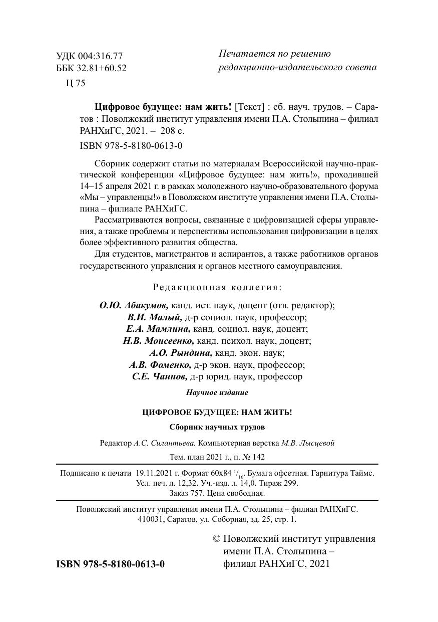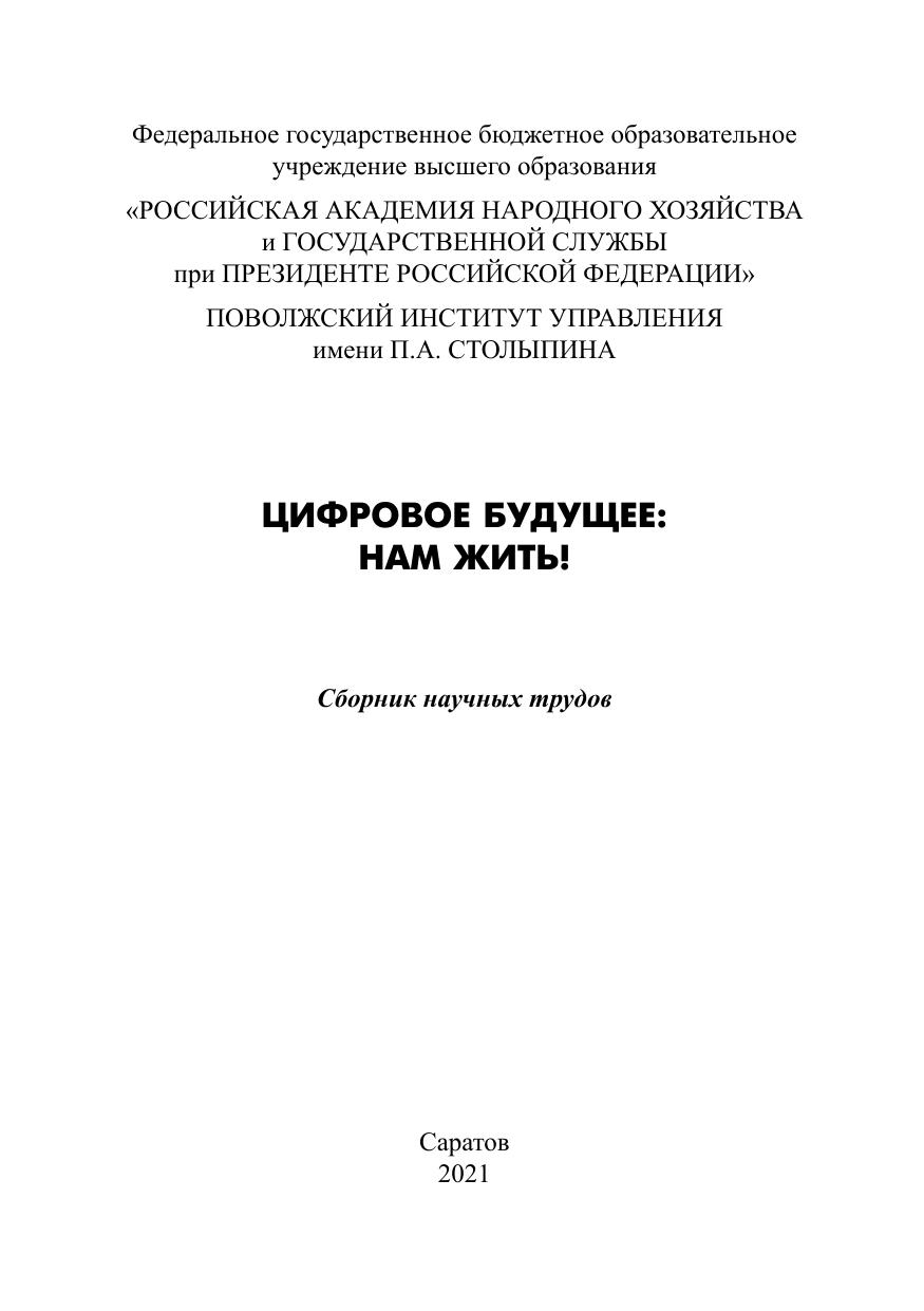 Сборник содержит статьи по материалам Всероссийской научно-практической конференции «Цифровое будущее: нам жить!», проходившей 14–15 апреля 2021 г. в рамках молодежного научно-образовательного форума «Мы – управленцы!» в Поволжском институте управления имени П.А. Столыпина – филиале РАНХиГС. Рассматриваются вопросы, связанные с цифровизацией сферы управления, а также проблемы и перспективы использования цифровизации в целях более эффективного развития общества. Для студентов, магистрантов и аспирантов, а также работников органов государственного управления и органов местного самоуправления.