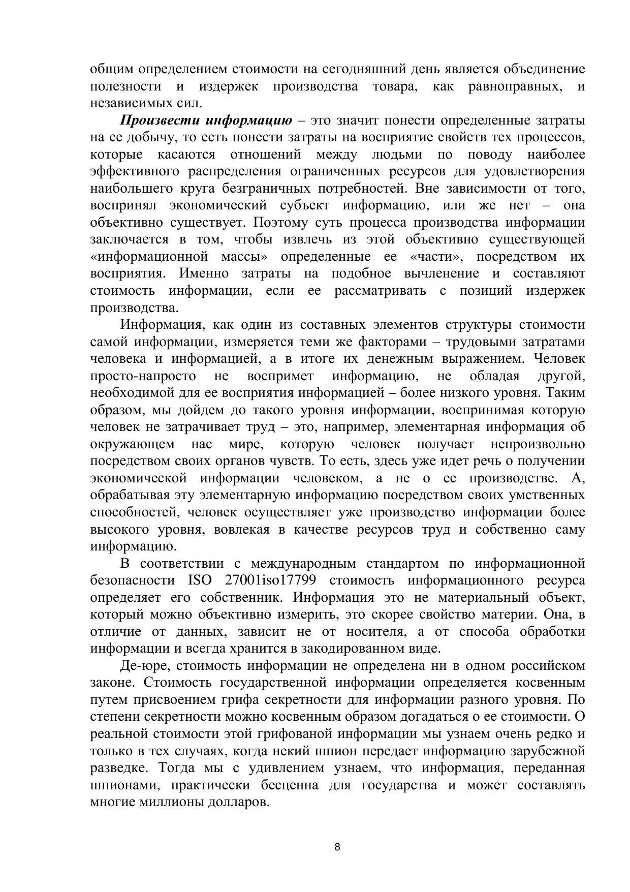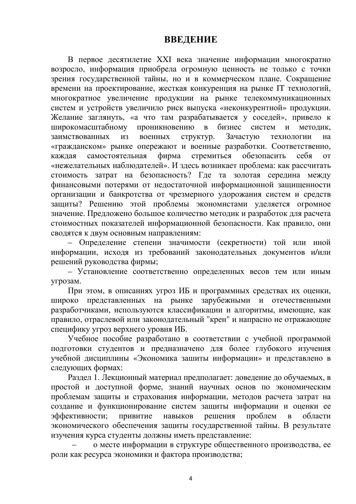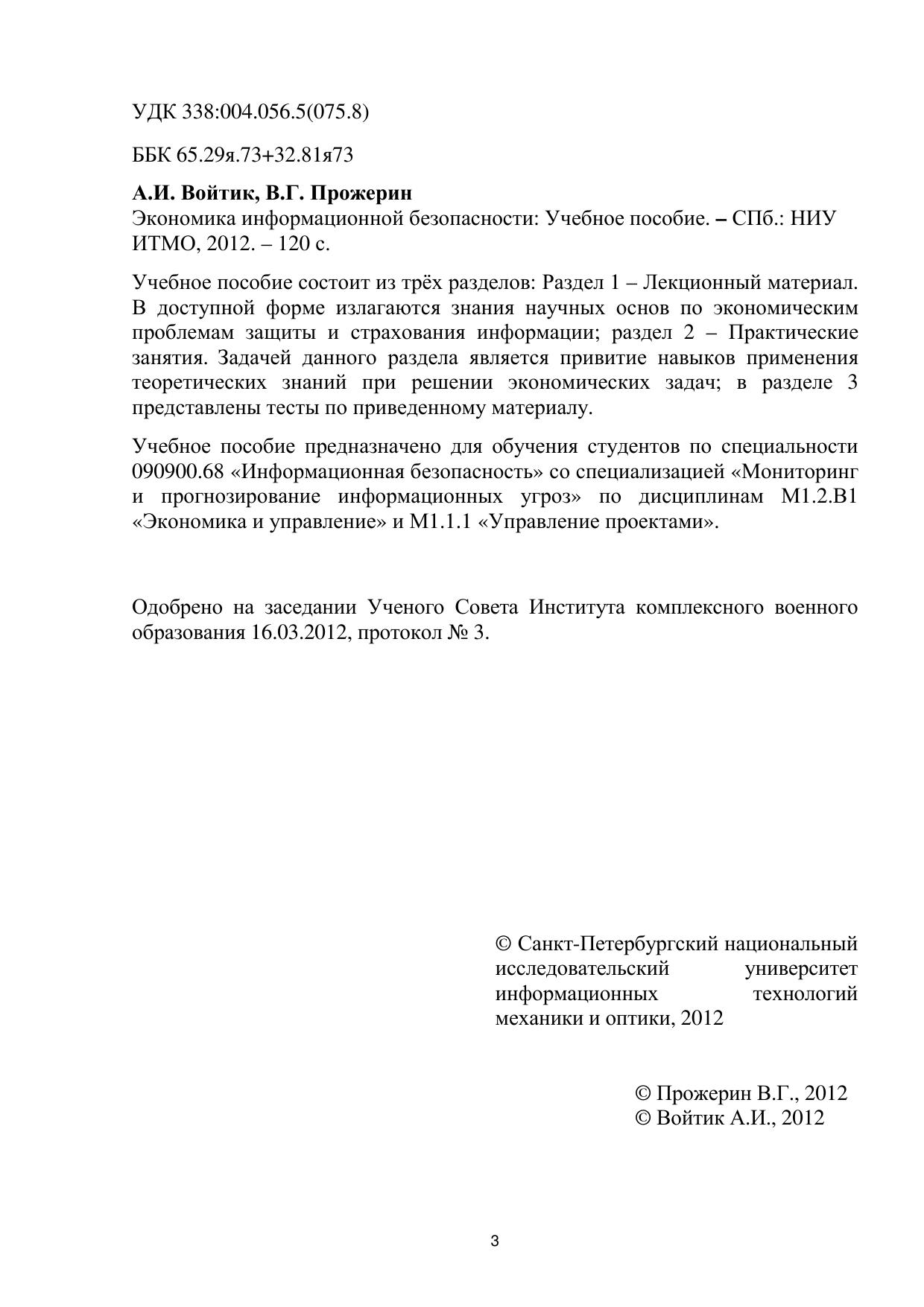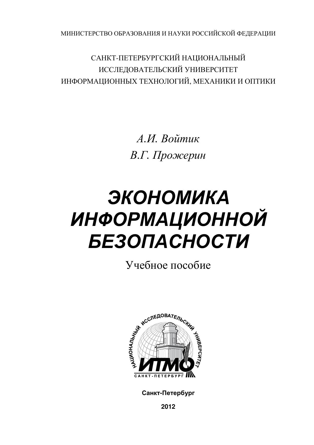 Учебное пособие состоит из трёх разделов: Раздел 1 – Лекционный материал. В доступной форме излагаются знания научных основ по экономическим проблемам защиты и страхования информации раздел 2 – Практические занятия. Задачей данного раздела является привитие навыков применения теоретических знаний при решении экономических задач в разделе 3 представлены тесты по приведенному материалу. Учебное пособие предназначено для обучения студентов по специальности090900.68 «Информационная безопасность» со специализацией «Мониторинг и прогнозирование информационных угроз» по дисциплинам М1.2.В1 «Экономика и управление» и М1.1.1 «Управление проектами».