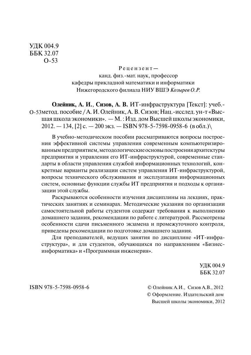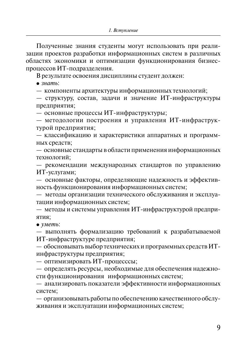 систем, основные функции службы ИТ предприятия и подходы к организации этой службы. Раскрываются особенности изучения дисциплины на лекциях, практических занятиях и семинарах. Методические указания по организации самостоятельной работы студентов содержат требования к выполнению домашнего задания, рекомендации по работе с литературой. Рассмотрены особенности сдачи письменного экзамена и промежуточного контроля, приведены рекомендации по подготовке домашнего задания. Для преподавателей, ведущих занятия по дисциплине «ИТ-инфраструктура», и для студентов, обучающихся по направлениям «Бизнес-информатика» и «Программная инженерия».
