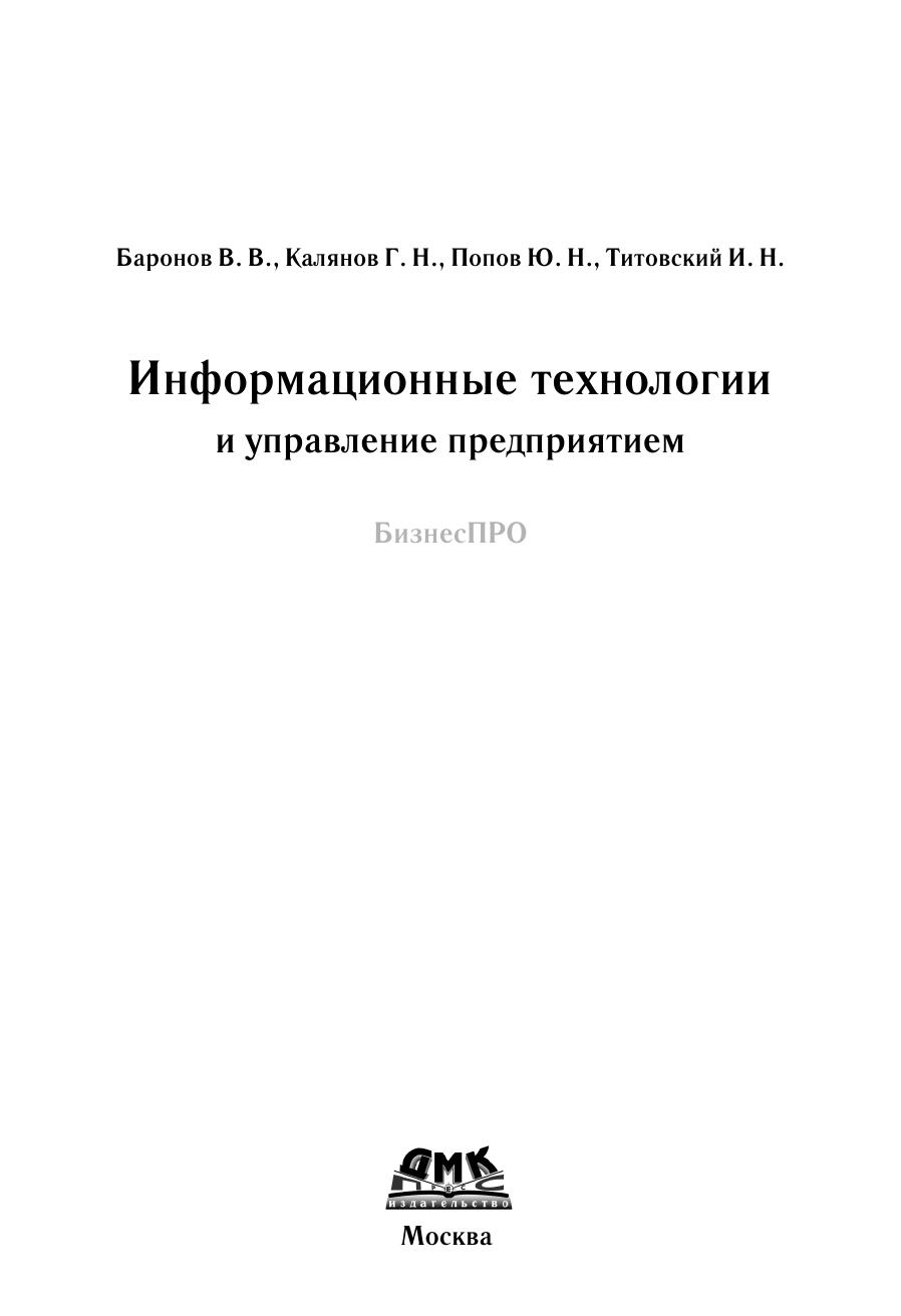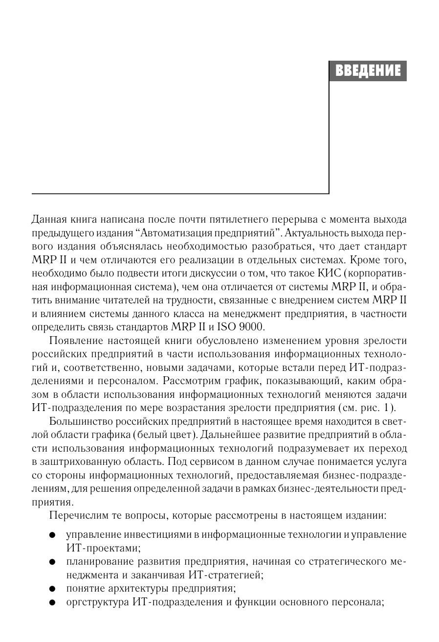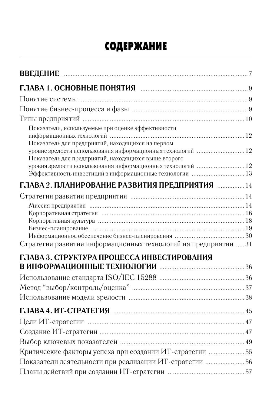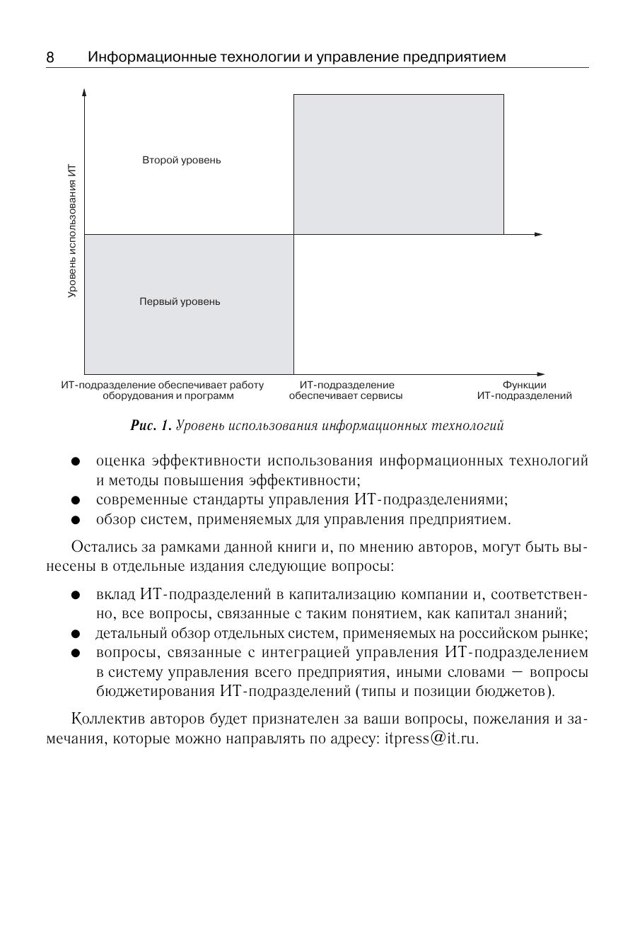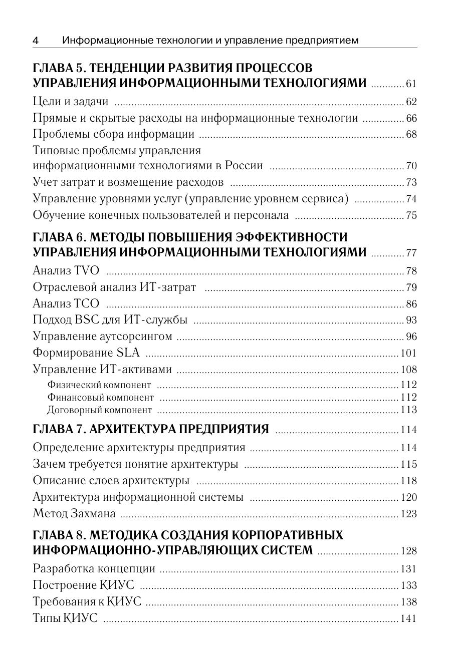 Появление настоящего издания обусловлено изменением уровня зрелости российских предприятий в части использования информационных технологий и теми задачами, которые приходится решать руководителям предприятий, менеджерам высшего и среднего уровня, работающим в области ИТ. В книге подробно рассмотрены такие вопросы, как инвестиции в информационные технологии, разработка ИТ-стратегии, управление ИТ-проектами, формирование организационной структуры IТ-подразделения и функции персонала. Методы оценки эффективности использования ИТ позволят выявить достоинства существующей и внедряемой информационной системы, найти пути повышения производительности. В книге также представлен обзор систем, применяемых для управления предприятием, таких как системы управления ресурсами предприятий (MRP/ERP), системы управления взаимоотношениями с клиентами (CRM), системы управления цепочками поставок (SCM), нформационно-аналитические системы, автоматизированные системы управления персоналом и документооборотом.