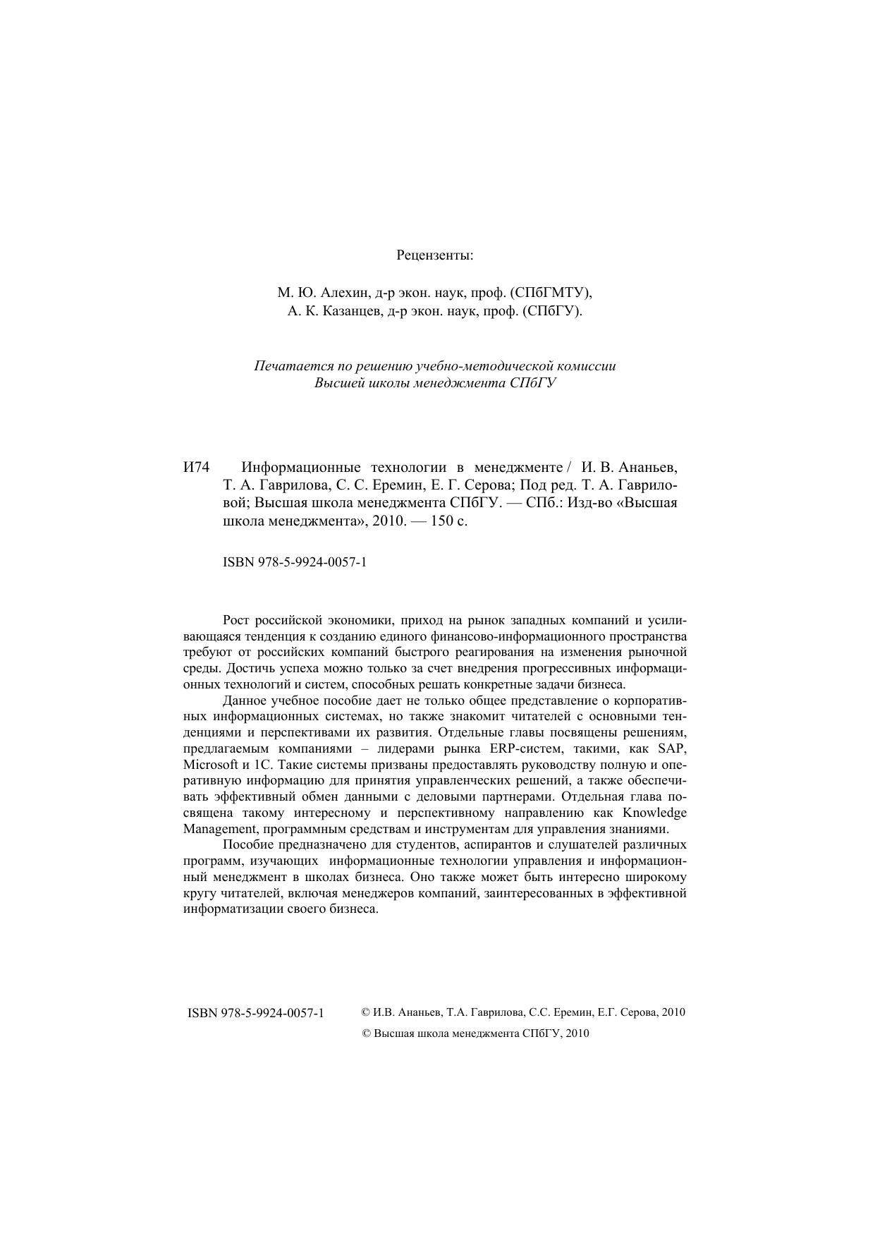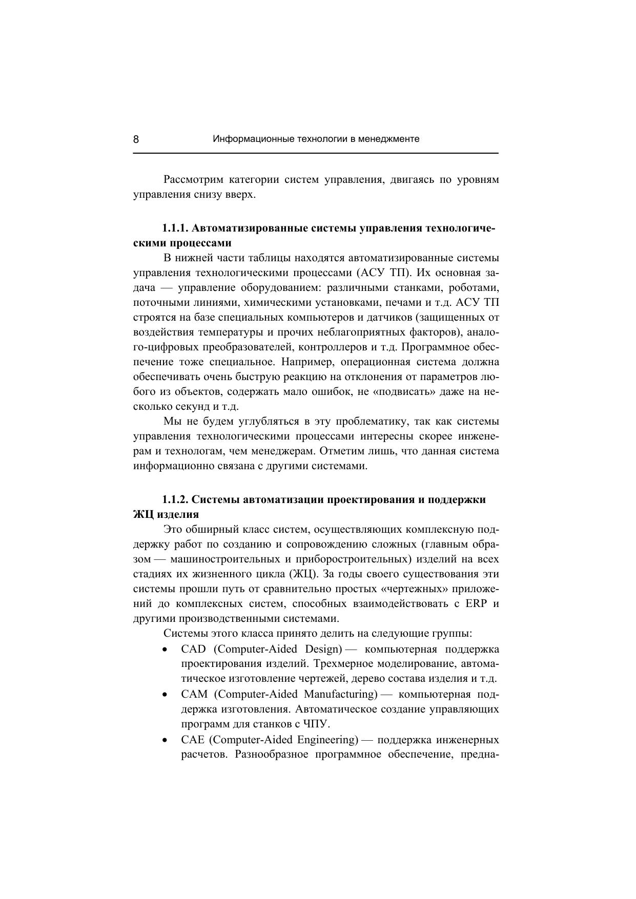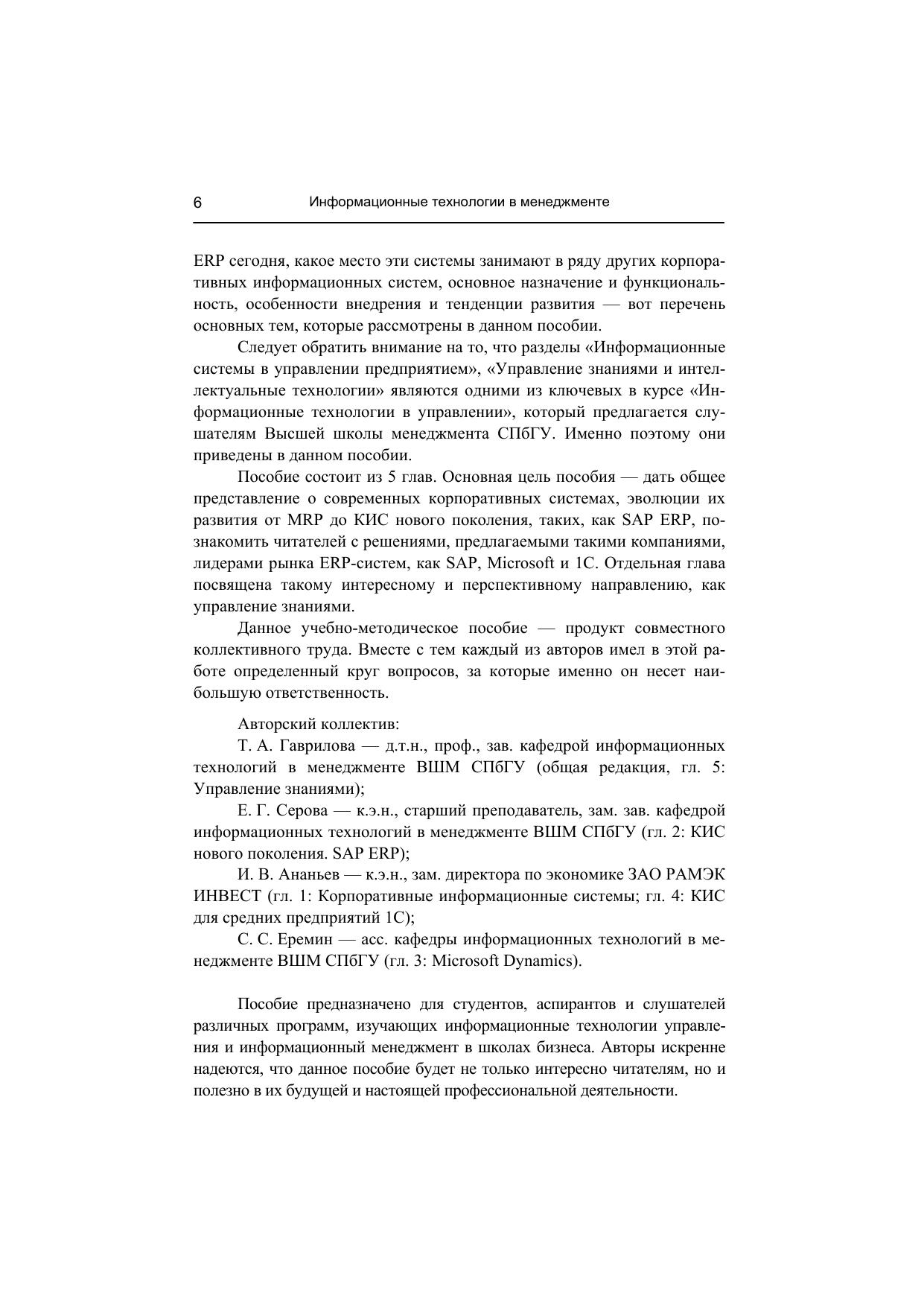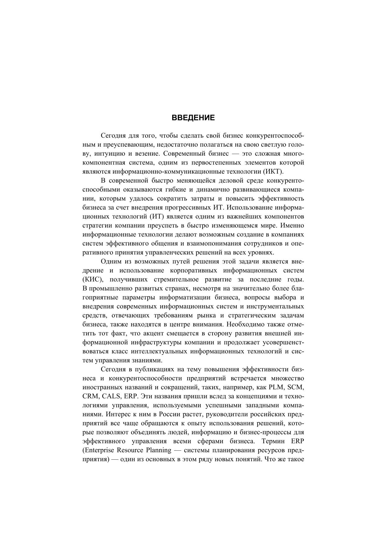 Рост российской экономики, приход на рынок западных компаний и усиливающаяся тенденция к созданию единого финансово-информационного пространства требуют от российских компаний быстрого реагирования на изменения рыночной среды. Достичь успеха можно только за счет внедрения прогрессивных информационных технологий и систем, способных решать конкретные задачи бизнеса.Данное учебное пособие дает не только общее представление о корпоративных информационных системах, но также знакомит читателей с основными тенденциями и перспективами их развития. Отдельные главы посвящены решениям, предлагаемым компаниями – лидерами рынка ERP-систем, такими, как SAP, Microsoft и 1С. Отдельная глава посвящена Knowledge Management, программным средствам и инструментам для управления знаниями.Пособие предназначено для студентов, аспирантов и слушателей различных программ, изучающих информационные технологии управления и информационный менеджмент в школах бизнеса. Оно также может быть интересно широкому кругу читателей, включая менеджеров компаний, заинтересованных в эффективной информатизации своего бизнеса.