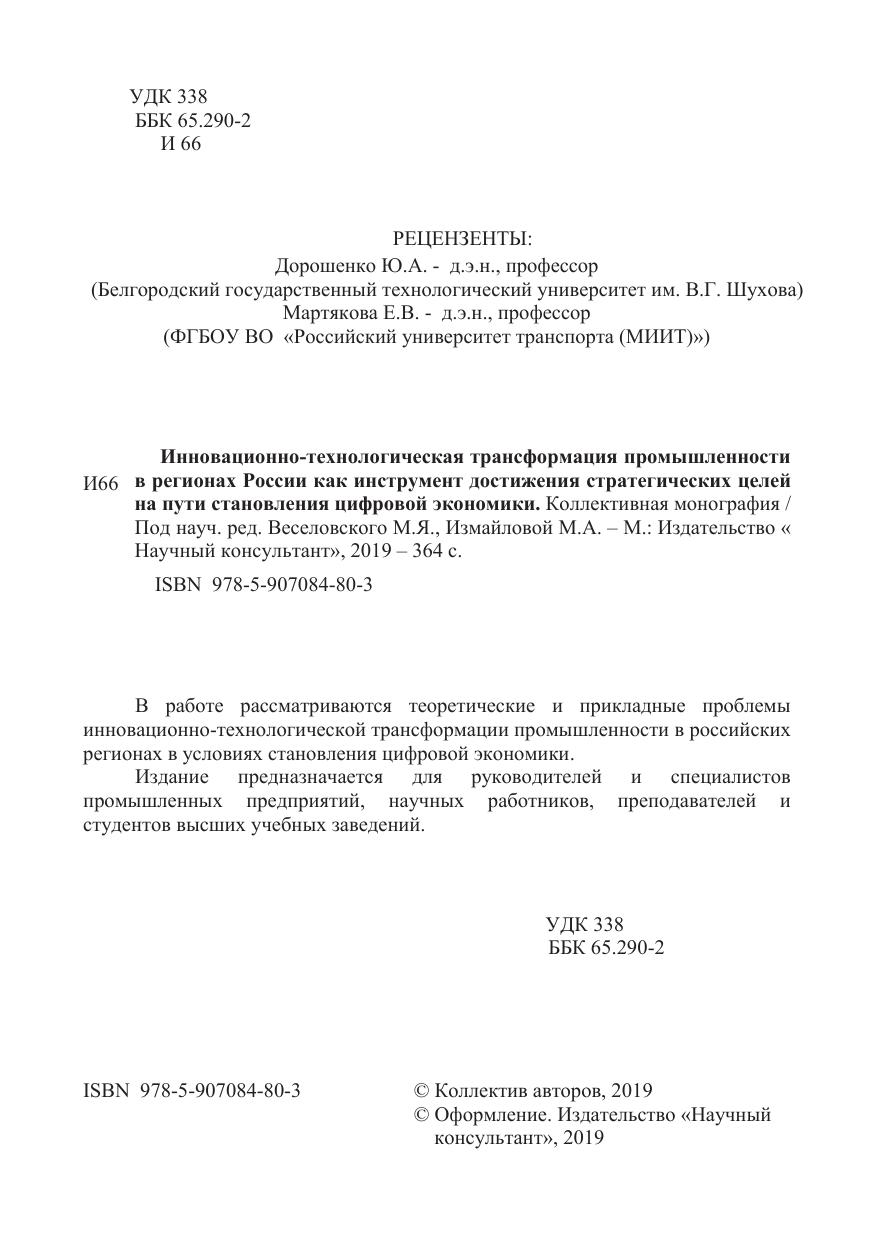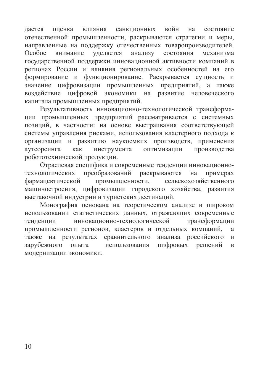 В работе рассматриваются теоретические и прикладные проблемы инновационно-технологической трансформации промышленности в российских регионах в условиях становления цифровой экономики. Издание предназначается для руководителей и специалистов промышленных предприятий, научных работников, преподавателей и студентов высших учебных заведений